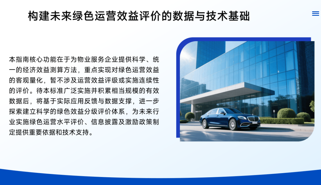 三、 迈向“碳值创造”新维度:《指南》的深远影响与应用展望《建筑绿色运营经济效益测算指南》的出台,其意义远超一本技术文件。它所带来的,是整个行业认知与游戏规则的变革。?对于物业服务企业:它是一本“价值发现指南”和“行动路线图”。企业可以据此精准定位能效短板,挖掘新的效益增长点,并将量化结果向业主、租户和社会展示,极大提升专业形象和市场竞争力。?对于行业监管与政策制定:它为建立基于数据的行业能效排行榜、绿色金融认证、碳普惠机制等提供了可靠的技术依据,助力形成“良币驱逐劣币”的健康市场环境。?对于城市低碳发展:通过激励数以万计的民用建筑迈向绿色运营,将汇聚成城市减排的巨大合力,为深圳乃至大湾区的“双碳”目标实现提供坚实支撑。