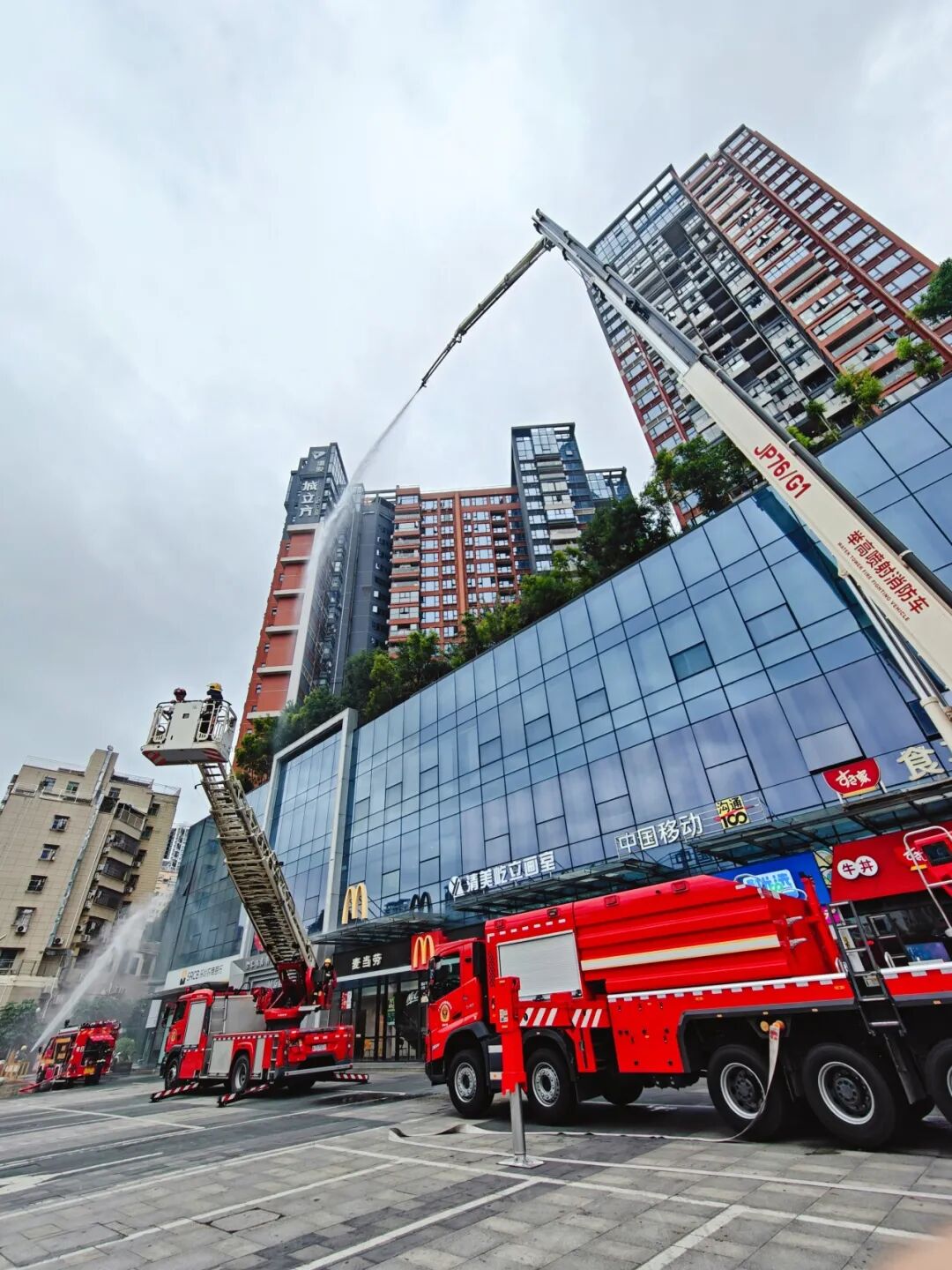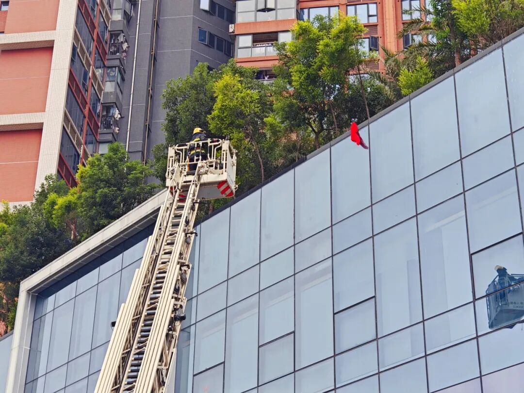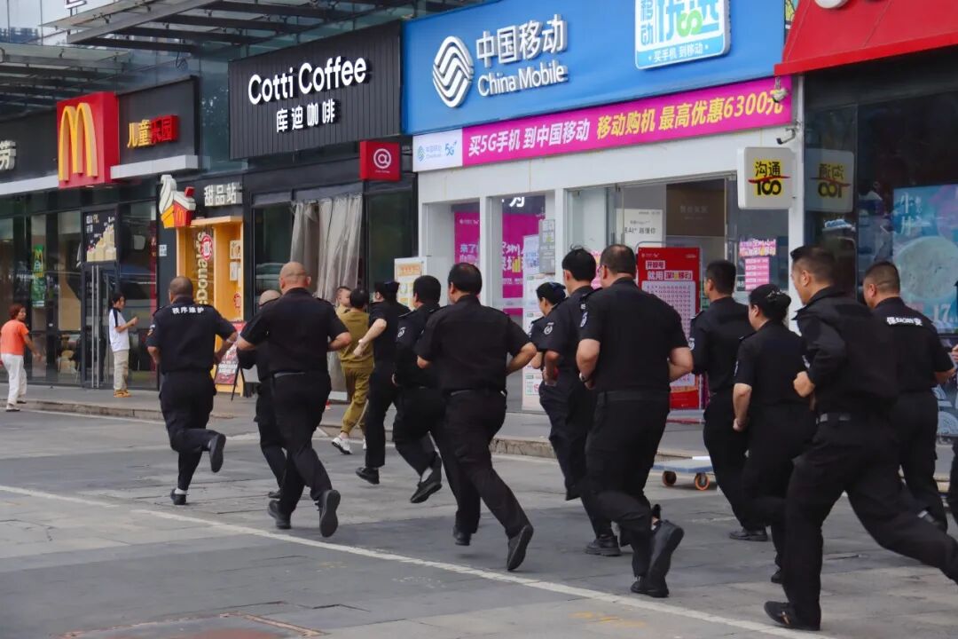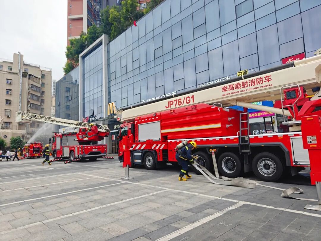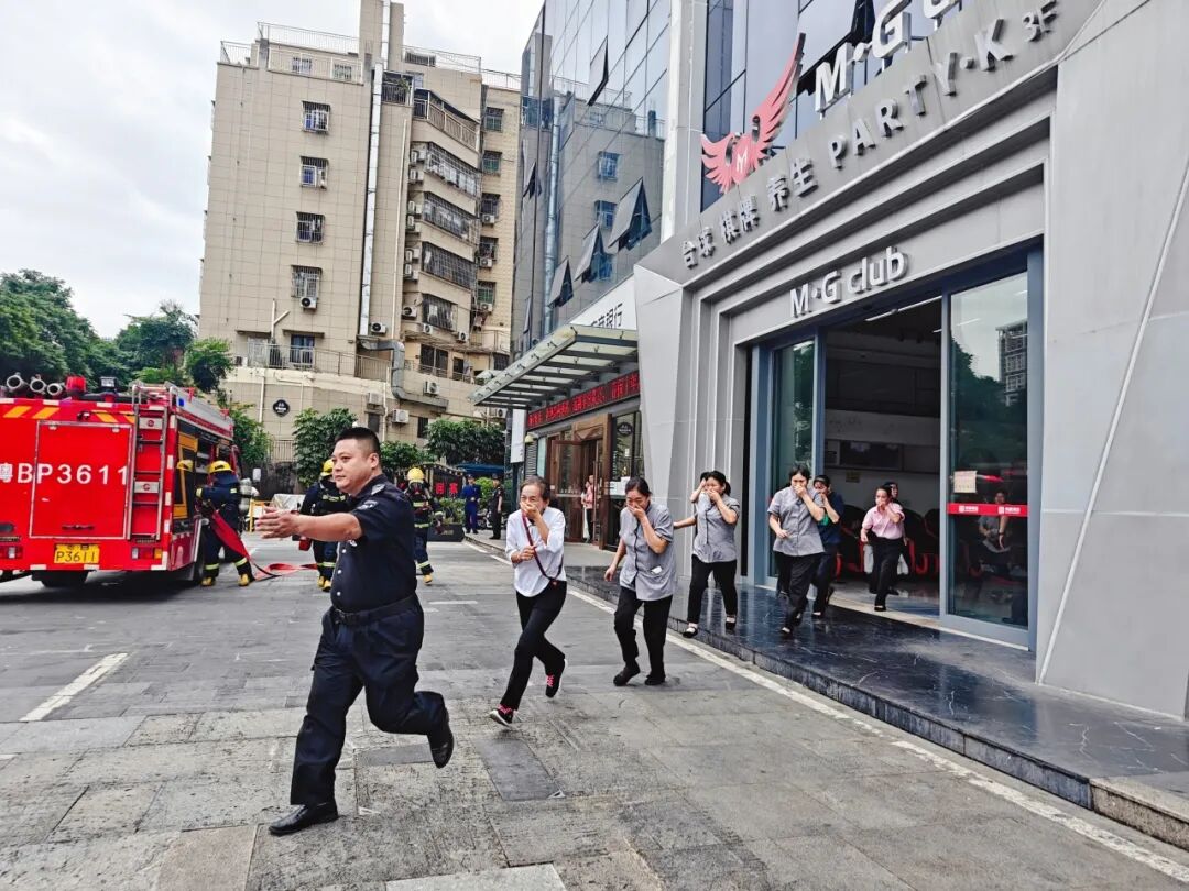 启动仪式后,一场由美鹏物业主导前期处置的消防应急演练成为全场焦点。演练模拟了城立方项目架空层内因电动自行车电池违规充电引发火灾的惊险场景。