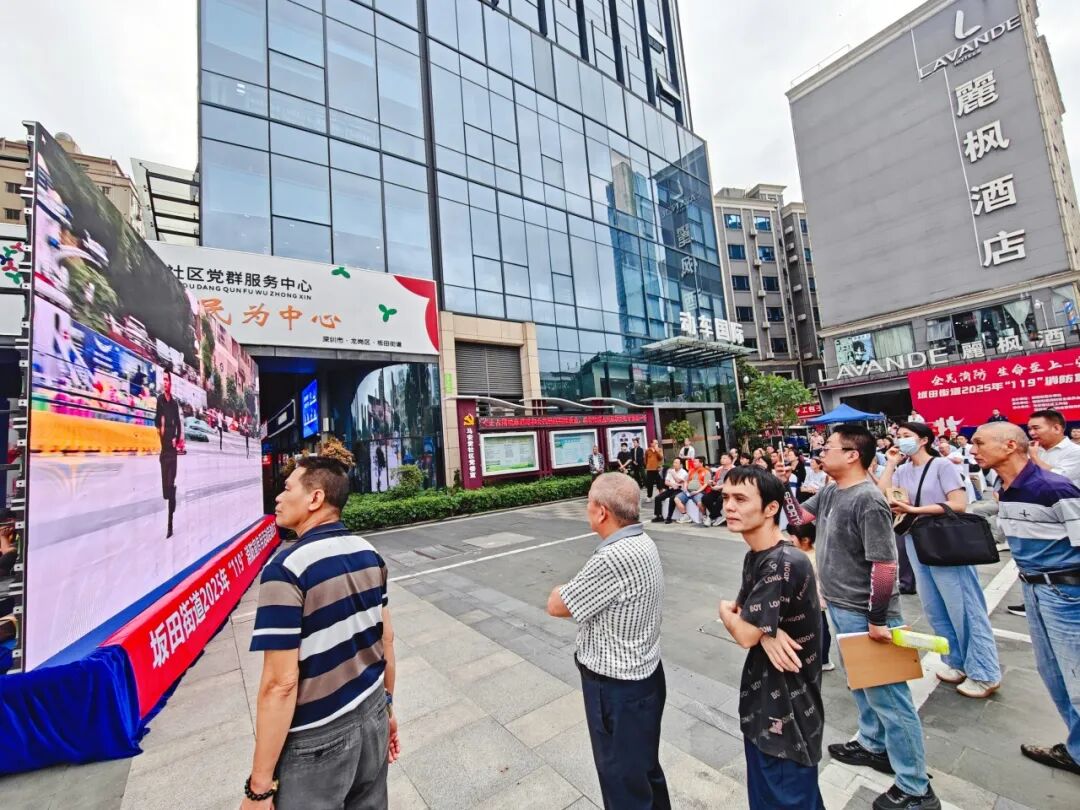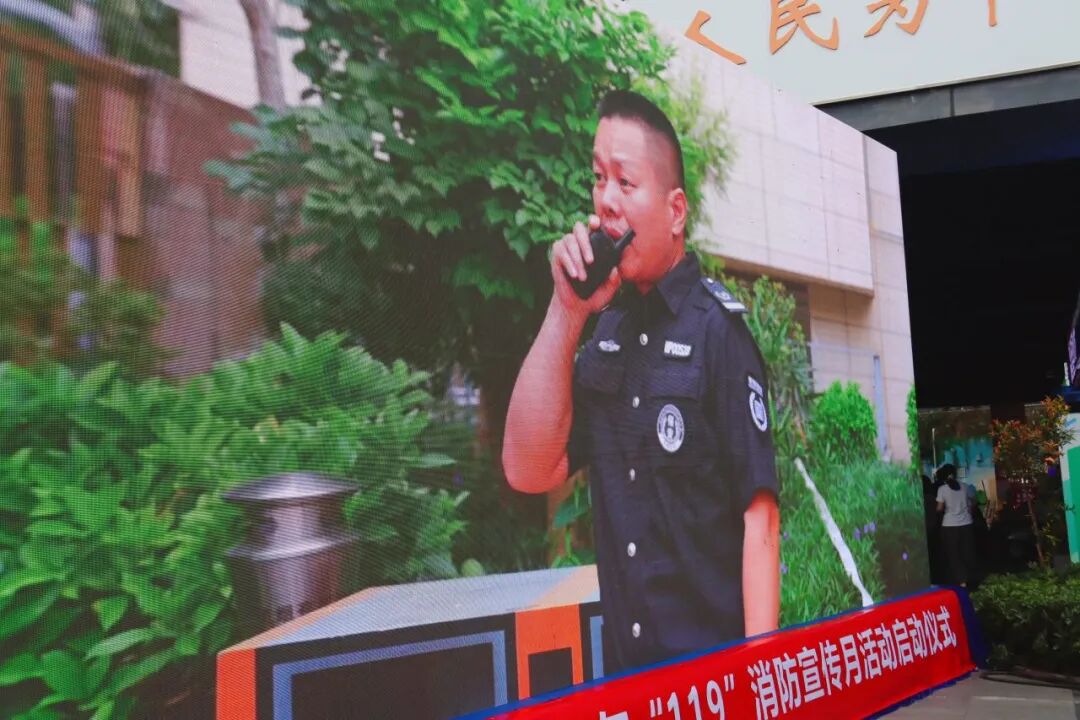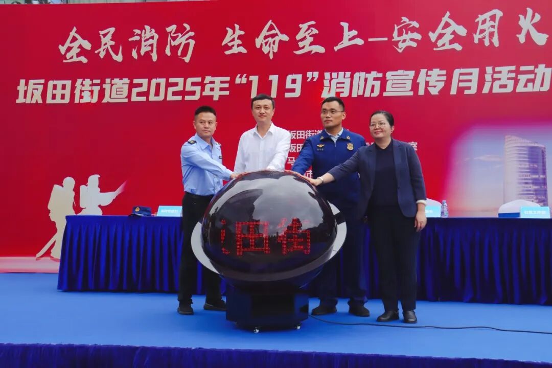 随后,仪式进入关键环节。在全体与会者的共同见证下,坂田街道办事处副主任刘洋、应急办主任余宁、坂田消防救援站政治指导员宋加振、马安堂社区党委书记万丽霞一同按下启动球。随着大屏亮起"119"消防宣传月主题画面,本年度系列宣传教育活动正式全面启动。