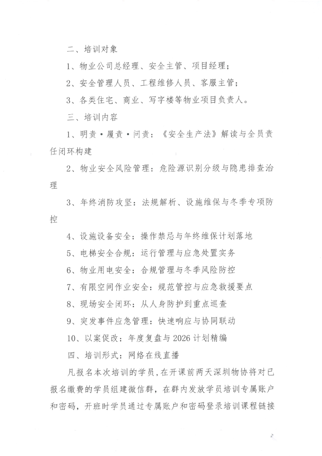 随着冬季来临,物业项目面临用电负荷高、消防隐患多、设备运行压力大等多重挑战。同时,安全管理进入“收口与开局”关键窗口:既要完成年度复盘与隐患清零,也要布好新一年目标与资源配置。现实中,仍存在责任链条不闭环、风险辨识不系统、台账证照不规范、预案演练不落地、协同联动不顺畅等痛点。为此,深圳物协携手中物教育推出,以“年终复盘+冬季防控+开年规划”为主线的系统化实战培训,帮助物业企业打通从“责任到流程、从检查到整改、从预案到演练”的管理闭环,落实隐患清零。 为此深圳物协携手中物教育推出《筑牢安全底线,淬炼硬核能力!——物业安全生产隐患“清零风暴”》专题培训班,邀请多位物业行业资深专家,通过10天直播课程深度讲解,10天直播授课,串联全周期管理,本次培训将系统介绍物业安全生产相关法律法规、风险识别、消防、用电、电梯、有限空间作业、设施设备管理、人身安全防护、应急管理及典型案件剖析等内容,结合年终复盘与来年规划,全面提升物业管理人员的安全意识、风险防控能力和应急处置水平,助力企业构建长效安全管理机制。 通过本次培训,学员将掌握:1、合规到位:深入理解《安全生产法》及行业标准,确保管理行为合法合规;2、风险识别:掌握系统化的风险排查方法,做到“早发现、早预警、早处置”;3、流程提效:学习标准化操作规范与台账管理技巧,提升管理效率;4、应急升级:通过案例教学与模拟演练,提高突发事件应对水平;5、团队协同:加强多部门联动机制建设,形成全员参与的安全文化氛围;6、计划落地:完成年度复盘与下一年度安全计划制定,实现持续改进。 2025年12月5日-12月14日(共10讲,每讲1.5小时),每天晚上19:30—21:00(10节课+两节考试,共12节课)。 1、明责·履责·问责:《安全生产法》解读与全员责任闭环构建 2、物业安全风险管理:危险源识别分级与隐患排查治理 3、年终消防攻坚:法规解析、设施维保与冬季专项防控 凡报名本次培训的学员,在开课前两天深圳物协将对已报名缴费的学员组建微信群,在群内发放学员培训专属账户和密码,开班时学员通过专属账户和密码登录培训课程链接进行在线学习(培训链接以及操作流程在已缴费学员微信群内下发)。 学员在网络学习过程中,因工作或生活等原因未能及时在线学习的,在课程学习期内可随时通过课程视频回看进行学习。 1、会员企业588元/人;企业报名6-10人的(含10人)优惠至488元/人;11人及以上的优惠至388元/人。 1、扫下方二维码,按要求填写报名人员信息,多人报名的,请多次填写提交;(注:报名10人以上的可联系工作人员发送报名表填写反馈,无须扫码报名)