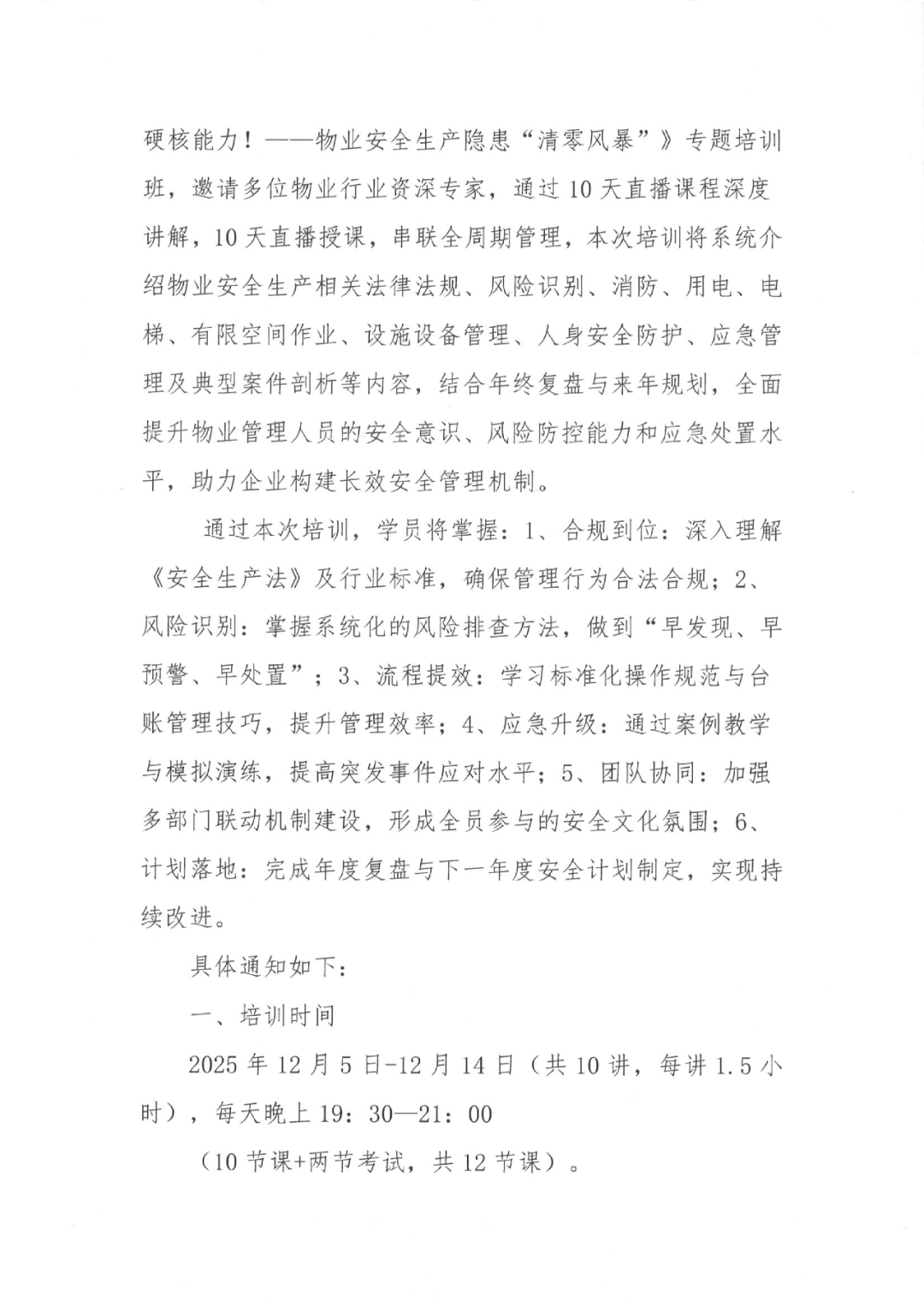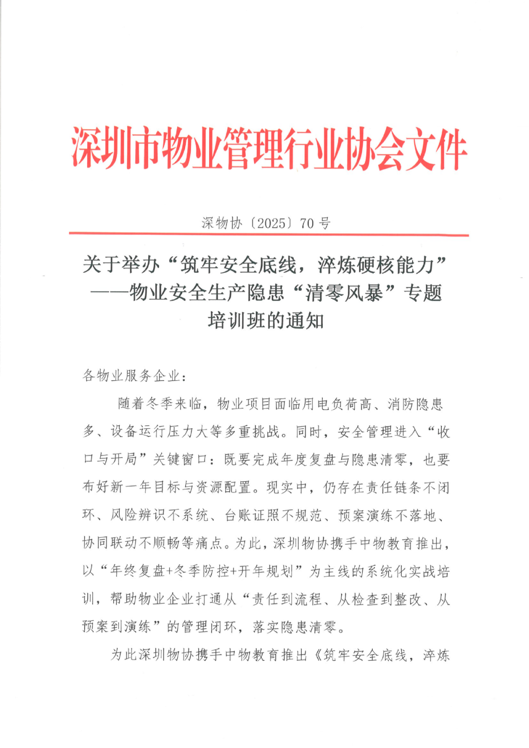 关于举办“筑牢安全底线,淬炼硬核能力”——物业安全生产隐患“清零风暴”专题培训班的通知