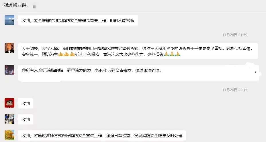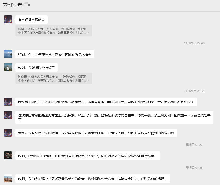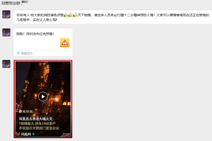 11月消防安全月期间,冠懋物业所辖全部项目已扎实完成消防实战演练,以“演”筑防、以练备战,牢牢守住安全工作的基础防线。而26日香港大埔宏福苑五级火灾的揪心消息,让这份未雨绸缪的准备更显沉甸甸的意义——超高层建筑外墙火势蔓延之迅猛、伤亡损失之惨重,既令人痛心疾首,更向全行业敲响了超高层建筑消防安全的振聋发聩警钟。