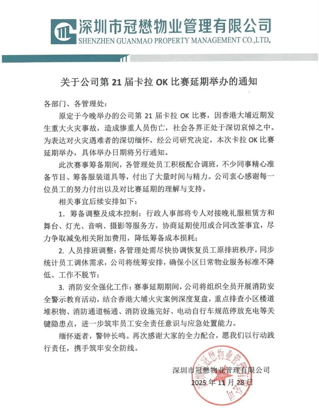 “险情就是命令,安全重于一切。” 为全力筑牢消防安全防线,冠懋物业经过审慎考量,果断暂停了原定于11月28日举办的第21届卡拉OK比赛。此次赛事筹备历时良久,从流程策划到场地布置均已就绪,参赛选手们更是提前协调好工作班次。但面对严峻的消防安全形势,我们坚定秉持“安全第一”的原则,唯有守住安全底线,才能为后续各类活动的顺利开展奠定坚实基础。这既是对全体业主和员工生命财产安全的高度负责,更是冠懋物业践行安全使命的生动诠释。