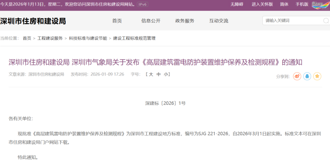 近日,深圳市住房和建设局与深圳市气象局联合发布深圳市工程建设地方标准《高层建筑雷电防护装置维护保养及检测规程》,该标准将于今年3月1日实施,为深圳已建成投入使用的高层建筑雷电防护工作提供全面、规范的技术依据,助力物业管理行业提升防雷安全管理水平。