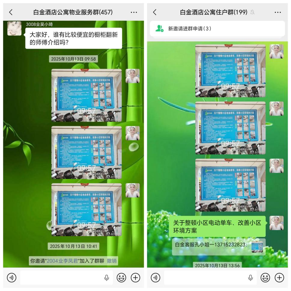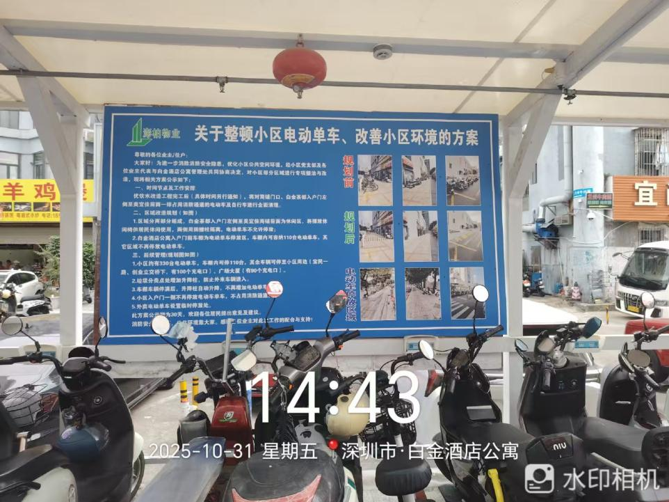 电动单车乱停乱放、堵塞消防通道、充电无序等问题,是住宅小区管理的痛点难点,更是影响居民居住安全与环境品质的关键隐患。2025年,澎柏物业白金酒店公寓物业团队聚焦小区电动单车管理难题,坚持安全为先、疏堵结合、便民利民原则,多措并举开展专项整治行动,有效破解管理困局,全面提升小区居住环境与安全水平,赢得业主广泛理解与积极配合,现将整治工作成效汇报如下: