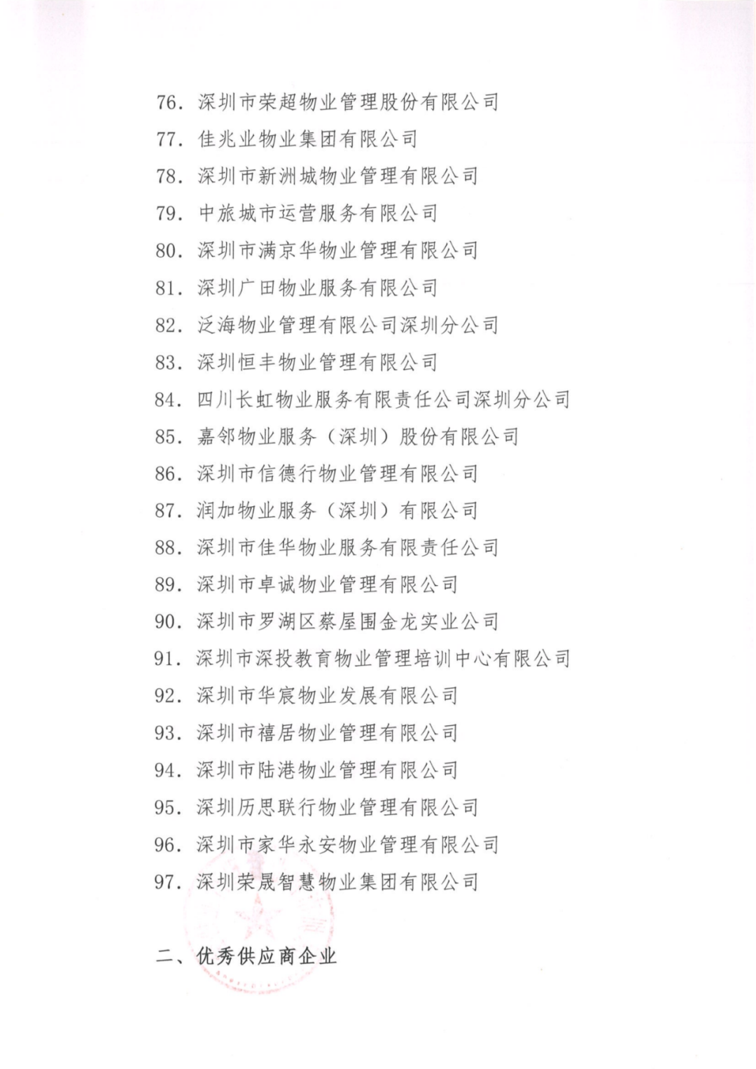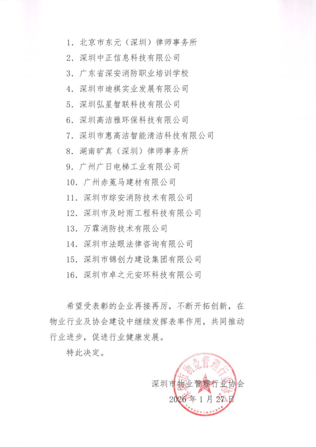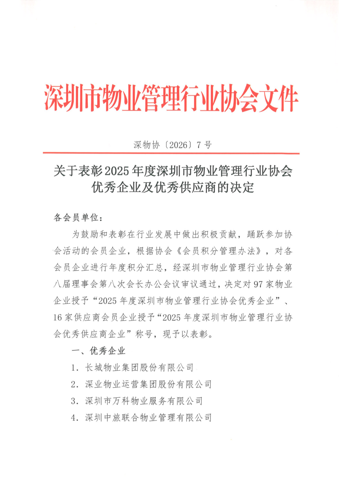 为鼓励和表彰在行业发展中做出积极贡献,踊跃参加协会活动的会员企业,根据协会《会员积分管理办法》,对各会员企业进行年度积分汇总,经深圳市物业管理行业协会第八届理事会第八次会长办公会议审议通过,决定对97家物业企业授予“2025年度深圳市物业管理行业协会优秀企业”、16家供应商会员企业授予“2025年度深圳市物业管理行业协会优秀供应商企业”称号,现予以表彰。 希望受表彰的企业再接再厉,不断开拓创新,在物业行业及协会建设中继续发挥表率作用,共同推动行业进步,促进行业健康发展。通知原文如下: