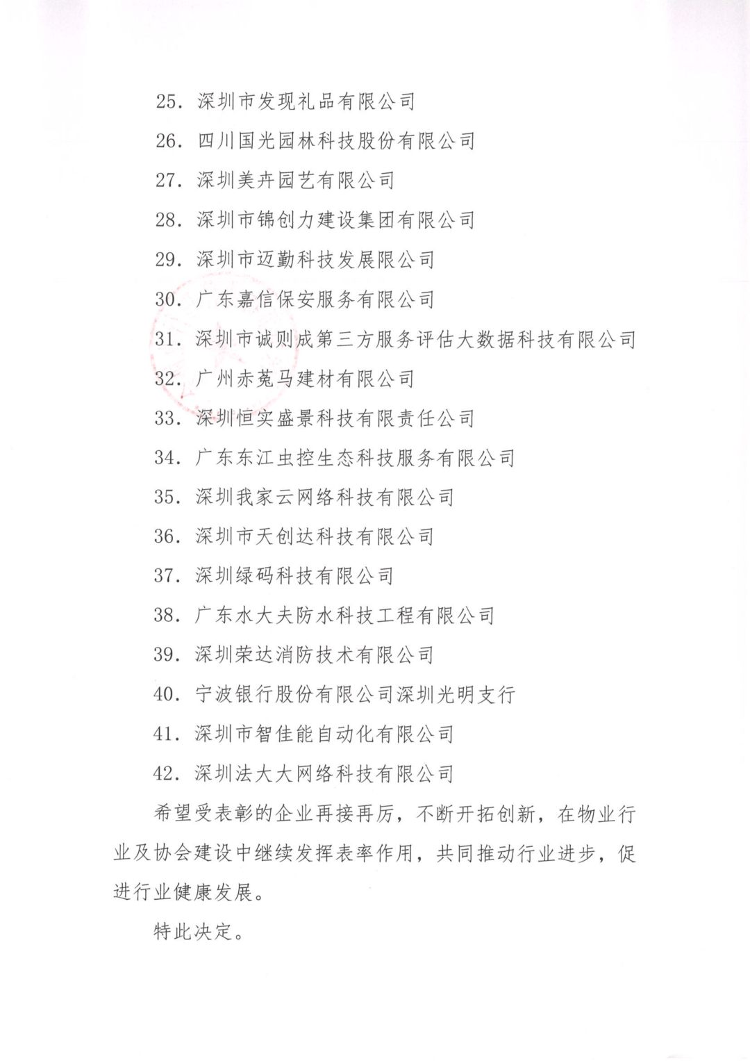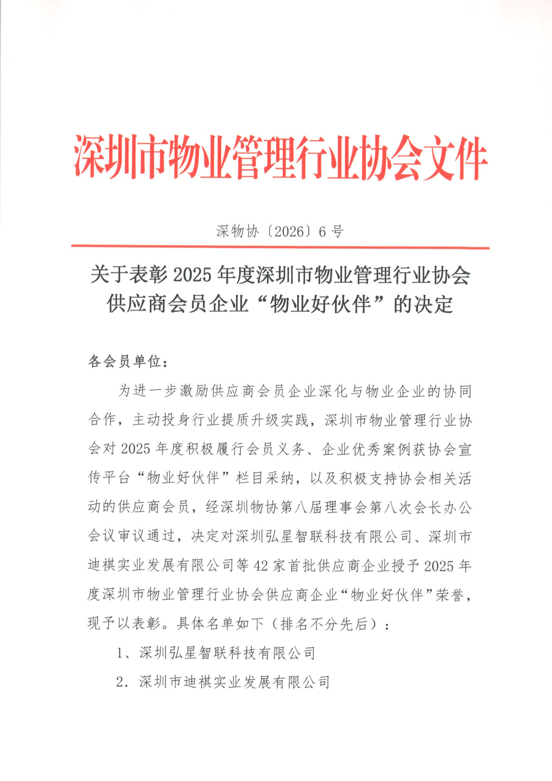关于表彰2025年度深圳市物业管理行业协会供应商会员企业“物业好伙伴”的决定