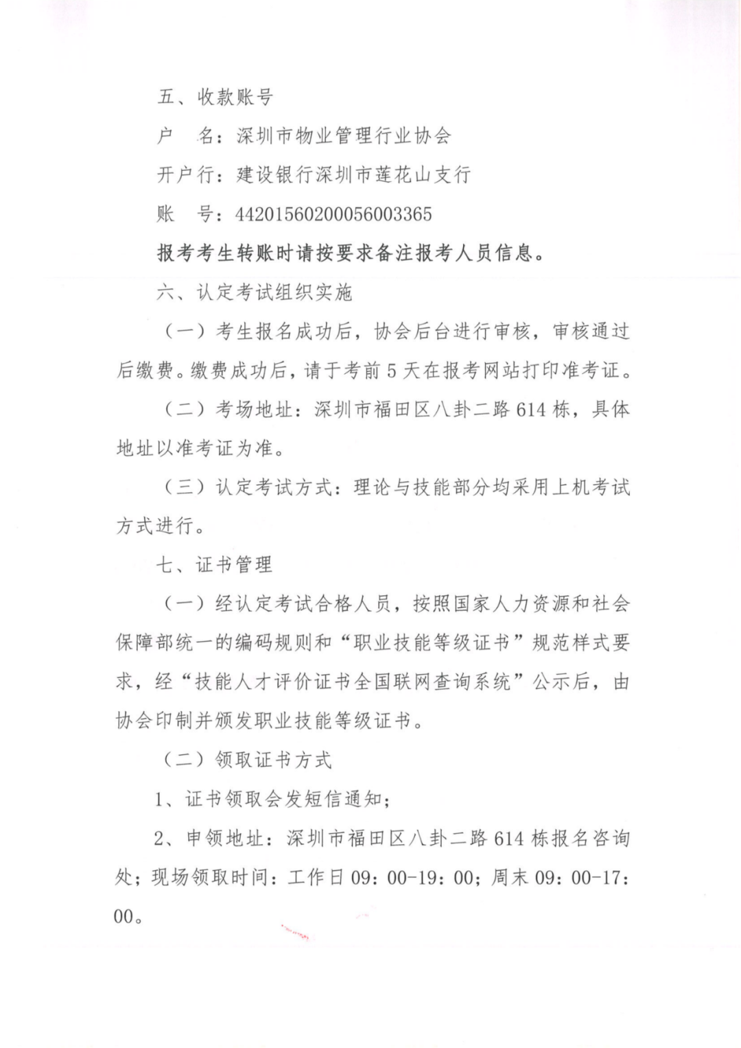 (一)考生报名成功后,协会后台进行审核,审核通过后缴费。缴费成功后,请于考前5天在报考网站打印准考证。 (二)考场地址:深圳市福田区八卦二路614栋,具体地址以准考证为准。 (三)认定考试方式:理论与技能部分均采用上机考试方式进行。 (一)经认定考试合格人员,按照国家人力资源和社会保障部统一的编码规则和“职业技能等级证书”规范样式要求,经“技能人才评价证书全国联网查询系统”公示后,由协会印制并颁发职业技能等级证书。 2、申领地址:深圳市福田区八卦二路614栋报名咨询处;现场领取时间:工作日09:00-19:00;周末09:00-17:00。 电话:25922851、83325849、19065138929通知原文如下: