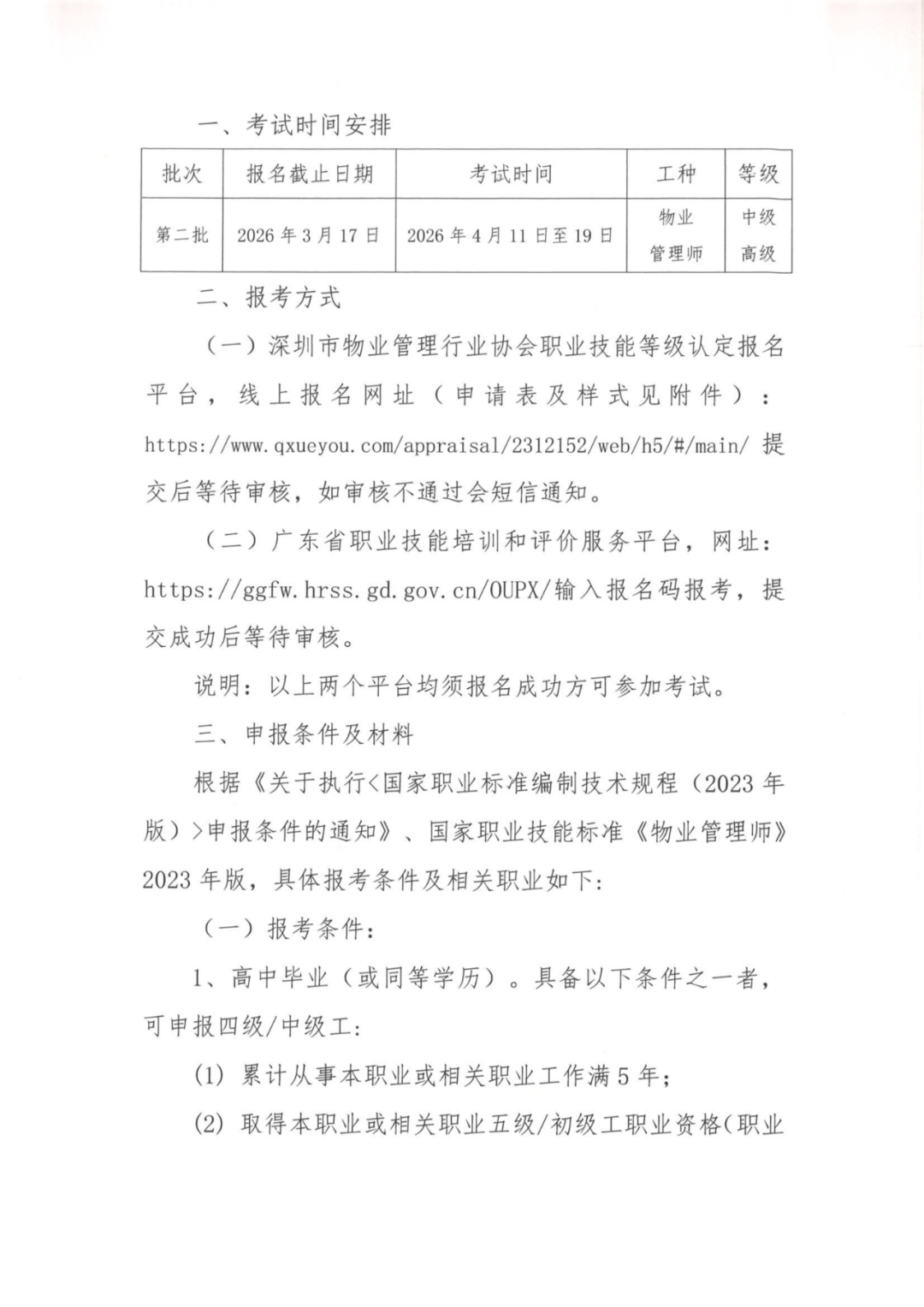 关于开展2026年深圳市物业管理师(中、高级)第二批职业技能等级认定工作的通知