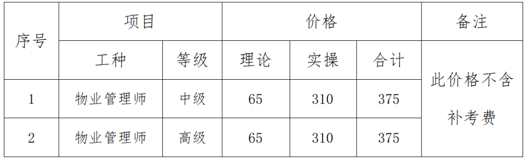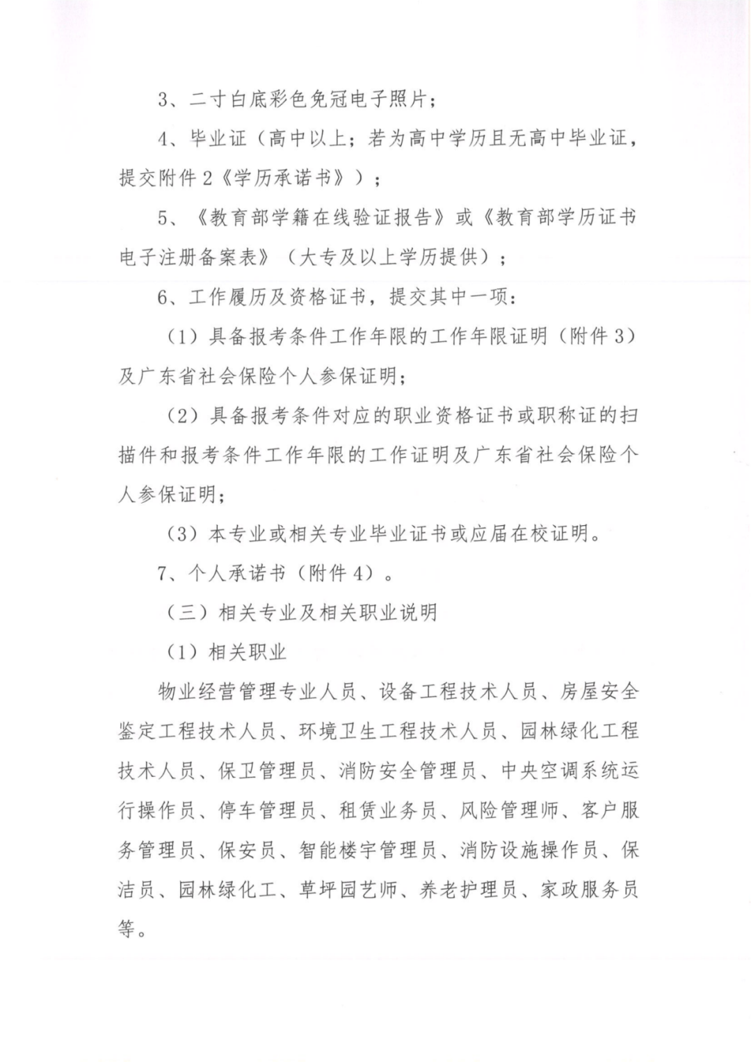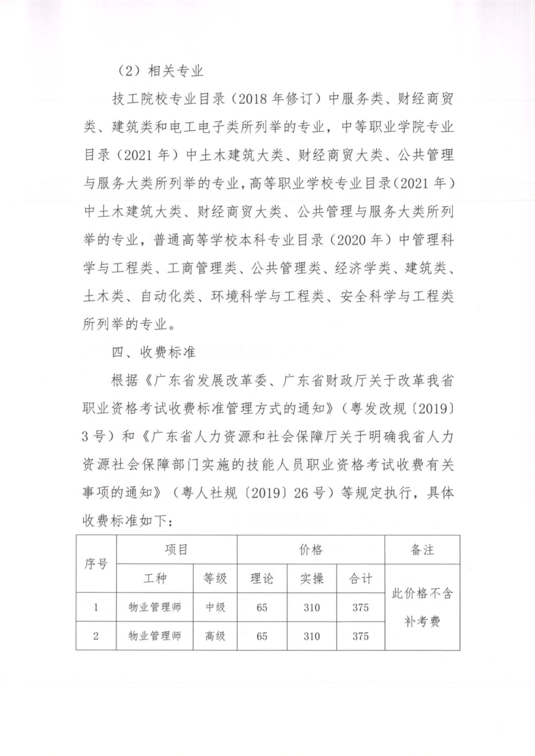 本专业或相关专业毕业证书(含在读应届毕业生); (6)取得经评估论证的高等职业学校、专科及以上普通高等学校本专业或相关专业的毕业证书(含在读应届毕业生)。 4、毕业证(高中以上;若为高中学历且无高中毕业证,提交附件2《学历承诺书》); 5、《教育部学籍在线验证报告》或《教育部学历证书电子注册备案表》(大专及以上学历提供); (1)具备报考条件工作年限的工作年限证明(附件3)及广东省社会保险个人参保证明; (2)具备报考条件对应的职业资格证书或职称证的扫描件和报考条件工作年限的工作证明及广东省社会保险个人参保证明; 物业经营管理专业人员、设备工程技术人员、房屋安全鉴定工程技术人员、环境卫生工程技术人员、园林绿化工程技术人员、保卫管理员、消防安全管理员、中央空调系统运行操作员、停车管理员、租赁业务员、风险管理师、客户服务管理员、保安员、智能楼宇管理员、消防设施操作员、保洁员、园林绿化工、草坪园艺师、养老护理员、家政服务员等。 技工院校专业目录(2018年修订)中服务类、财经商贸类、建筑类和电工电子类所列举的专业,中等职业学院专业目录(2021年)中土木建筑大类、财经商贸大类、公共管理与服务大类所列举的专业,高等职业学校专业目录(2021年)中土木建筑大类、财经商贸大类、公共管理与服务大类所列举的专业,普通高等学校本科专业目录(2020年)中管理科学与工程类、工商管理类、公共管理类、经济学类、建筑类、土木类、自动化类、环境科学与工程类、安全科学与工程类所列举的专业。 根据《广东省发展改革委、广东省财政厅关于改革我省职业资格考试收费标准管理方式的通知》(粤发改规〔2019〕3号)和《广东省人力资源和社会保障厅关于明确我省人力资源社会保障部门实施的技能人员职业资格考试收费有关事项的通知》(粤人社规〔2019〕26号)等规定执行,具体收费标准如下: