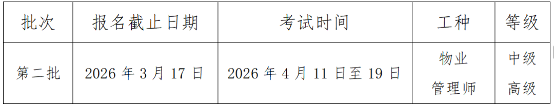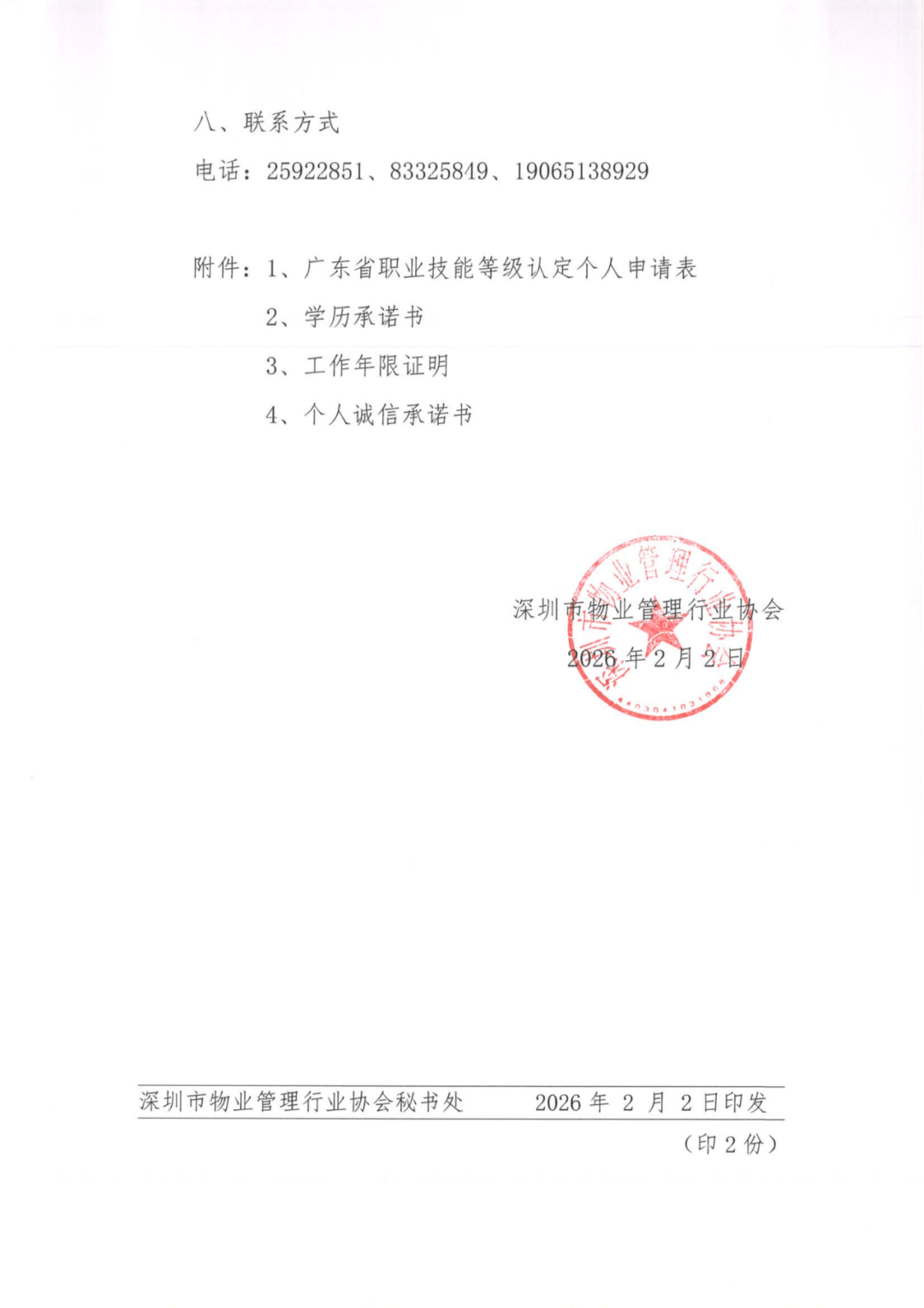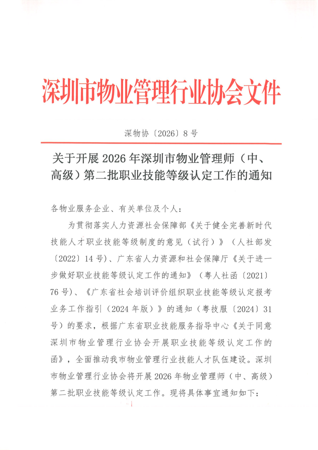 为贯彻落实人力资源社会保障部《关于健全完善新时代技能人才职业技能等级制度的意见(试行)》(人社部发〔2022〕14号)、广东省人力资源和社会保障厅《关于进一步做好职业技能等级认定工作的通知》(粤人社函〔2021〕76号)、《广东省社会培训评价组织职业技能等级认定报考业务工作指引(2024年版)》的通知(粤技服〔2024〕31号)的要求,根据广东省职业技能服务指导中心《关于同意深圳市物业管理行业协会开展职业技能等级认定工作的函》,全面推动我市物业管理行业技能人才队伍建设。深圳市物业管理行业协会将开展2026年物业管理师(中、高级)第二批职业技能等级认定工作。现将具体事宜通知如下: