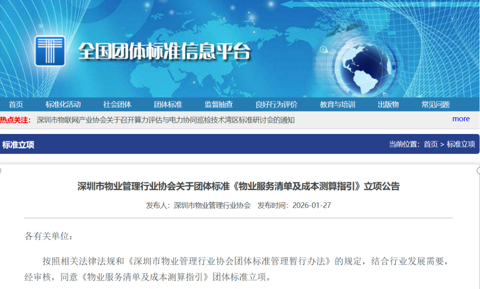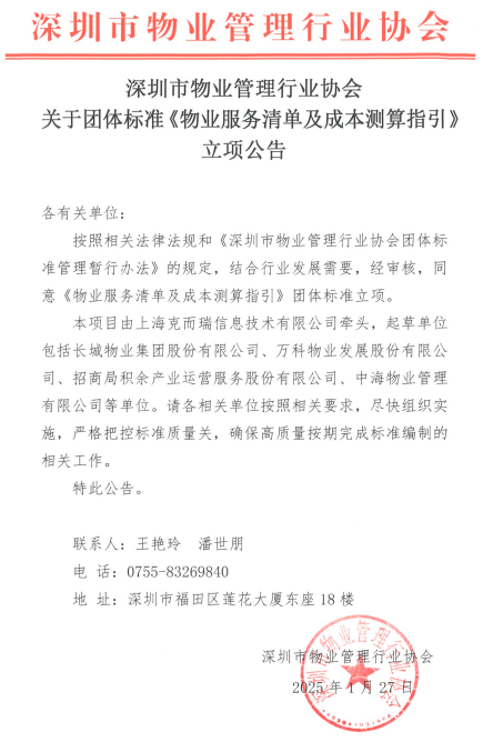 本次立项的《物业服务清单及成本测算指引》团体标准,核心价值在于系统性破解物业服务“内容模糊、成本不清”的行业痛点,为行业发展注入新动能,其作用集中体现在三大方面:一是明确服务边界,制定详尽的物业服务清单,对共用部位设备设施管理、环境养护等各类服务内容进行系统分类与细化描述,明确作业对象、频次要求,为服务约定、检验、评价提供标准化服务依据,有效减少因服务认知偏差引发的业主与物业纠纷。二是透明成本构成,构建科学合理的成本测算模型,综合考量物业服务人力成本、物料价格、能耗水平、设备折旧等核心因素,为各项服务的标准成本测算提供指引。该模型将成为物业企业成本核算、业主与物业协商费用、相关部门开展评估指导的重要参考,推动价格形成更趋理性、公正。三是推动行业升级,通过标准化清单与测算指引的推行,实现服务内容公开化、成本构成透明化,既保障业主的知情权与监督权,引导“质价相符”的消费理念,也驱动物业企业从粗放式管理向精细化、精益化运营转型,优化资源配置、补齐管理短板,全面提升行业专业价值与服务效能。下一步,协会将严格遵循《团体标准管理规定》及协会团体标准管理办法,广泛征集行业各方意见,深入开展研究编写工作,有序完成征求意见、技术审查、报批发布等全流程,确保标准兼具科学性、适用性与可操作性。未来,随着标准的落地实施,将进一步完善深圳物业管理市场价格机制,推动行业高质量发展,更好地兼顾业主权益与企业可持续运营,实现多方共赢。