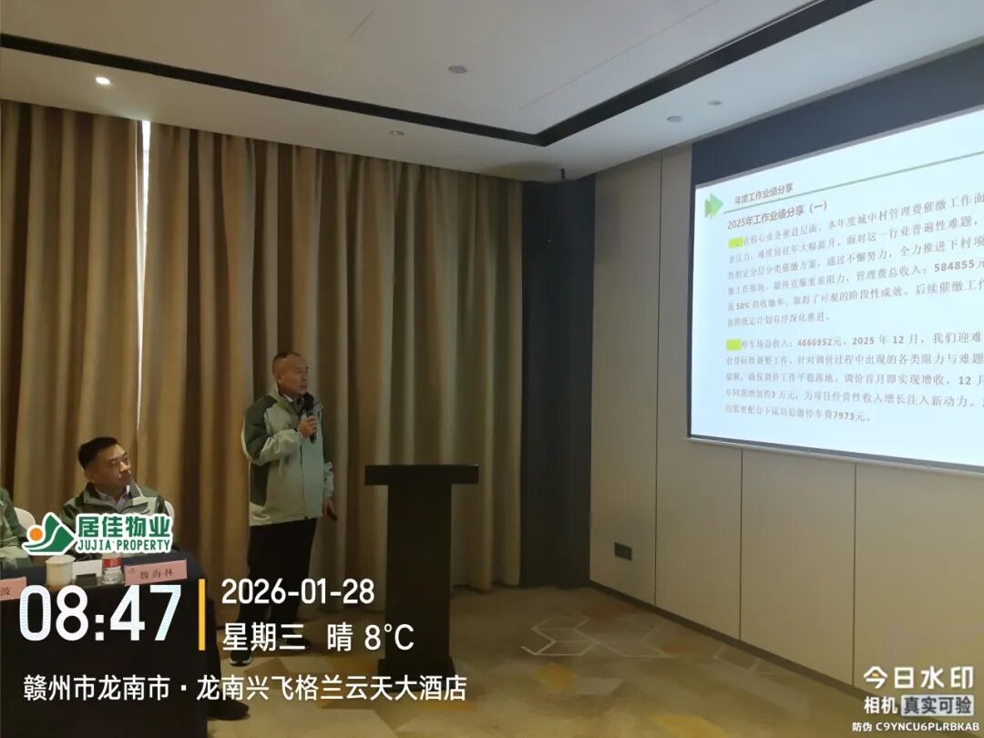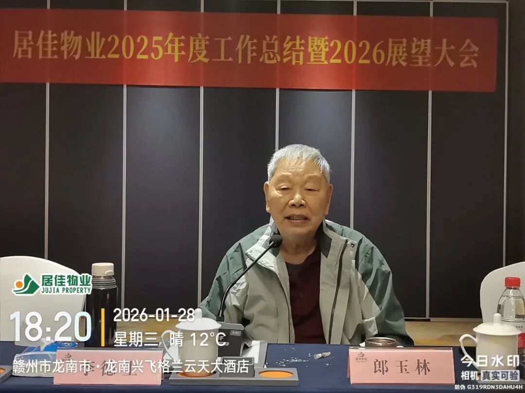 大会第七项,副董事长郎总作讲话,回顾公司 2025 年的奋斗征程,对 2026 年发展新篇章进行展望。郎总对各项目、职能中心的工作汇报予以充分肯定,高度赞扬总经理的讲话高屋建瓴、主题鲜明、立意深远,为公司新一年发展指明了方向。郎总要求,新的一年经营班子要切实抓好各项工作的贯彻落实,凝聚全体员工的向心力与战斗力,展现居佳人的责任与担当。同时,郎总围绕公司 “以诚为宗、以人为本” 的核心宗旨,深入阐释公司企魂 —— 勤于学习、诚于待人、勇于承担、严于自律、善于创新、乐于奉献、恒于修身的内涵与要义,同时引导全体员工领会董事长二十周年口号 “咬定青山不放松” 的战略深意。鼓励管理者精通规则,善于肯定下属、以身作则、推功揽过,强化领导意识、善于倾听不同声音,沉淀人格魅力。勉励全体员工坚守初心、践行使命,以坚定的信念、昂扬的姿态推动公司发展。