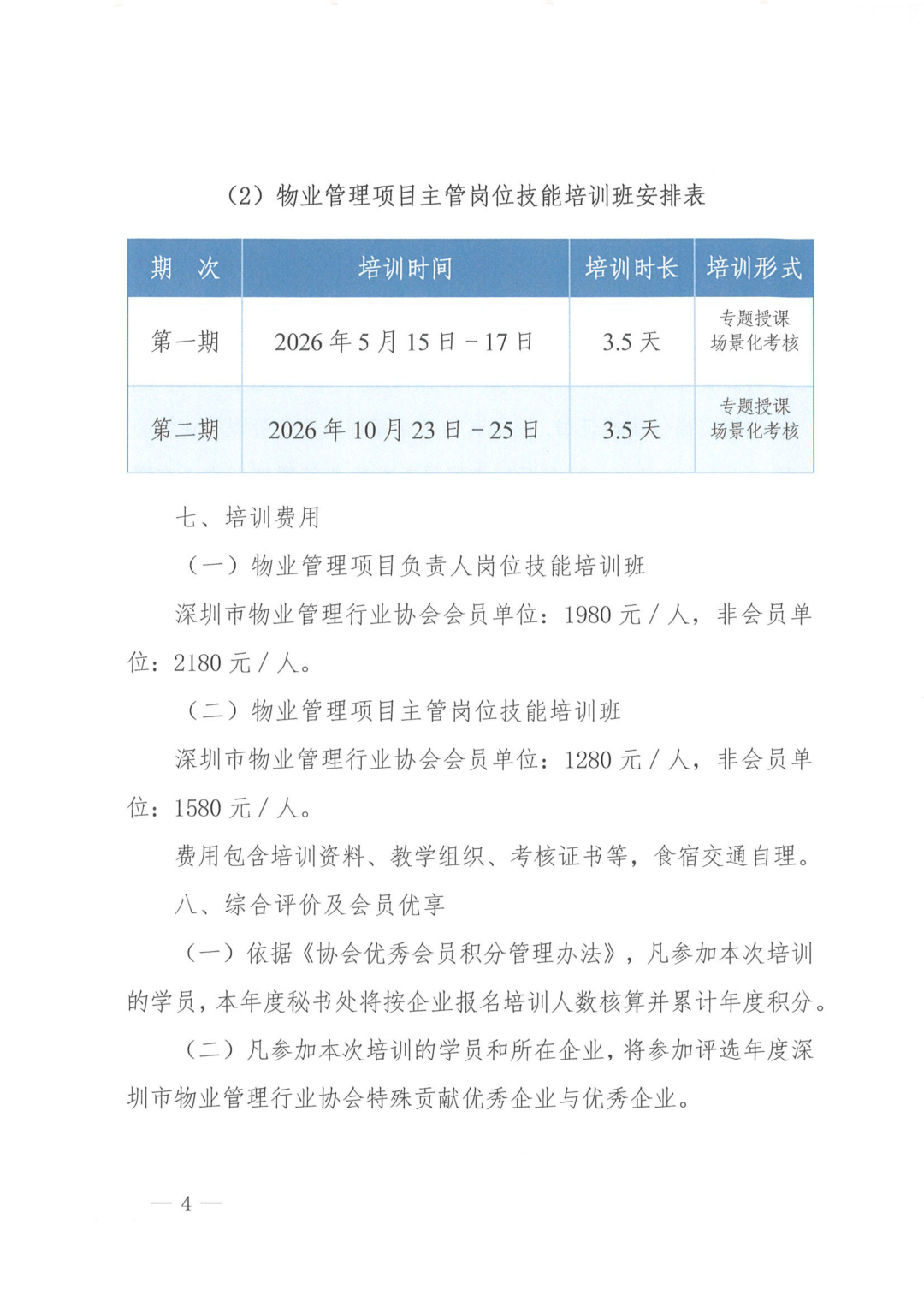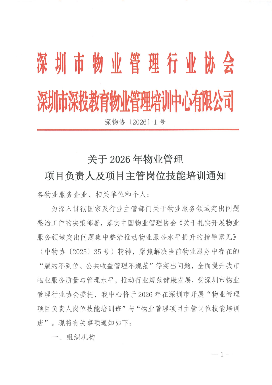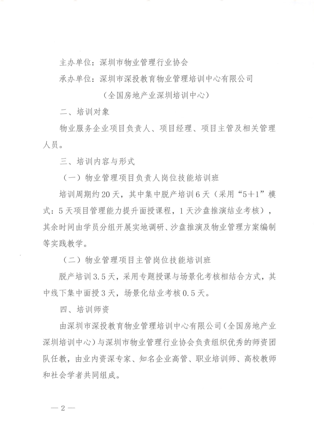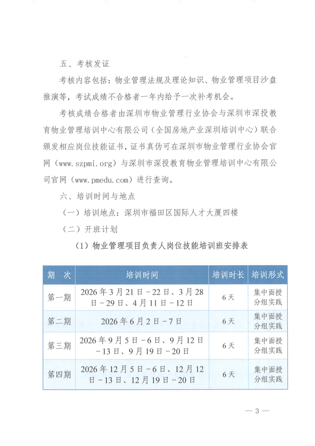 为深入贯彻国家及行业主管部门关于物业服务领域突出问题整治工作的决策部署,落实中国物业管理协会《关于扎实开展物业服务领域突出问题集中整治推动物业服务水平提升的指导意见》(中物协〔2025〕35号)精神,聚焦解决当前物业服务中存在的“履约不到位、公共收益管理不规范”等突出问题,全面提升我市物业服务质量与管理水平,推动行业规范健康发展,受深圳市物业管理行业协会委托,我中心将于2026年在深圳市开展“物业管理项目负责人岗位技能培训班”与“物业管理项目主管岗位技能培训班”。现将有关事项通知如下: 物业服务企业项目负责人、项目经理、项目主管及相关管理人员。 培训周期约20天,其中集中脱产培训6天(采用“5+1”模式:5天项目管理能力提升面授课程,1天沙盘推演结业考核),其余时间由学员分组开展实地调研、沙盘推演及物业管理方案编制等实践教学。 脱产培训3.5天,采用专题授课与场景化考核相结合方式,其中线下集中面授3天,场景化结业考核0.5天。 由深圳市深投教育物业管理培训中心有限公司(全国房地产业深圳培训中心)与深圳市物业管理行业协会负责组织优秀的师资团队任教,由业内资深专家、知名企业高管、职业培训师、高校教师和社会学者共同组成。 考核内容包括:物业管理法规及理论知识、物业管理项目沙盘推演等,考试成绩不合格者一年内给予一次补考机会。 考核成绩合格者由深圳市物业管理行业协会与深圳市深投教育物业管理培训中心有限公司(全国房地产业深圳培训中心)联合颁发相应岗位技能证书,证书真伪可在深圳市物业管理行业协会官网(www.szpmi.org)与深圳市深投教育物业管理培训中心有限公司官网(www.pmedu.com)进行查询。