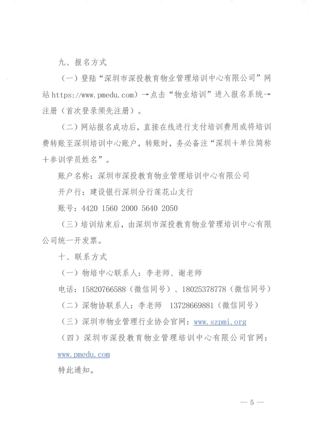深圳市物业管理行业协会会员单位:1980元/人,非会员单位:2180元/人。 深圳市物业管理行业协会会员单位:1280元/人,非会员单位:1580元/人。 费用包含培训资料、教学组织、考核证书等,食宿交通自理。 (一)依据《协会优秀会员积分管理办法》,凡参加本次培训的学员,本年度秘书处将按企业报名培训人数核算并累计年度积分。 (二)凡参加本次培训的学员和所在企业,将参加评选年度深圳市物业管理行业协会特殊贡献优秀企业与优秀企业。 (一)登陆“深圳市深投教育物业管理培训中心有限公司”网站https://www.pmedu.com)→点击“物业培训”进入报名系统→注册(首次登录须先注册)。 (二)网站报名成功后,直接在线进行支付培训费用或将培训费转账至深圳培训中心账户,转账时,务必备注“深圳+单位简称+参训学员姓名”。 账号:4420 1560 2000 5640 2050 (三)培训结束后,由深圳市深投教育物业管理培训中心有限公司统一开发票。 电话:15820766588(微信同号)、18025378778(微信同号) (二)深物协联系人:李老师 13728669881(微信同号) (三)深圳市物业管理行业协会官网:www.szpmi.org (四)深圳市深投教育物业管理培训中心有限公司官网:www.pmedu.com通知原文如下: