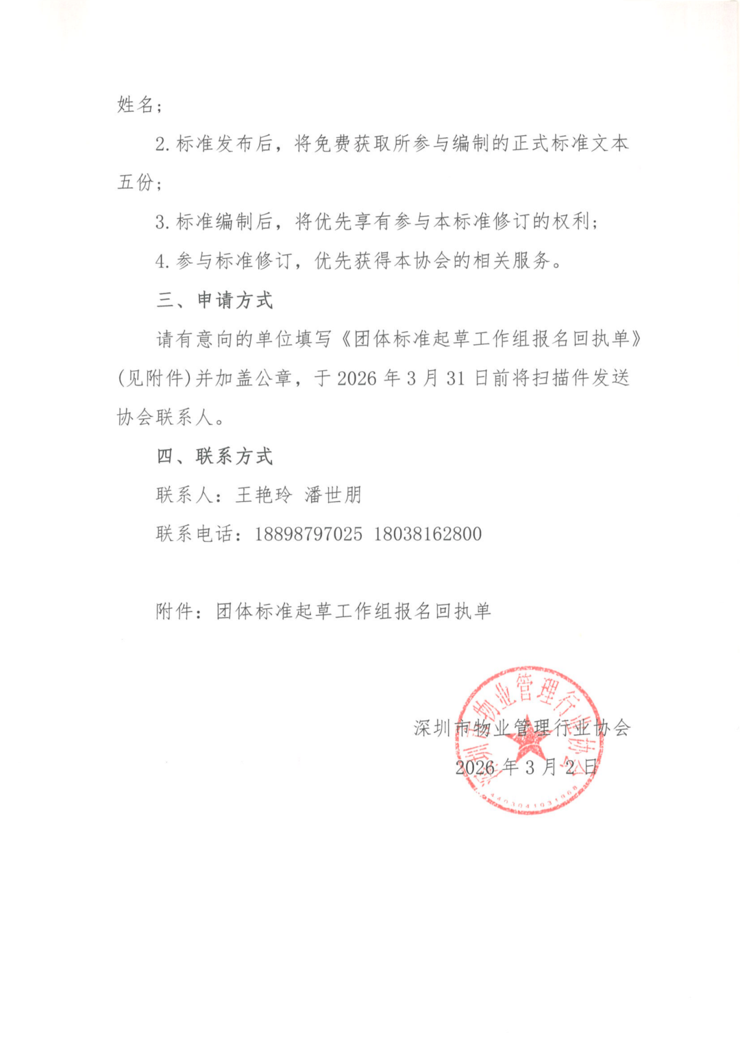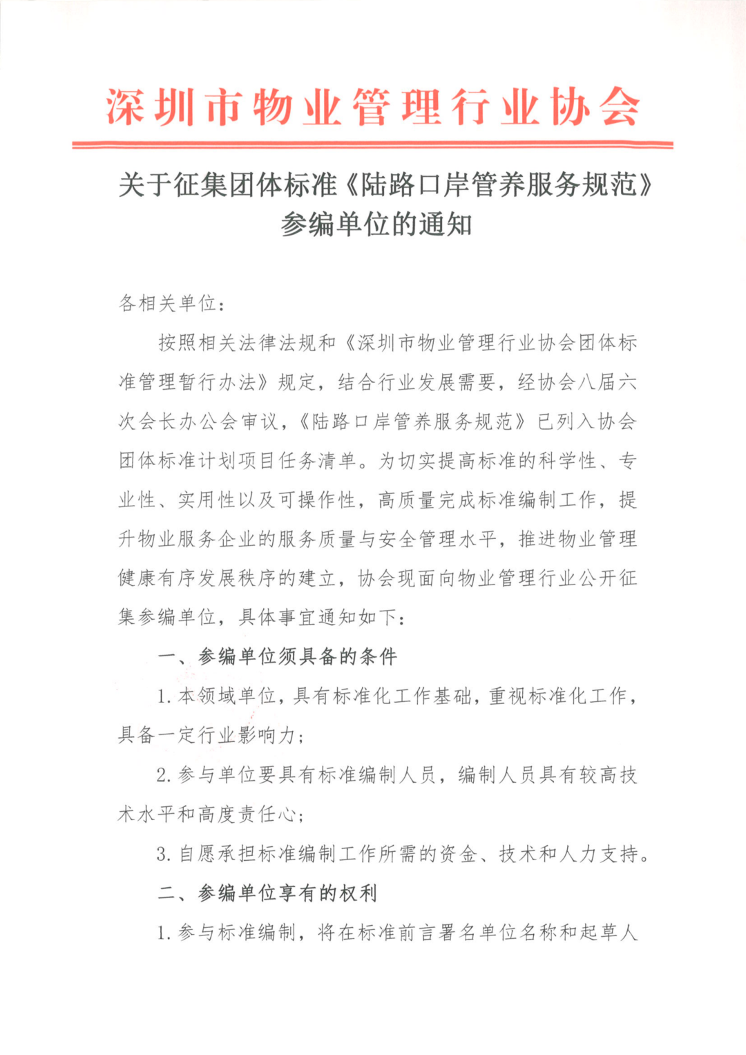 按照相关法律法规和《深圳市物业管理行业协会团体标准管理暂行办法》规定,结合行业发展需要,经协会八届六次会长办公会审议,《陆路口岸管养服务规范》已列入协会团体标准计划项目任务清单。为切实提高标准的科学性、专业性、实用性以及可操作性,高质量完成标准编制工作,提升物业服务企业的服务质量与安全管理水平,推进物业管理健康有序发展秩序的建立,协会现面向物业管理行业公开征集参编单位,具体事宜通知如下: 1.本领域单位,具有标准化工作基础,重视标准化工作,具备一定行业影响力; 2.参与单位要具有标准编制人员,编制人员具有较高技术水平和高度责任心; 3.自愿承担标准编制工作所需的资金、技术和人力支持。 1.参与标准编制,将在标准前言署名单位名称和起草人姓名; 2.标准发布后,将免费获取所参与编制的正式标准文本五份; 请有意向的单位填写《团体标准起草工作组报名回执单》(见附件)并加盖公章,于2026年3月31日前将扫描件发送协会联系人。 联系电话:18898797025 18038162800 附件(点左下角“阅读原文”下载):团体标准起草工作组报名回执单通知原文如下: