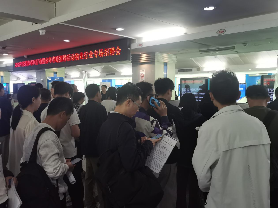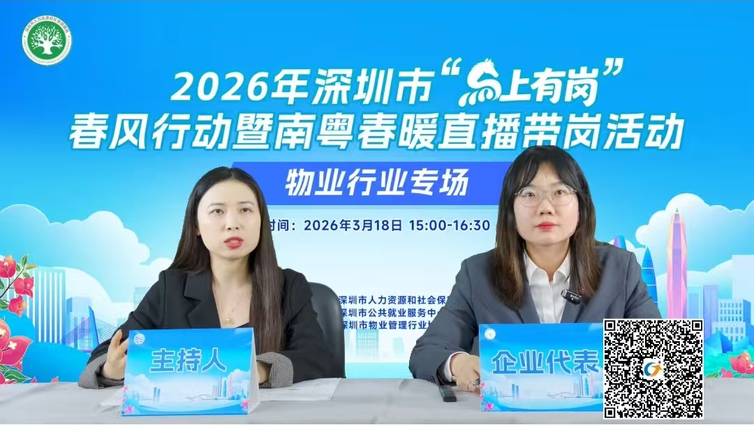 线下,50余家企业现场招聘,提供就业岗位超过1600 个;线上,深圳市人力资源和社会保障局搭建“云通道”,联合5家品牌物企首次直播带岗。作为深圳市“春风行动”系列活动的重要组成部分,由深圳市人力资源和社会保障局主办,深圳市公共就业服务中心、深圳市物业管理行业协会联合承办的 2026 年深圳市春风行动暨南粤春暖招聘活动物业行业专场招聘会,3 月 18 日在福田区劳动就业大厦招聘大厅成功举办。本次招聘会在深圳市公共就业服务中心、深圳市物业管理行业协会前期积极发动下,通过多渠道充分预热,得到社会广泛关注。招聘会筛选优质物业企业参加,汇聚中海、招商、明喆、之平、鸿荣源、安居、福田、龙光、嘉里建设等知名物企50余家。招聘会精准聚焦物业行业人才需求,对岗位信息进行严格审核,保障求职者权益,提供的超过1600个招聘岗位中,既有物业管家、安管员、保洁员、绿化工等一线服务岗,又有工程技工、电梯维修工、弱电工程师、智能楼宇师等专业技术岗,还有项目经理、财务经理、运营总监、战略规划、预算管控等管理及职能岗。其中,安管员需求超过30%,工程技工类需求10%。