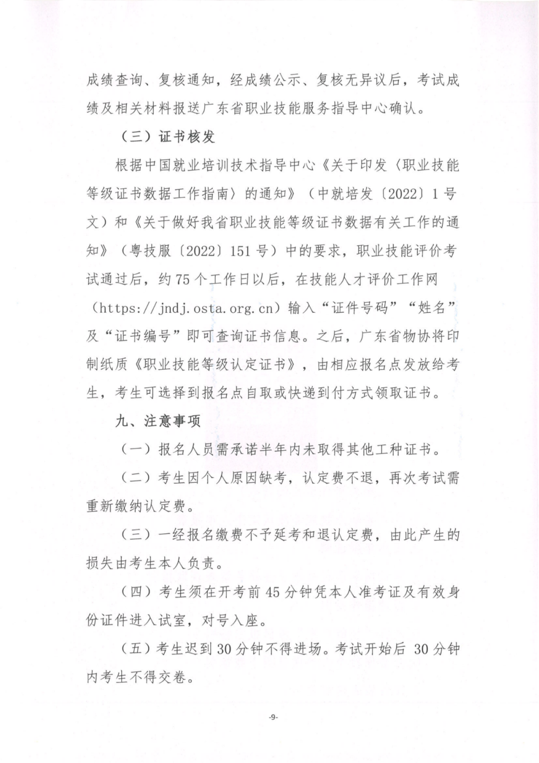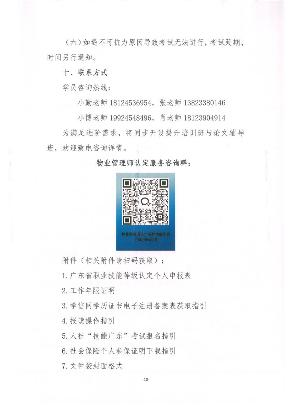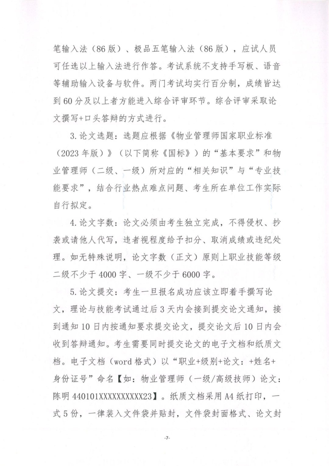 1.时长内容:考试内容分为理论知识考试(120分钟)、技能考核(90分钟)、综合评审(30分钟),分别考核从业人员的物业管理理论知识、专业技能和综合职业能力。 2.考核方式:理论知识考试和技能考核形式是闭卷线下机考,应试人员应当使用计算机鼠标及键盘在计算机答题界面上直接作答。考试系统支持5种输入法:搜狗全拼输入法、QQ全拼输入法、谷歌双拼输入法(微软双拼方案)、搜狗五笔输入法(86版)、极品五笔输入法(86版),应试人员可任选以上输入法进行作答。考试系统不支持手写板、语音等辅助输入设备与软件。两门考试均实行百分制,成绩皆达到60分及以上者方能进入综合评审环节。综合评审采取论文撰写+口头答辩的方式进行。 3.论文选题:选题应根据《物业管理师国家职业标准(2023年版)》(以下简称《国标》)的“基本要求”和物业管理师(二级、一级)所对应的“相关知识”与“专业技能要求”,结合行业热点难点问题、考生所在单位工作实际自行拟定。 4.论文字数:论文必须由考生独立完成,不得侵权、抄袭或请他人代写,违者视程度给予扣分、取消成绩或违纪处理。如无特殊说明,论文字数(正文)原则上职业技能等级二级不少于4000字、一级不少于6000字。 5.论文提交:考生一旦报名成功应该立即着手撰写论文,理论与技能考试通过后3天内会接到提交论文通知,接到通知10日内按通知要求提交论文,提交论文后10日内会收到答辩通知。考生需要同时提交论文的电子文档和纸质文档。电子文档(word格式)以“职业+级别+论文:+姓名+身份证号”命名【如:物业管理师(一级/高级技师)论文:陈明440101XXXXXXXXXX23】。纸质文档采用A4纸打印,一式5份,一律装入文件袋并贴封,文件袋封面格式、论文封面格式、论文撰写格式见附件7、8、9。论文一旦提交,不得以任何理由更改或替换。论文内容不符合撰写要求的考生,不得参加答辩。 6.论文成绩:论文内容部分的成绩实行百分制,由评审考评组中每位成员评定的成绩进行算术平均后得出。考生的综合评审论文成绩必须满足以下两个条件,考生方可参加论文口头答辩。 (2)占评审考评组总数2/3以上的成员评分合格(≥60分)。 7.论文评审合格后,进入论文口头答辩环节,并在答辩前公布论文是否合格(鉴于论文成绩只为综合评审成绩中的一部分,公布论文评审结果时只公布是否合格,不公布具体分数),同时公布答辩安排。 8.综合评审成绩=论文内容成绩×40%+论文答辩成绩×60%。论文撰写或口头答辩任一部分不合格的,综合评审即为不合格。 9.单科成绩不满60分则视为不合格,可重新交费(只交认定费)报考相应考试科目进行补考,每科仅有1次补考机会,且需在下一个认定考试期完成补考。 考试结束后,广东省物协统一阅卷,5个工作日内发布成绩查询、复核通知,经成绩公示、复核无异议后,考试成绩及相关材料报送广东省职业技能服务指导中心确认。 根据中国就业培训技术指导中心《关于印发〈职业技能等级证书数据工作指南〉的通知》(中就培发〔2022〕1号文)和《关于做好我省职业技能等级证书数据有关工作的通知》(粤技服〔2022〕151号)中的要求,职业技能评价考试通过后,约75个工作日以后,在技能人才评价工作网(https://jndj.osta.org.cn)输入“证件号码”“姓名”及“证书编号”即可查询证书信息。之后,广东省物协将印制纸质《职业技能等级认定证书》,由相应报名点发放给考生,考生可选择到报名点自取或快递到付方式领取证书。 (二)考生因个人原因缺考,认定费不退,再次考试需重新缴纳认定费。 (三)一经报名缴费不予延考和退认定费,由此产生的损失由考生本人负责。 (四)考生须在开考前45分钟凭本人准考证及有效身份证件进入试室,对号入座。 (五)考生迟到30分钟不得进场。考试开始后 30分钟内考生不得交卷。 (六)如遇不可抗力原因导致考试无法进行,考试延期,时间另行通知。 小勤老师18124536954,张老师13823380146 小博老师19924548496,肖老师18123904914 为满足进阶需求,将同步开设提升培训班与论文辅导班,欢迎致电咨询详情。