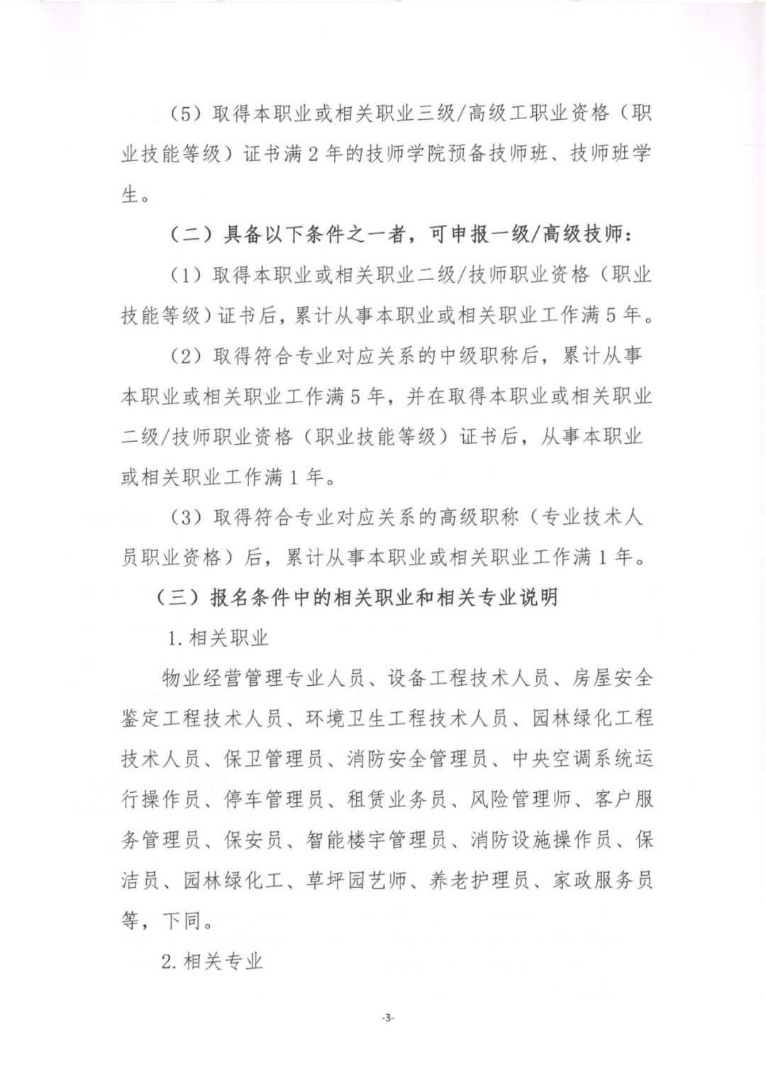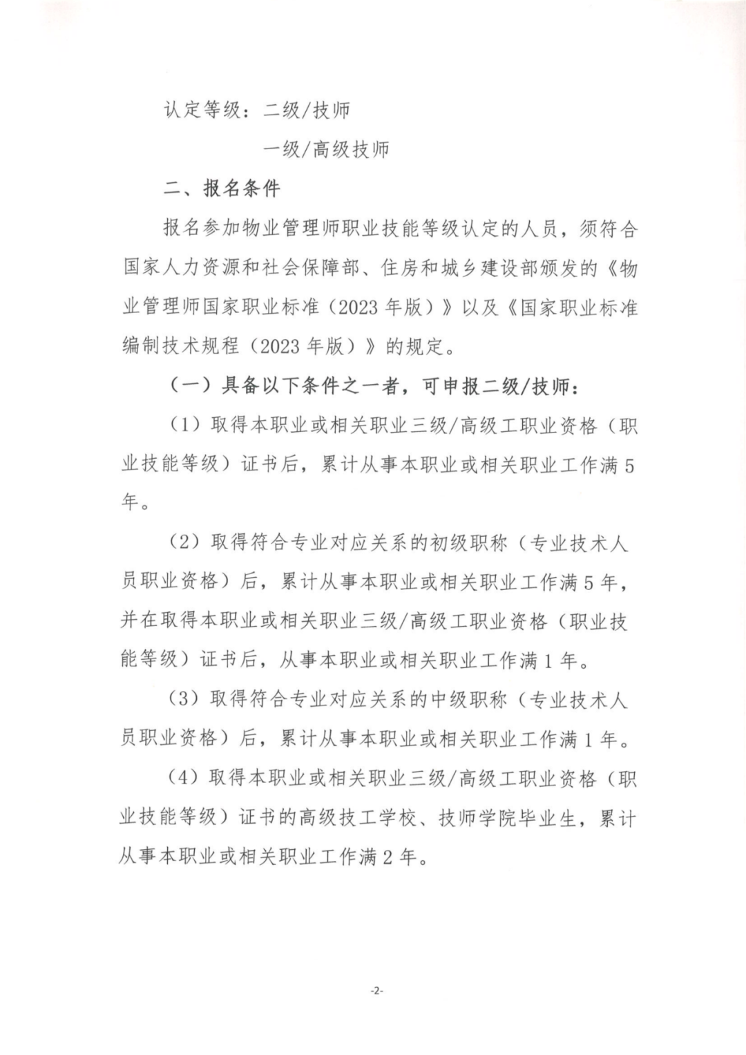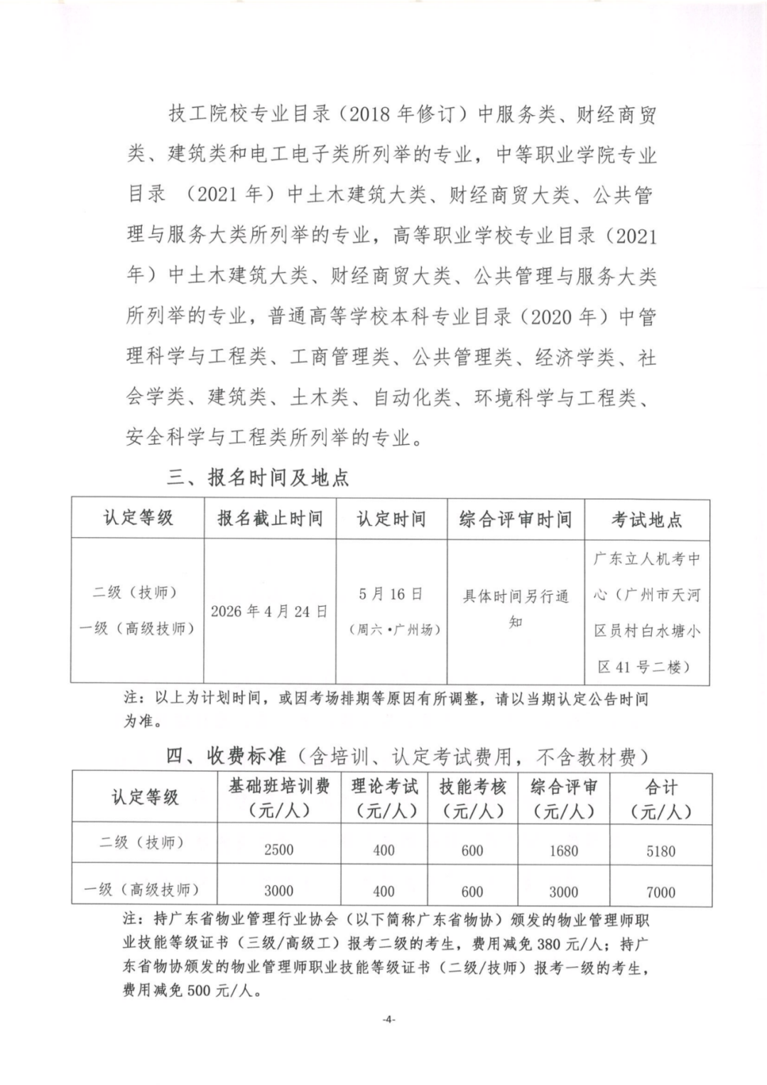 为贯彻落实人力资源社会保障部《关于健全完善新时代技能人才职业技能等级制度的意见(试行)》(人社部发〔2022〕14号)、广东省人力资源和社会保障厅《关于进一步做好职业技能等级认定工作的通知》(粤人社函〔2021〕76号)的要求,根据广东省职业技能服务指导中心《关于同意广东省物业管理行业协会开展职业技能等级认定工作的函》(粤技服〔2022〕83号),全面推动广东省物业管理行业技能人才队伍建设,方便从业人员参加培训、考试认定,现面向全省物业管理行业开展2026年度物业管理师职业技能等级认定培训工作。现将认定培训安排如下: 报名参加物业管理师职业技能等级认定的人员,须符合国家人力资源和社会保障部、住房和城乡建设部颁发的《物业管理师国家职业标准(2023年版)》以及《国家职业标准编制技术规程(2023年版)》的规定。 (1)取得本职业或相关职业三级/高级工职业资格(职业技能等级)证书后,累计从事本职业或相关职业工作满5年。 (2)取得符合专业对应关系的初级职称(专业技术人员职业资格)后,累计从事本职业或相关职业工作满5年,并在取得本职业或相关职业三级/高级工职业资格(职业技能等级)证书后,从事本职业或相关职业工作满1年。 (3)取得符合专业对应关系的中级职称(专业技术人员职业资格)后,累计从事本职业或相关职业工作满1年。 (4)取得本职业或相关职业三级/高级工职业资格(职业技能等级)证书的高级技工学校、技师学院毕业生,累计从事本职业或相关职业工作满2年。 (5)取得本职业或相关职业三级/高级工职业资格(职业技能等级)证书满2年的技师学院预备技师班、技师班学生。 (1)取得本职业或相关职业二级/技师职业资格(职业技能等级)证书后,累计从事本职业或相关职业工作满5年。 (2)取得符合专业对应关系的中级职称后,累计从事本职业或相关职业工作满5年,并在取得本职业或相关职业二级/技师职业资格(职业技能等级)证书后,从事本职业或相关职业工作满1年。 (3)取得符合专业对应关系的高级职称(专业技术人员职业资格)后,累计从事本职业或相关职业工作满1年。 物业经营管理专业人员、设备工程技术人员、房屋安全鉴定工程技术人员、环境卫生工程技术人员、园林绿化工程技术人员、保卫管理员、消防安全管理员、中央空调系统运行操作员、停车管理员、租赁业务员、风险管理师、客户服务管理员、保安员、智能楼宇管理员、消防设施操作员、保洁员、园林绿化工、草坪园艺师、养老护理员、家政服务员等,下同。 技工院校专业目录(2018年修订)中服务类、财经商贸类、建筑类和电工电子类所列举的专业,中等职业学院专业目录 (2021年)中土木建筑大类、财经商贸大类、公共管理与服务大类所列举的专业,高等职业学校专业目录(2021年)中土木建筑大类、财经商贸大类、公共管理与服务大类所列举的专业,普通高等学校本科专业目录(2020年)中管理科学与工程类、工商管理类、公共管理类、经济学类、社会学类、建筑类、土木类、自动化类、环境科学与工程类、安全科学与工程类所列举的专业。