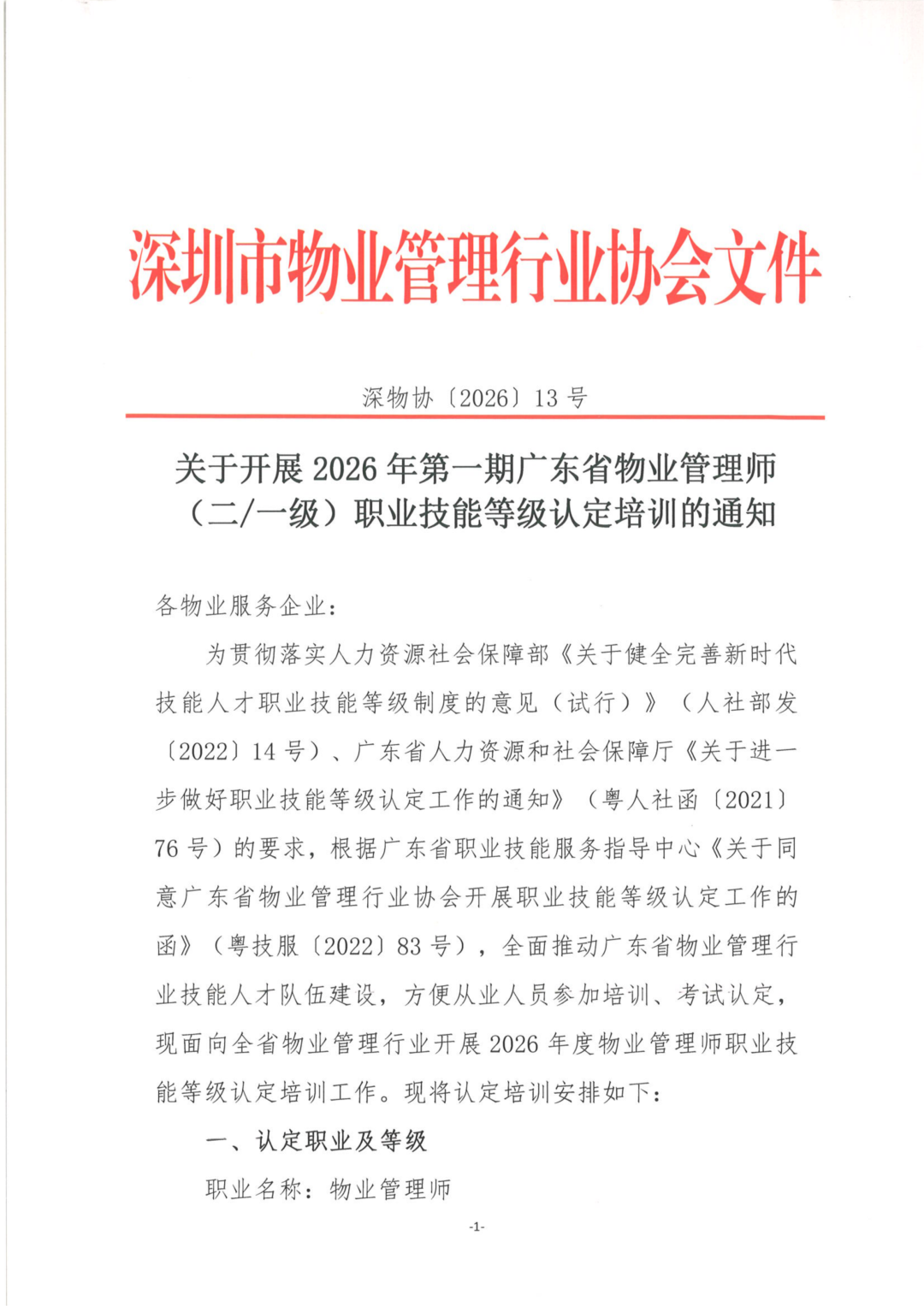 关于开展2026年第一期广东省物业管理师(二/一级)职业技能等级认定培训的通知