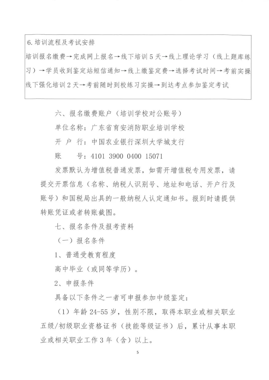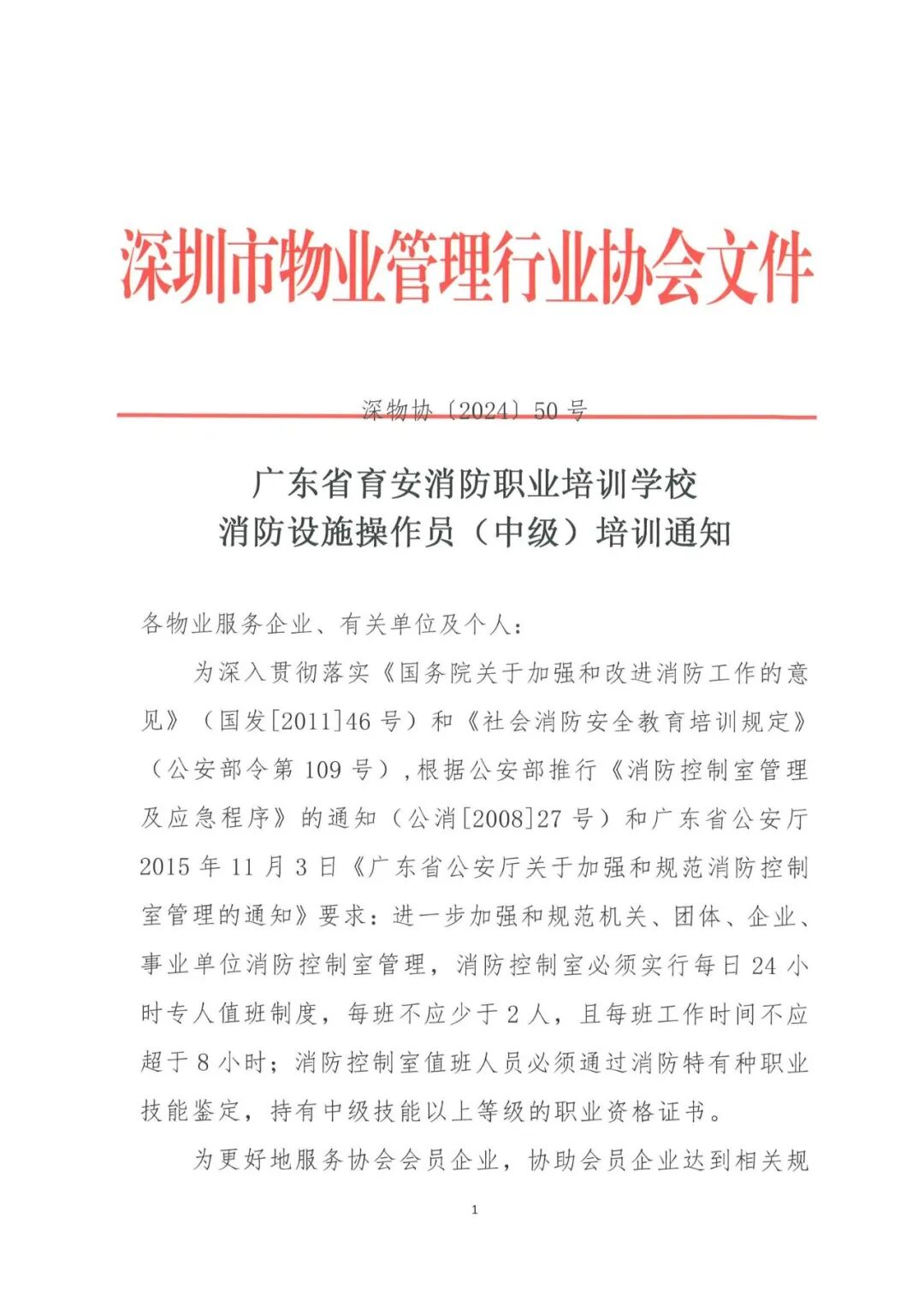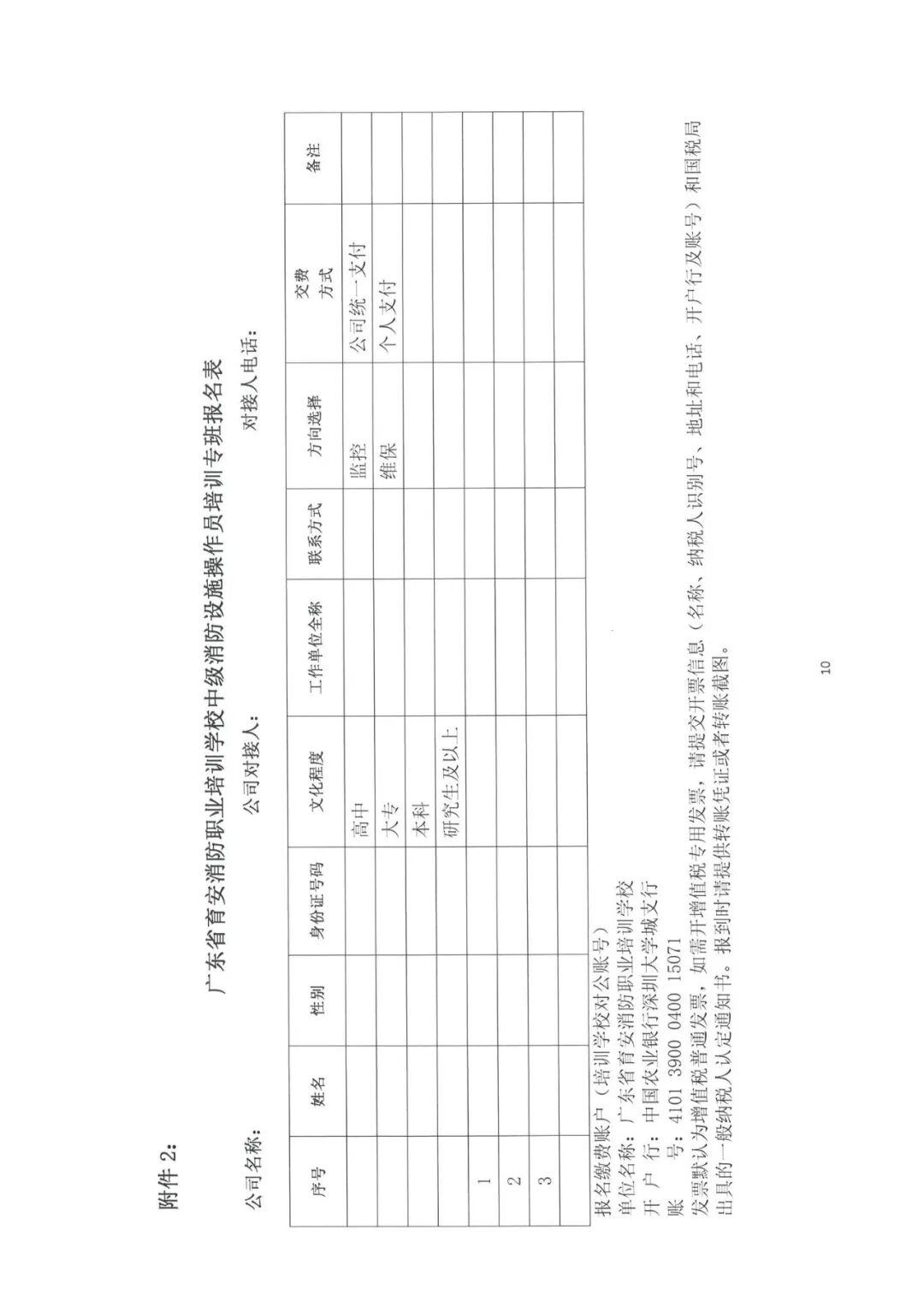 发票默认为增值税普通发票,如需开增值税专用发票,请提交开票信息(名称、纳税人识别号、地址和电话、开户行及账号)和国税局出具的一般纳税人认定通知书。报到时请提供转账凭证或者转账截图。 (1)年龄24-55岁,性别不限,取得本职业或相关职业五级/初级职业资格证书(技能等级证书)后,累计从事本职业或相关职业工作3年(含)以上。 (2)累计从事本职业或相关职业工作5年(含)以上。 (3)取得技工学校本专业或相关专业毕业证书(含尚未取得毕业证书的在校应届毕业生);或取得经评估论证、以中级技能为培养目标的中等及以上职业学校本职业或相关专业毕业证书(含尚未取得毕业证书的在校应届毕业生)。 注:本职业/相关职业/本专业/相关专业等请参考《消防设施操作员》国家职业标准的注释规定。 个人近期证件白底免冠小二寸彩照电子版(jpg格式),大于或等于300*420像素,文件大于或等于30Kb;不可通过纸质照片扫描、翻拍等形式获取。 证明高中(或同等学历)及以上学历的毕业证或户口本清晰彩照;毕业证丢失的,应提供学信网查询信息或原就读学校开具的学籍、毕业的证明材料。 提供高中(或同等学历)及以上学历毕业后,从事本职业或相关职业的工作履历,打印签字后扫描上传(具体按广东省鉴定站的要求为准)。 2、我会会员企业团体报名的,请指定本单位培训对接人并汇总本单位参训人员清单,填写《广东省育安消防职业培训学校中级消防设施操作员培训专班报名表》(见附件2),统一发送给协会工作人员。 学校地址:深圳市南山区艺园路202号马家龙文体中心B栋三层 凡参加本次培训班的学员,将纳入我会有关评价的规定中。同时根据深圳物协《会员积分管理办法》要求,评选年度优秀会员时将按物业服务企业参训人数给予相应积分。 联系电话:83325849、18038162786、18002599297通知原文如下: