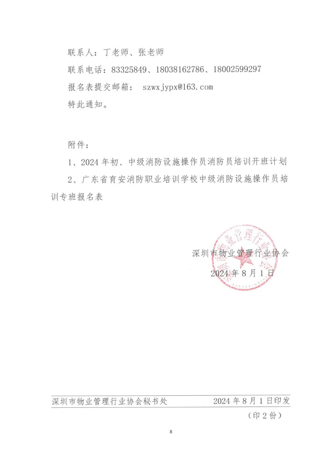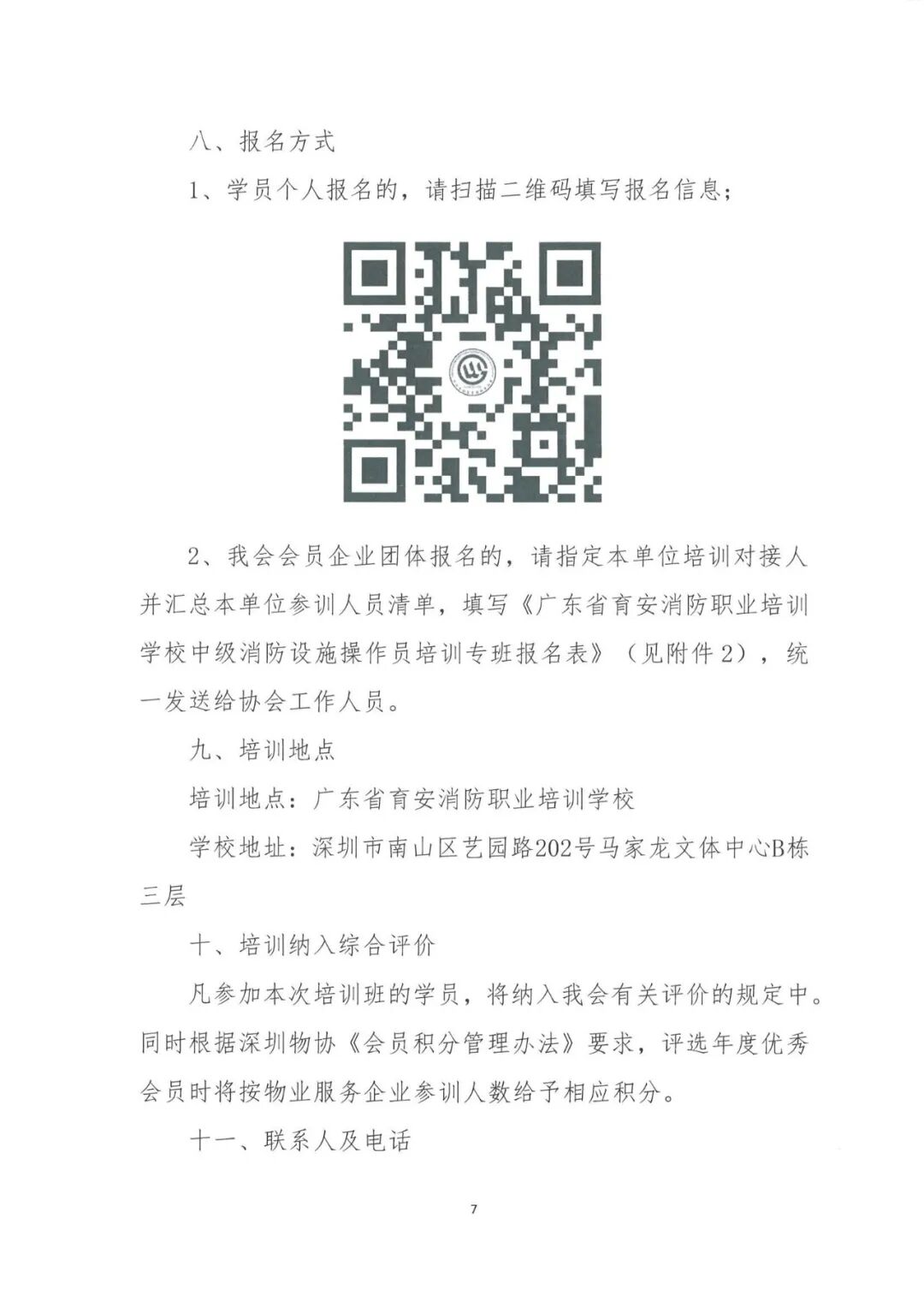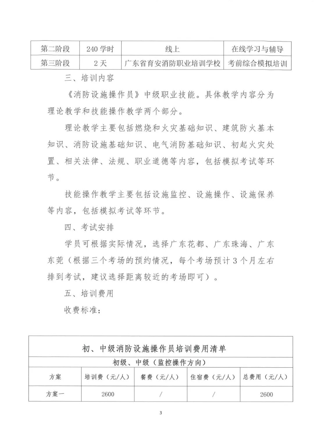 发票默认为增值税普通发票,如需开增值税专用发票,请提交开票信息(名称、纳税人识别号、地址和电话、开户行及账号)和国税局出具的一般纳税人认定通知书。报到时请提供转账凭证或者转账截图。 (1)年龄24-55岁,性别不限,取得本职业或相关职业五级/初级职业资格证书(技能等级证书)后,累计从事本职业或相关职业工作3年(含)以上。 (2)累计从事本职业或相关职业工作5年(含)以上。 (3)取得技工学校本专业或相关专业毕业证书(含尚未取得毕业证书的在校应届毕业生);或取得经评估论证、以中级技能为培养目标的中等及以上职业学校本职业或相关专业毕业证书(含尚未取得毕业证书的在校应届毕业生)。 注:本职业/相关职业/本专业/相关专业等请参考《消防设施操作员》国家职业标准的注释规定。 个人近期证件白底免冠小二寸彩照电子版(jpg格式),大于或等于300*420像素,文件大于或等于30Kb;不可通过纸质照片扫描、翻拍等形式获取。 证明高中(或同等学历)及以上学历的毕业证或户口本清晰彩照;毕业证丢失的,应提供学信网查询信息或原就读学校开具的学籍、毕业的证明材料。 提供高中(或同等学历)及以上学历毕业后,从事本职业或相关职业的工作履历,打印签字后扫描上传(具体按广东省鉴定站的要求为准)。 2、我会会员企业团体报名的,请指定本单位培训对接人并汇总本单位参训人员清单,填写《广东省育安消防职业培训学校中级消防设施操作员培训专班报名表》(见附件2),统一发送给协会工作人员。 学校地址:深圳市南山区艺园路202号马家龙文体中心B栋三层 凡参加本次培训班的学员,将纳入我会有关评价的规定中。同时根据深圳物协《会员积分管理办法》要求,评选年度优秀会员时将按物业服务企业参训人数给予相应积分。 联系电话:83325849、18038162786、18002599297通知原文如下: