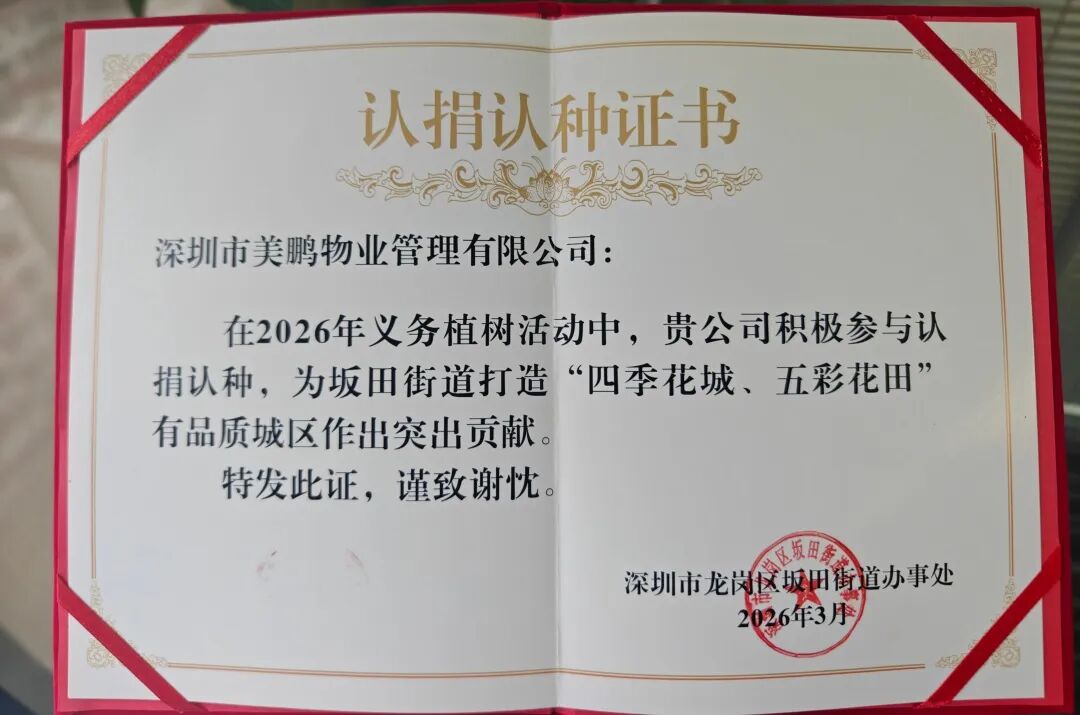 一树新绿,一方风景;一次认捐,一份情怀。对美鹏而言,这不仅是两棵树,更是企业扎根深圳、与城市共生长的见证。从守护万家灯火的物业服务,到为城市添绿增彩的公益行动,我们始终相信:最好的陪伴,是让这座城市变得更美好。