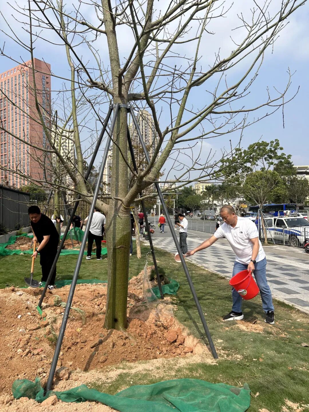 挖坑、培土、浇水……每一个动作,都带着对这片土地最朴素的敬意。树苗立起的那一刻,仿佛也立起了一份承诺——为城区添一抹绿,为未来存一份荫。