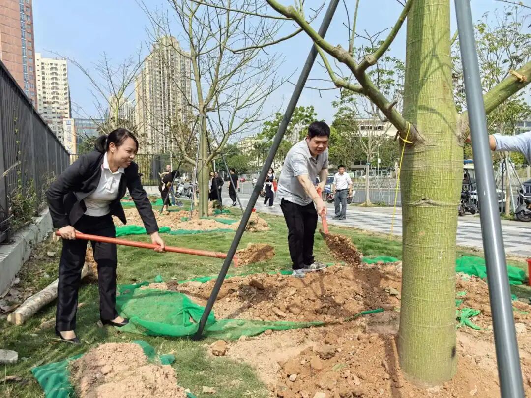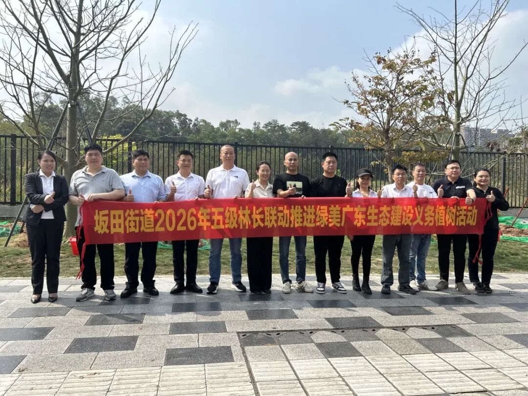 3月26日上午,坂田街道2026年五级林长联动推进绿美广东生态建设义务植树活动在辖区市政道路沿线举行。美鹏物业事业运营中心负责人黄春平代表公司,亲手将两棵认捐的美丽异木棉植入沃土。
