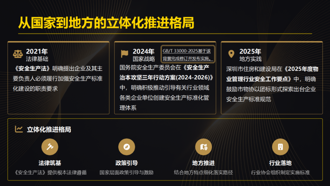 该标准由协会设施设备管理绿色数智化专业委员会提出,华侨城物业 (集团) 有限公司、深业物业运营集团股份有限公司、深圳市宝晨物业管理有限公司、明喆集团股份有限公司、深圳市标准技术研究院、深圳市龙安物业管理有限公司、中安实业 (深圳) 集团有限公司、深圳力合物业管理有限公司、四川长虹物业服务有限责任公司深圳分公司、深圳思迪消防信息科技有限公司等共同编制,本标准立足深圳物业行业业态多元、管理精细的鲜明特点,构建形成闭环可控、科学适用的安全生产管理体系,真正实现物业服务企业安全管理有章可循、有规可依、有责可追。其中,GB33000-2025作为我国大中型企业安全生产标准化的核心国标,于2025年10月31日正式实施,为本团体标准的编制提供了重要的顶层遵循与核心框架支撑。近年来,安全生产工作被摆在前所未有的突出位置,顶层政策持续加码发力,为行业安全标准化建设划定清晰路径、提供坚实支撑。2021年新修订的《安全生产法》明确要求企业及其主要负责人必须履行安全生产标准化建设职责,为行业安全管理筑牢法律根基;2024年国务院安全生产委员会印发《安全生产治本攻坚三年行动方案(2024--2026)》,明确提出大力推动各行业企业搭建安全生产标准化管理体系,积极树立标杆、推广先进经验;2025年深圳市住房和建设局印发物业管理行业安全工作要点,明确鼓励行业协会以团体标准形式,出台针对性安全规范,引导行业整体提升安全生产标准化管理水平;同期,GB33000-2025《大中型企业安全生产标准化管理体系要求》正式实施,创新构建LS-PDCA管理模式和“三道防线”防控模型,为各行业大中型企业安全管理提供了系统化框架,也为物业服务企业安全生产标准化建设指明了方向。