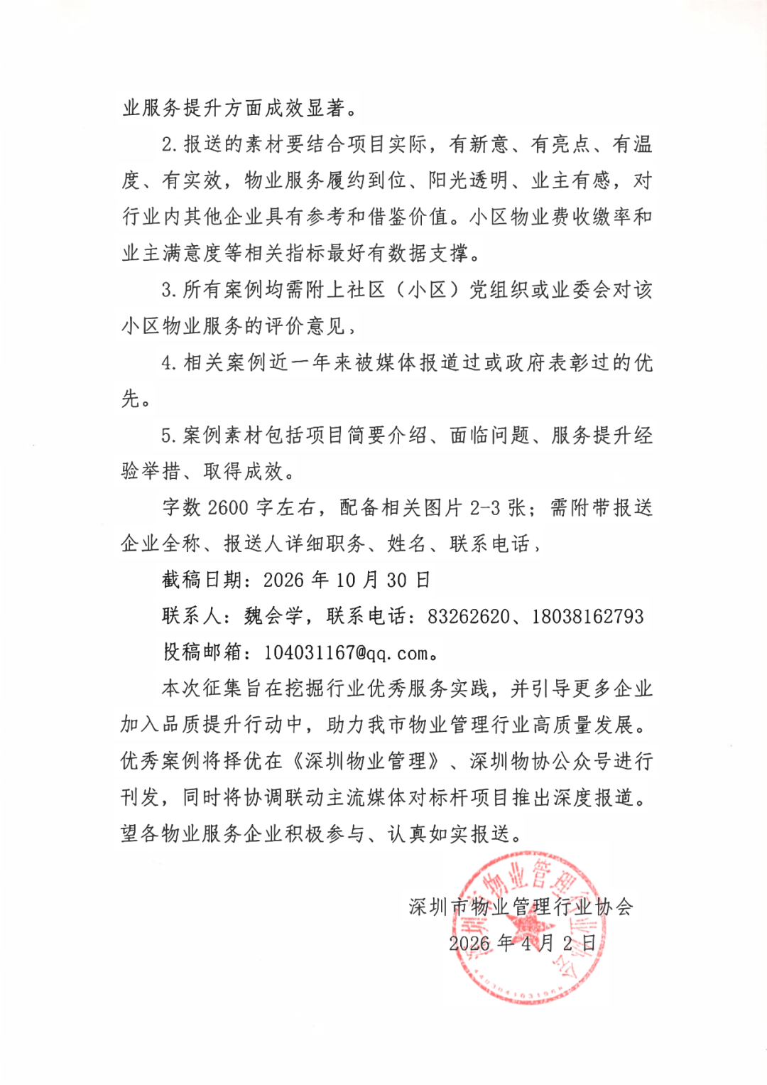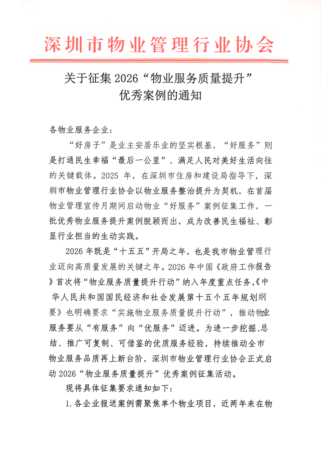 年,在深圳市住房和建设局指导下,深圳市物业管理行业协会以物业服务整治提升为契机,在首届物业管理宣传月期间启动物业“好服务”案例征集工作,一批优秀物业服务提升案例脱颖而出,成为改善民生福祉、彰显行业担当的生动实践。 2026年既是“十五五”开局之年,也是我市物业管理行业迈向高质量发展的关键之年。2026年中国《政府工作报告》首次将“物业服务质量提升行动”纳入年度重点任务,《中华人民共和国国民经济和社会发展第十五个五年规划纲要》也明确要求“实施物业服务质量提升行动”,推动物业服务要从“有服务”向“优服务”迈进。为进一步挖掘、总结、推广可复制、可借鉴的优质服务经验,持续推动全市物业服务品质再上新台阶,深圳市物业管理行业协会正式启动2026“物业服务质量提升”优秀案例征集活动。 1.各企业报送案例需聚焦单个物业项目,近两年来在物业服务提升方面成效显著。 2.报送的素材要结合项目实际,有新意、有亮点、有温度、有实效,物业服务履约到位、阳光透明、业主有感,对行业内其他企业具有参考和借鉴价值。小区物业费收缴率和业主满意度等相关指标最好有数据支撑。 3.所有案例均需附上社区(小区)党组织或业委会对该小区物业服务的评价意见。 4.相关案例近一年来被媒体报道过或政府表彰过的优先。 5.案例素材包括项目简要介绍、面临问题、服务提升经验举措、取得成效。 字数2600字左右,配备相关图片2-3张;需附带报送企业全称、报送人详细职务、姓名、联系电话。 联系人:魏会学,联系电话:83262620、18038162793 本次征集旨在挖掘行业优秀服务实践,并引导更多企业加入品质提升行动中,助力我市物业管理行业高质量发展。优秀案例将择优在《深圳物业管理》、深圳物协公众号进行刊发,同时将协调联动主流媒体对标杆项目推出深度报道。望各物业服务企业积极参与、认真如实报送。通知原文如下: