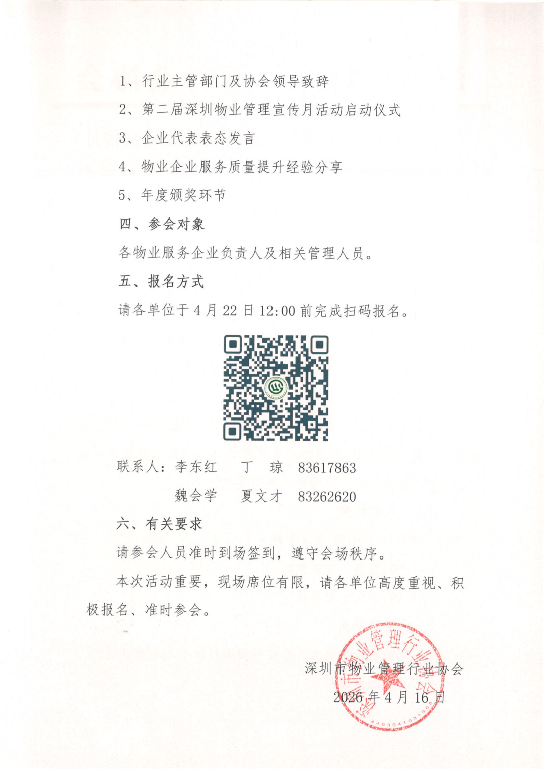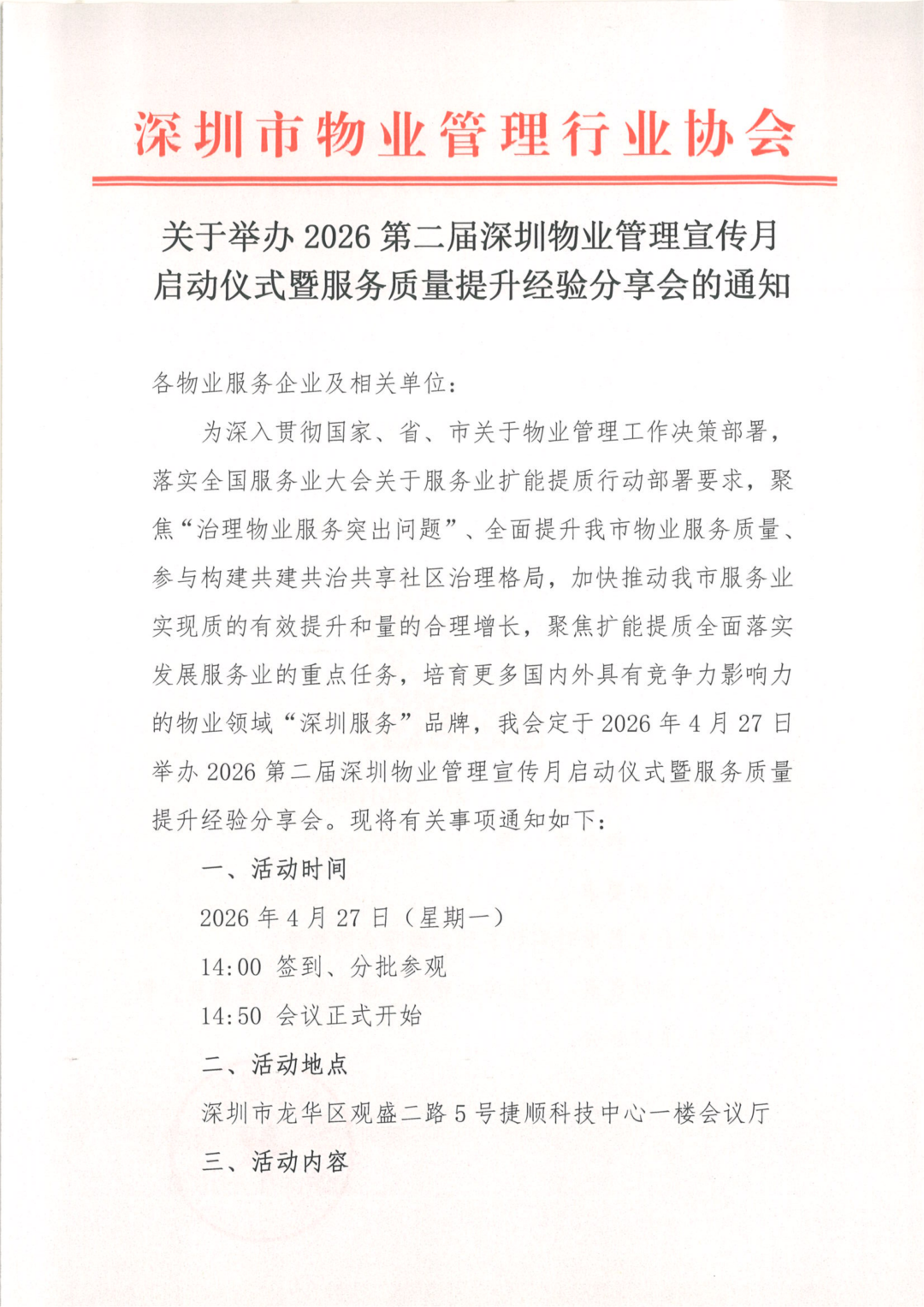为深入贯彻国家、省、市关于物业管理工作决策部署,落实全国服务业大会关于服务业扩能提质行动部署要求,聚焦“治理物业服务突出问题”、全面提升我市物业服务质量、参与构建共建共治共享社区治理格局,加快推动我市服务业实现质的有效提升和量的合理增长,聚焦扩能提质全面落实发展服务业的重点任务,培育更多国内外具有竞争力影响力的物业领域“深圳服务”品牌,我会定于2026年4月27日举办2026第二届深圳物业管理宣传月启动仪式暨服务质量提升经验分享会。现将有关事项通知如下: