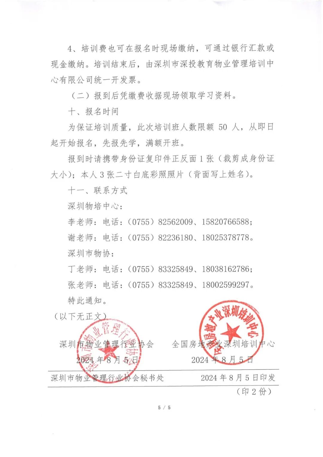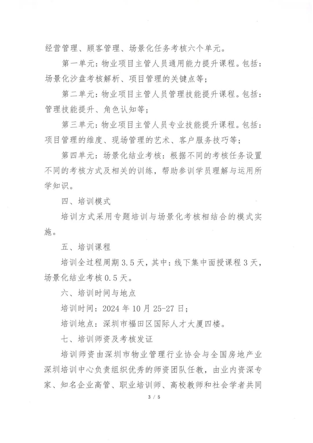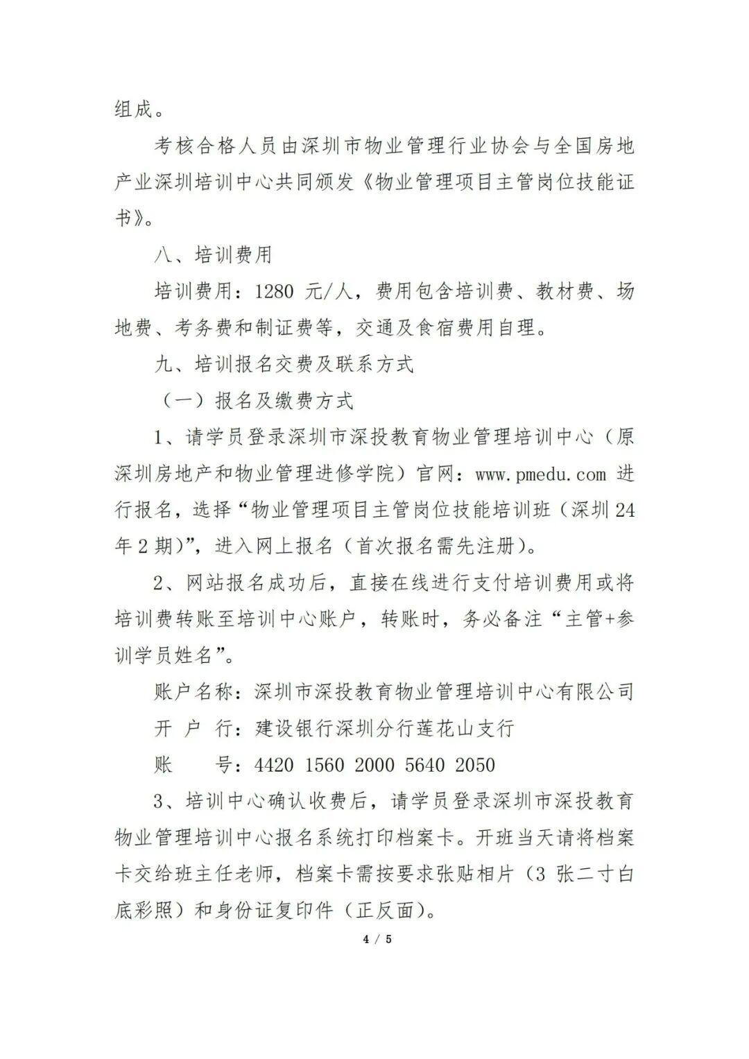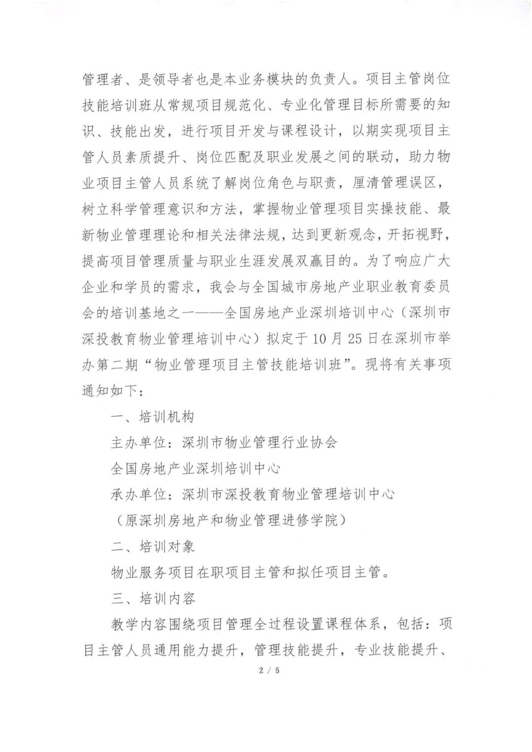 以习近平新时代中国特色社会主义思想为指导,深入贯彻党的二十大精神,坚持和加强党对职业教育工作的全面领导,把推动现代职业教育高质量发展摆在更加突出的位置。2022年12月21日,中共中央办公厅、国务院办公厅正式印发《关于深化现代职业教育体系建设改革的意见》,持续推进现代职业教育体系建设改革,优化职业教育类型定位。培养更多高素质技术技能人才、能工巧匠、大国工匠,为加快建设教育强国、科技强国、人才强国奠定坚实基础。 物业项目主管一般指对项目某一业务单元负主要责任的管理人员,如财务主管、品质主管、综合主管等,主管是管理者、是领导者也是本业务模块的负责人。项目主管岗位技能培训班从常规项目规范化、专业化管理目标所需要的知识、技能出发,进行项目开发与课程设计,以期实现项目主管人员素质提升、岗位匹配及职业发展之间的联动,助力物业项目主管人员系统了解岗位角色与职责,厘清管理误区,树立科学管理意识和方法,掌握物业管理项目实操技能、最新物业管理理论和相关法律法规,达到更新观念,开拓视野,提高项目管理质量与职业生涯发展双赢目的。为了响应广大企业和学员的需求,我会与全国城市房地产业职业教育委员会的培训基地之一——全国房地产业深圳培训中心(深圳市深投教育物业管理培训中心)拟定于10月25日在深圳市举办第二期“物业管理项目主管技能培训班”。现将有关事项通知如下: 教学内容围绕项目管理全过程设置课程体系,包括:项目主管人员通用能力提升,管理技能提升,专业技能提升、经营管理、顾客管理、场景化任务考核六个单元。 第一单元:物业项目主管人员通用能力提升课程。包括:场景化沙盘考核解析、项目管理的关键点等; 第二单元:物业项目主管人员管理技能提升课程。包括:管理技能提升、角色认知等; 第三单元:物业项目主管人员专业技能提升课程。包括:项目管理的维度、现场管理的艺术、客户服务技巧等; 第四单元:场景化结业考核:根据不同的考核任务设置不同的考核方式及相关的训练,帮助参训学员理解与运用所学知识。 培训方式采用专题培训与场景化考核相结合的模式实施。 培训全过程周期3.5天,其中:线下集中面授课程3天,场景化结业考核0.5天。 培训师资由深圳市物业管理行业协会与全国房地产业深圳培训中心负责组织优秀的师资团队任教,由业内资深专家、知名企业高管、职业培训师、高校教师和社会学者共同组成。 考核合格人员由深圳市物业管理行业协会与全国房地产业深圳培训中心共同颁发《物业管理项目主管岗位技能证书》。 培训费用:1280元/人,费用包含培训费、教材费、场地费、考务费和制证费等,交通及食宿费用自理。 1、请学员登录深圳市深投教育物业管理培训中心(原深圳房地产和物业管理进修学院)官网:www.pmedu.com进行报名,选择“物业管理项目主管岗位技能培训班(深圳24年2期)”,进入网上报名(首次报名需先注册)。 2、网站报名成功后,直接在线进行支付培训费用或将培训费转账至培训中心账户,转账时,务必备注“主管+参训学员姓名”。 账 号:4420 1560 2000 5640 2050 3、培训中心确认收费后,请学员登录深圳市深投教育物业管理培训中心报名系统打印档案卡。开班当天请将档案卡交给班主任老师,档案卡需按要求张贴相片(3张二寸白底彩照)和身份证复印件(正反面)。 4、培训费也可在报名时现场缴纳,可通过银行汇款或现金缴纳。培训结束后,由深圳市深投教育物业管理培训中心有限公司统一开发票。 为保证培训质量,此次培训班人数限额50人,从即日起开始报名,先报先学,满额开班。 报到时请携带身份证复印件正反面1张(裁剪成身份证大小);本人3张二寸白底彩照照片(背面写上姓名)。 李老师:电话:(0755)82562009、15820766588; 谢老师:电话:(0755)82236180、18025378778。 丁老师:电话:(0755)83325849、18038162786; 张老师:电话:(0755)83325849、18002599297。通知原文如下: