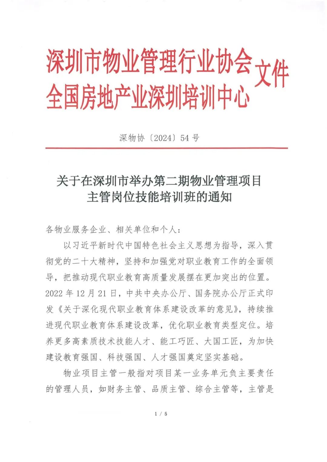 关于在深圳市举办第二期物业管理项目主管岗位技能培训班的通知