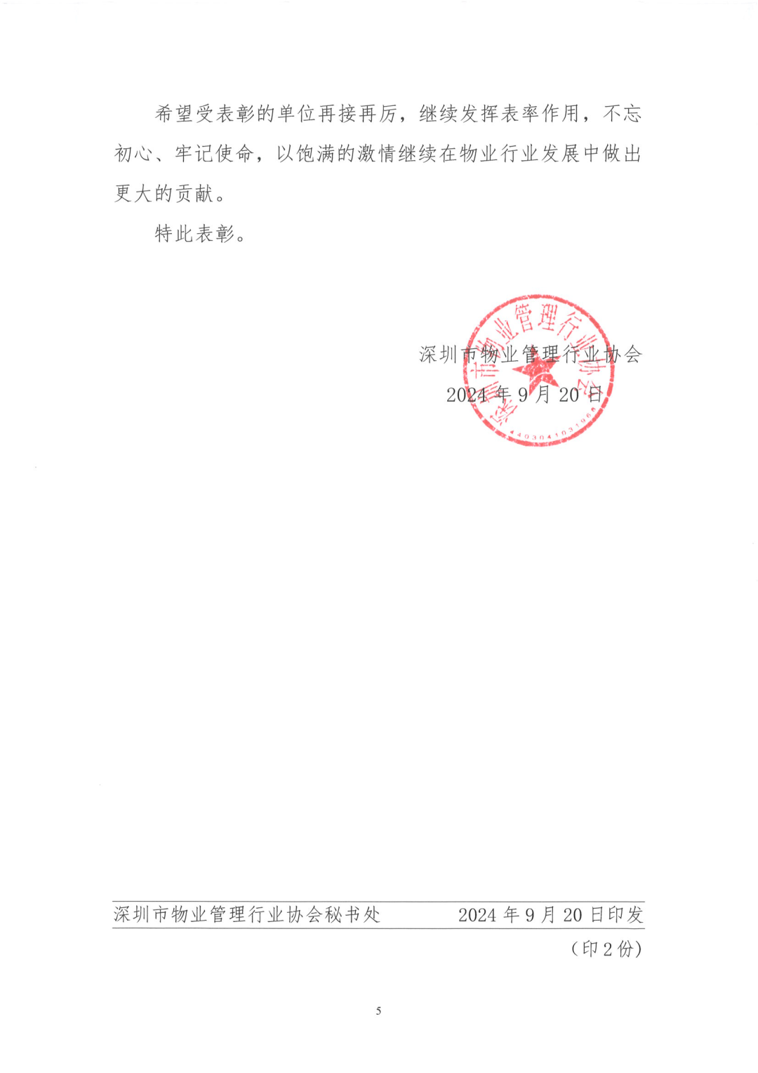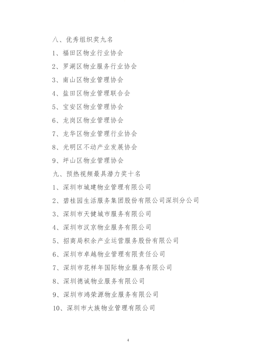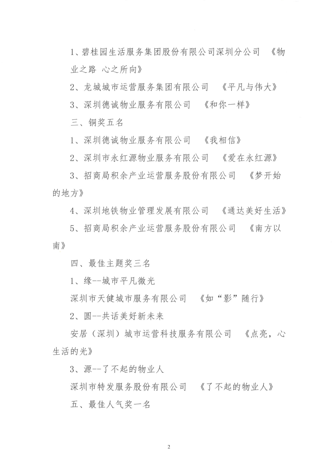 为更好地推动物业行业可持续健康发展,展示物业人的精神风貌,营造积极向上的行业氛围,提升物业管理行业的形象和认知度,深圳市物业管理行业协会联合深圳市音乐剧协会举办主题为“在一起·向未来”的深圳首届“物业之声”艺术展演大赛,大赛评选出金奖、银奖、铜奖、最佳主题奖、最佳人气奖、特殊贡献奖、优秀作品奖、优秀组织奖、预热视频最具潜力奖,现予以表彰,获奖名单及参选节目如下: 深圳天安智慧园区运营有限公司 《重生之我在天安创业》 1、碧桂园生活服务集团股份有限公司深圳分公司 《物业之路 心之所向》 3、招商局积余产业运营服务股份有限公司 《梦开始的地方》 4、深圳地铁物业管理发展有限公司 《通达美好生活》 5、招商局积余产业运营服务股份有限公司 《南方以南》 安居(深圳)城市运营科技服务有限公司 《点亮,心生活的光》 碧桂园生活服务集团股份有限公司深圳分公司 《物业之路 心之所向》 1、深圳市鸿荣源物业服务有限公司 《物业雅韵·舞动华章》 2、深圳星河智善生活股份有限公司 《yes,ok》 4、深圳市大族物业管理有限公司 《物业礼仪 Show》 6、安居(深圳)城市运营科技服务有限公司 《活力青春 物绽芳华》 7、深圳市汉京物业服务有限公司 《礼仪操创意展示》 10、深圳市城建物业管理有限公司 《夜空中最亮的星》 11、深圳市北方物业管理有限公司 《万家灯火的守护者》 希望受表彰的单位再接再厉,继续发挥表率作用,不忘初心、牢记使命,以饱满的激情继续在物业行业发展中做出更大的贡献。
