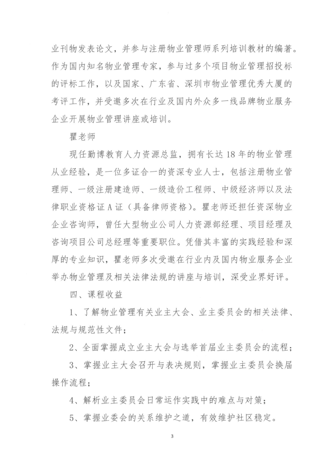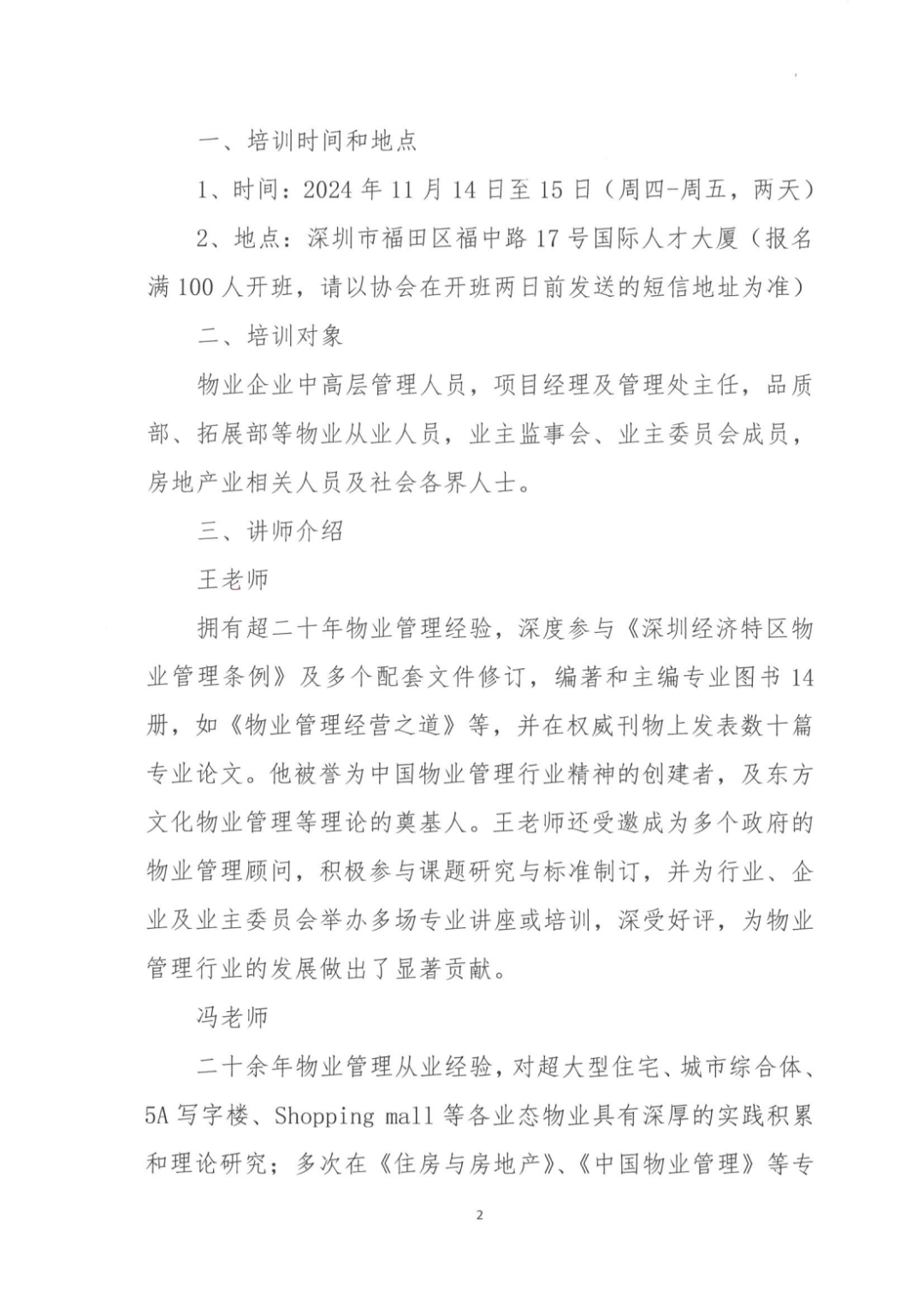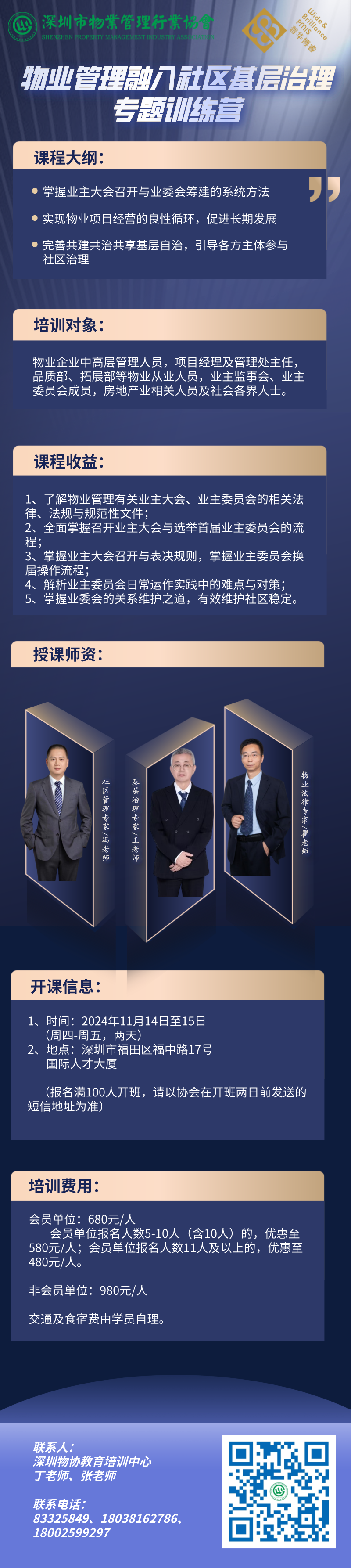 随着我国城市化进程的推进,业主维权意识日益高涨,物业企业市场竞争空前激烈,“谁开发,谁管理”的长期行业惯例被打破,完善业主大会制度,明晰权利边界,业主主体归位,这既是物业管理行业良性发展的现实要求,更是推动和谐幸福社区建设的重要途径。为此,我会特联合深圳市普华博睿公共管理和行业标准化研究中心举办“物业管理融入社区基层治理”专题训练营,通过两天的线下学习,帮助物业项目管理者系统地掌握业主大会成立、业主委员会筹建及后期关系维护的实战模型,通过实际案例讲解,规范、科学地筹建业委会,进而提升物业服务品质,最终达到业主满意度提高、项目经营良性循环的目的。 1、时间:2024年11月14日至15日(周四-周五,两天) 2、地点:深圳市福田区福中路17号国际人才大厦(报名满100人开班,请以协会在开班两日前发送的短信地址为准) 物业企业中高层管理人员,项目经理及管理处主任,品质部、拓展部等物业从业人员,业主监事会、业主委员会成员,房地产业相关人员及社会各界人士。 拥有超二十年物业管理经验,深度参与《深圳经济特区物业管理条例》及多个配套文件修订,编著和主编专业图书14册,如《物业管理经营之道》等,并在权威刊物上发表数十篇专业论文。他被誉为中国物业管理行业精神的创建者,及东方文化物业管理等理论的奠基人。王老师还受邀成为多个政府的物业管理顾问,积极参与课题研究与标准制订,并为行业、企业及业主委员会举办多场专业讲座或培训,深受好评,为物业管理行业的发展做出了显著贡献。 二十余年物业管理从业经验,对超大型住宅、城市综合体、5A写字楼、Shopping mall等各业态物业具有深厚的实践积累和理论研究;多次在《住房与房地产》、《中国物业管理》等专业刊物发表论文,并参与注册物业管理师系列培训教材的编著。作为国内知名物业管理专家,参与过多个项目物业管理招投标的评标工作,以及国家、广东省、深圳市物业管理优秀大厦的考评工作,并受邀多次在行业及国内外众多一线品牌物业服务企业开展物业管理讲座或培训。 现任勤博教育人力资源总监,拥有长达18年的物业管理从业经验,是一位多证合一的资深专业人士,包括注册物业管理师、一级注册建造师、一级造价工程师、中级经济师以及法律职业资格证A证(具备律师资格)。瞿老师还担任资深物业企业咨询师,曾任大型物业公司人力资源部经理、项目经理及咨询项目公司总经理等重要职位。凭借其丰富的实践经验和深厚的专业知识,瞿老师多次受邀在行业内及国内物业服务企业举办物业管理及相关法律法规的讲座与培训,深受业界好评。 1、了解物业管理有关业主大会、业主委员会的相关法律、法规与规范性文件; 2、全面掌握成立业主大会与选举首届业主委员会的流程; 3、掌握业主大会召开与表决规则,掌握业主委员会换届操作流程;