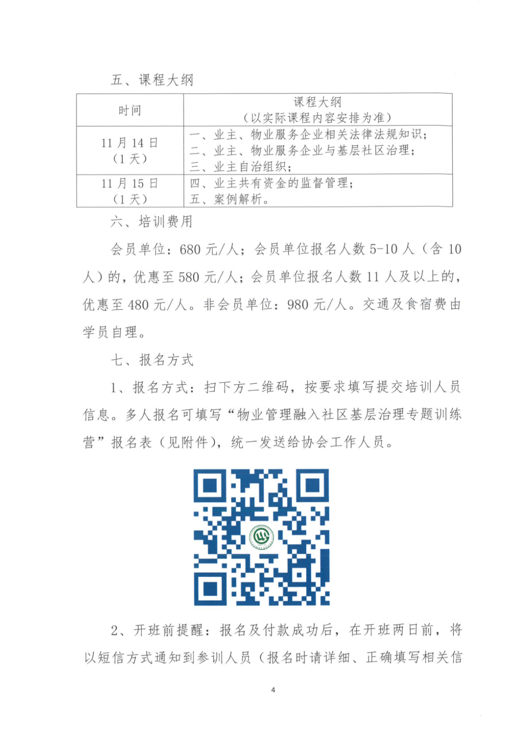 会员单位:680元/人;会员单位报名人数5-10人(含10人)的,优惠至580元/人;会员单位报名人数11人及以上的,优惠至480元/人。非会员单位:980元/人。交通及食宿费由学员自理。 1、报名方式:扫下方二维码,按要求填写提交培训人员信息。多人报名可填写“物业管理融入社区基层治理专题训练营”报名表(见附件),统一发送给协会工作人员。