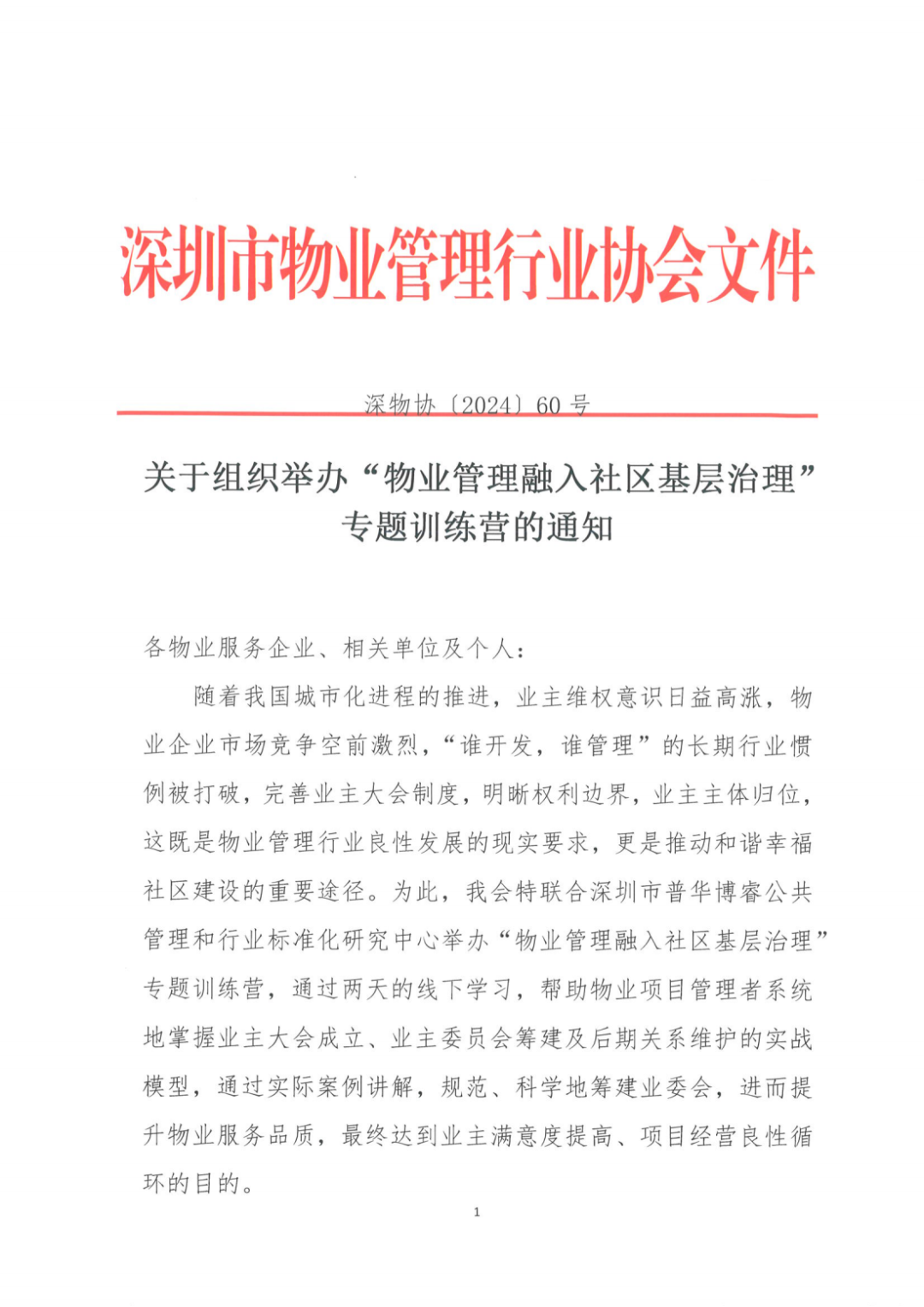 关于组织举办“物业管理融入社区基层治理”专题训练营的通知