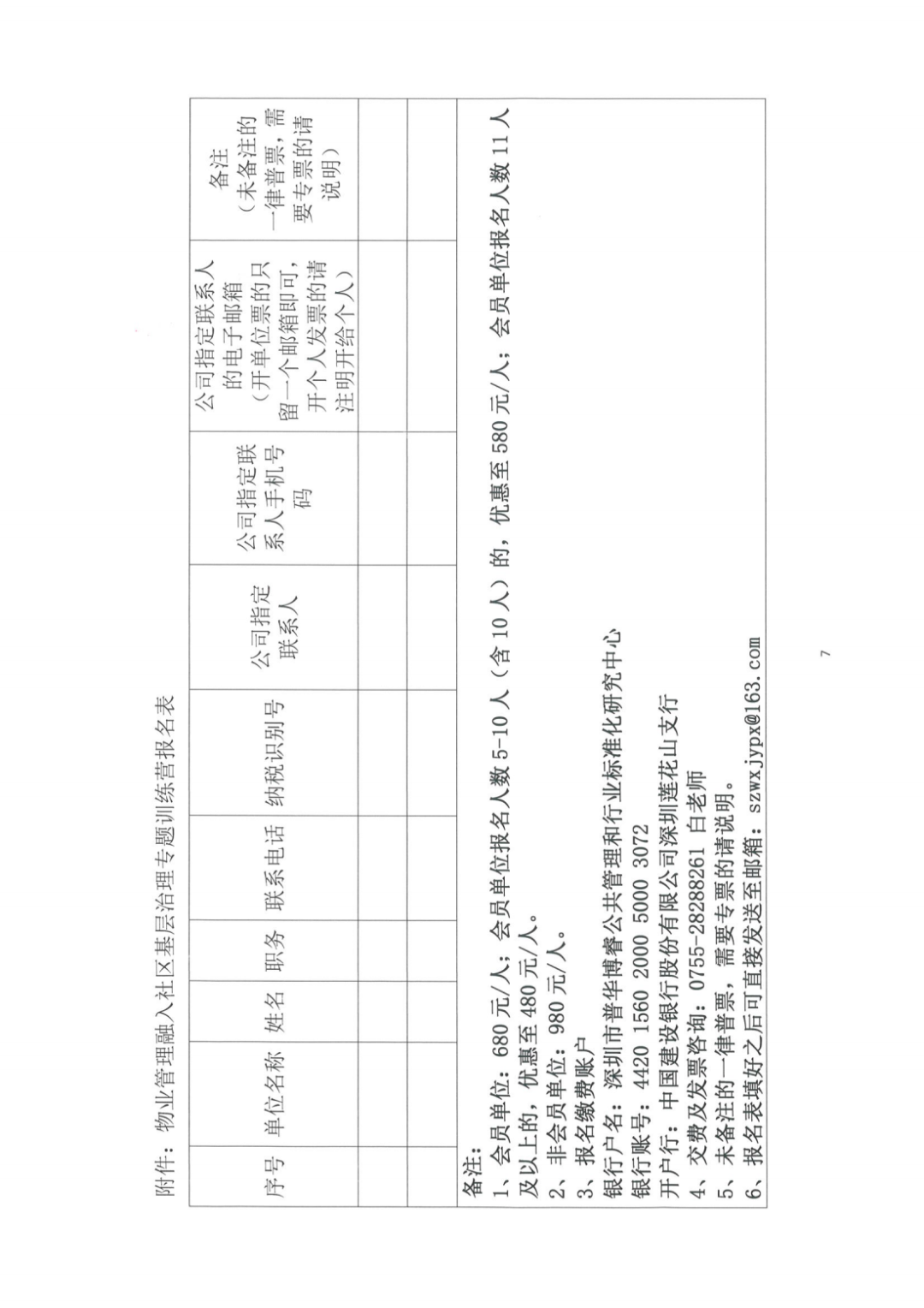 2、开班前提醒:报名及付款成功后,在开班两日前,将以短信方式通知到参训人员(报名时请详细、正确填写相关信息,期间若有参训人员信息修改请及时告知协会联系人)。现场签到时下发参训学员证,凭证入场。 1、费用采取转账方式,转账时请备注“xx企业专题训练营培训费”,11月11日截止报名及缴费。 银行户名:深圳市普华博睿公共管理和行业标准化研究中心 银行账号:4420 1560 2000 5000 3072 交费及发票咨询:0755-28288261 白老师 到账后,普华博睿财务将在五个工作日内与你单位指定联系人核实发票信息,开具电子发票,发送至企业预留电子邮箱,请注意查收。 根据我会会员积分管理办法,将按物业企业参加本期培训班的学员人数给予会员企业相应积分。 联系电话:83325849、18038162786、18002599297通知原文如下: