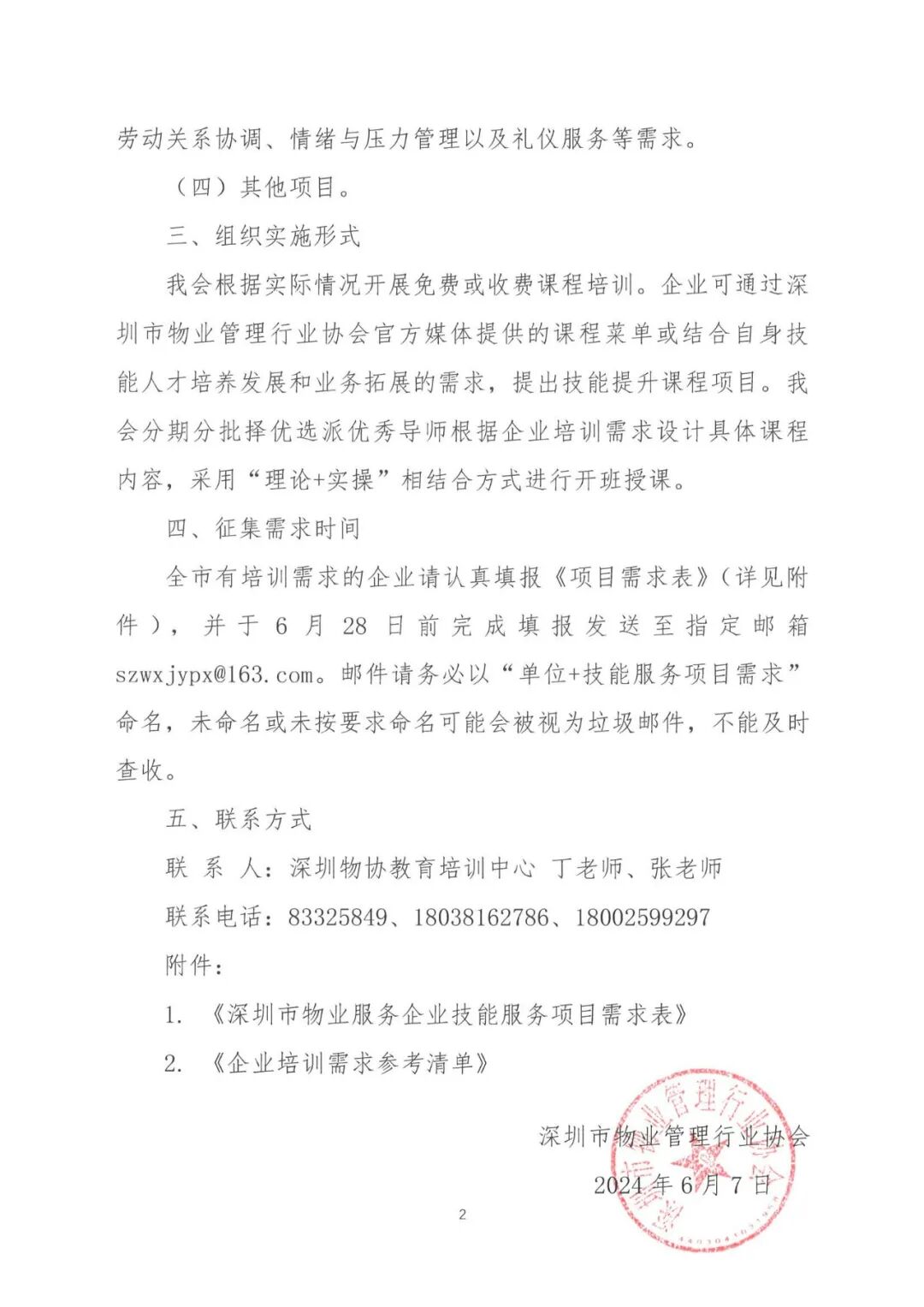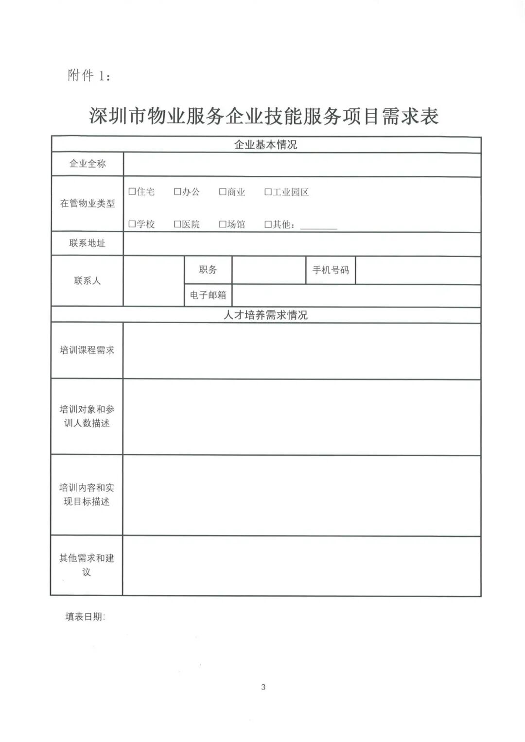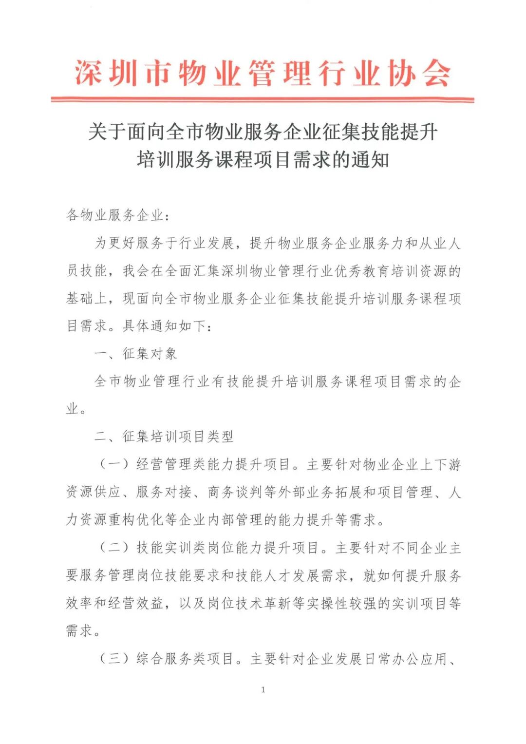 为更好服务于行业发展,提升物业服务企业服务力和从业人员技能,我会在全面汇集深圳物业管理行业优秀教育培训资源的基础上,现面向全市物业服务企业征集技能提升培训服务课程项目需求。具体通知如下: 全市物业管理行业有技能提升培训服务课程项目需求的企业。 (一)经营管理类能力提升项目。主要针对物业企业上下游资源供应、服务对接、商务谈判等外部业务拓展和项目管理、人力资源重构优化等企业内部管理的能力提升等需求。 (二)技能实训类岗位能力提升项目。主要针对不同企业主要服务管理岗位技能要求和技能人才发展需求,就如何提升服务效率和经营效益,以及岗位技术革新等实操性较强的实训项目等需求。 (三)综合服务类项目。主要针对企业发展日常办公应用、劳动关系协调、情绪与压力管理以及礼仪服务等需求。 我会根据实际情况开展免费或收费课程培训。企业可通过深圳市物业管理行业协会官方媒体提供的课程菜单或结合自身技能人才培养发展和业务拓展的需求,提出技能提升课程项目。我会分期分批择优选派优秀导师根据企业培训需求设计具体课程内容,采用“理论+实操”相结合方式进行开班授课。 全市有培训需求的企业请认真填报《项目需求表》(详见附件),并于6月28日前完成填报发送至指定邮箱szwxjypx@163.com。邮件请务必以“单位+技能服务项目需求”命名,未命名或未按要求命名可能会被视为垃圾邮件,不能及时查收。 联系电话:83325849、18038162786、18002599297通知原文如下: