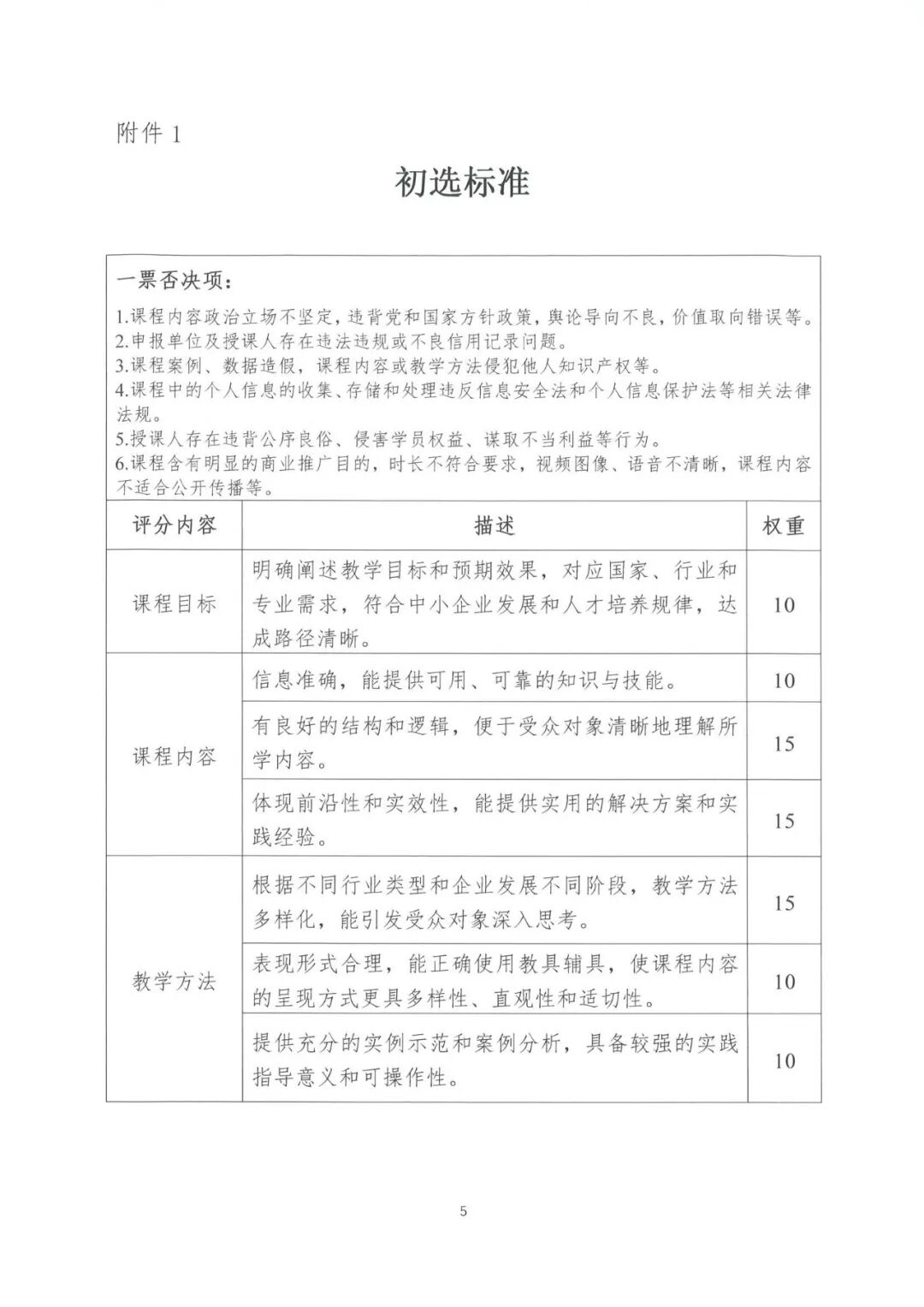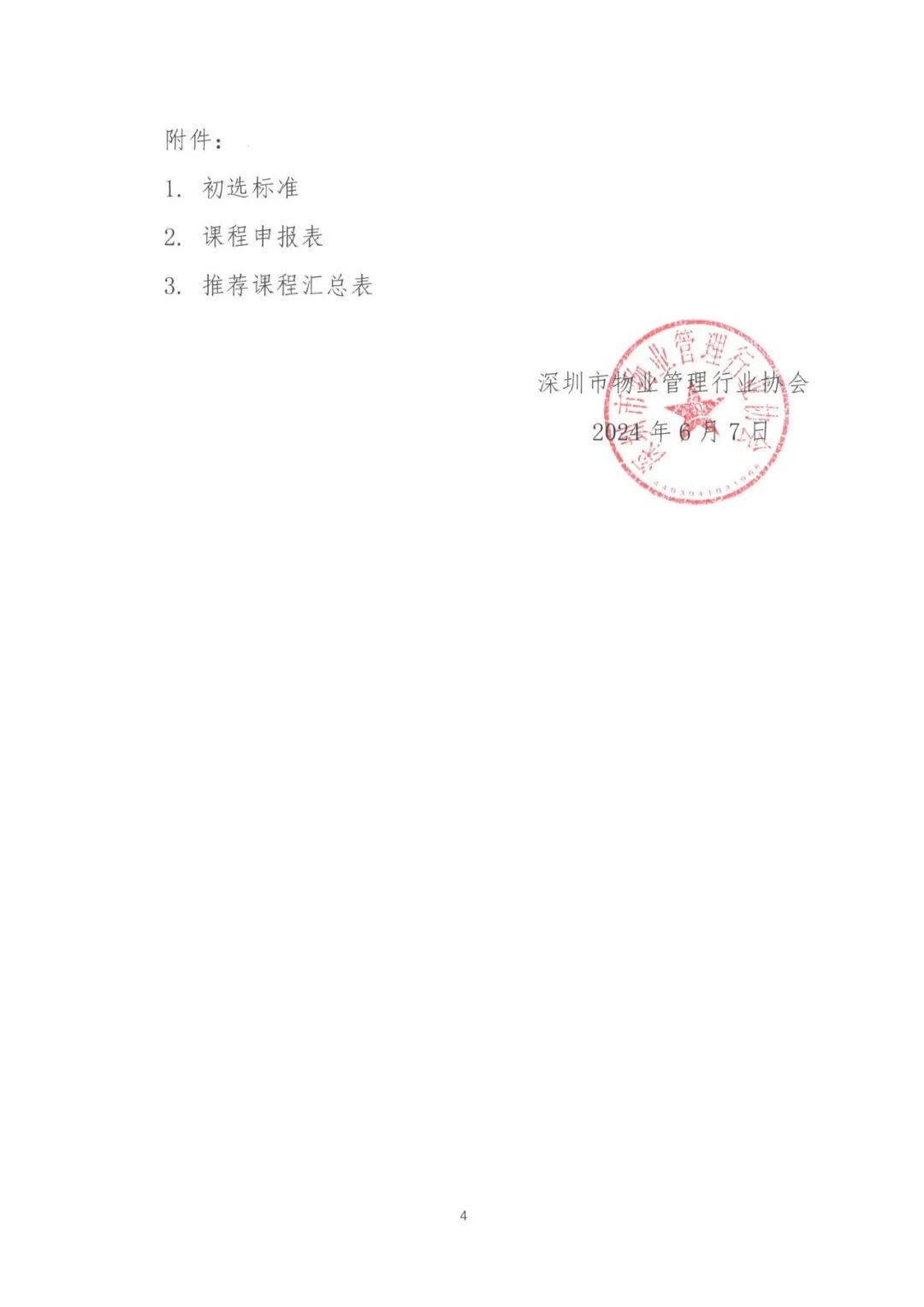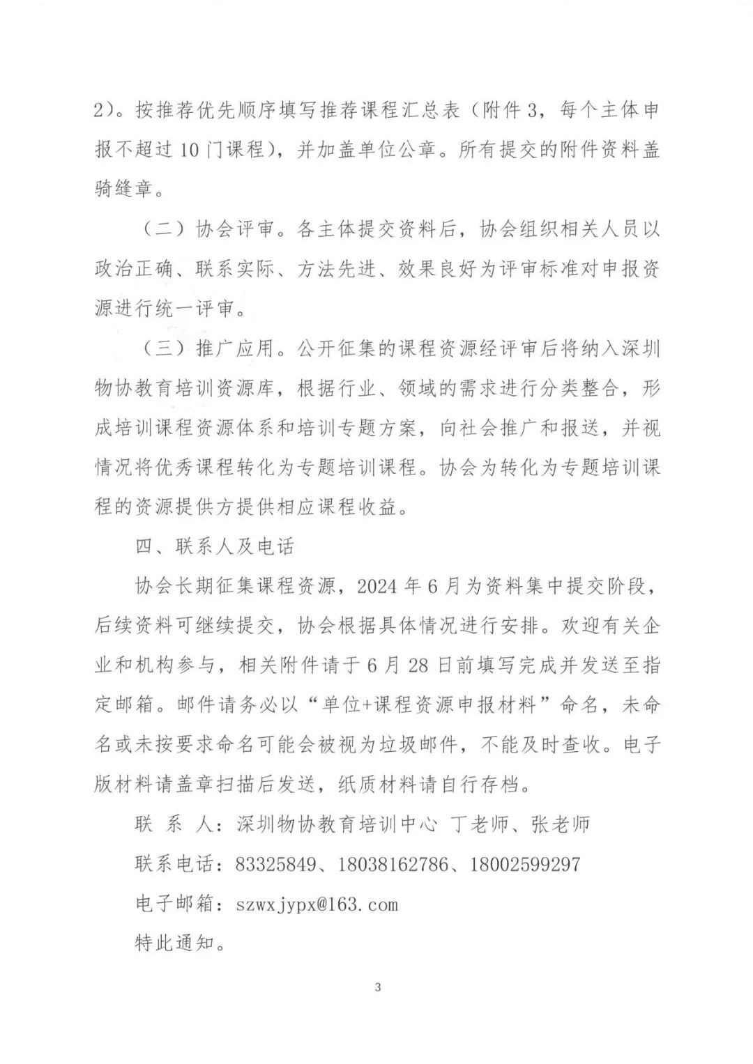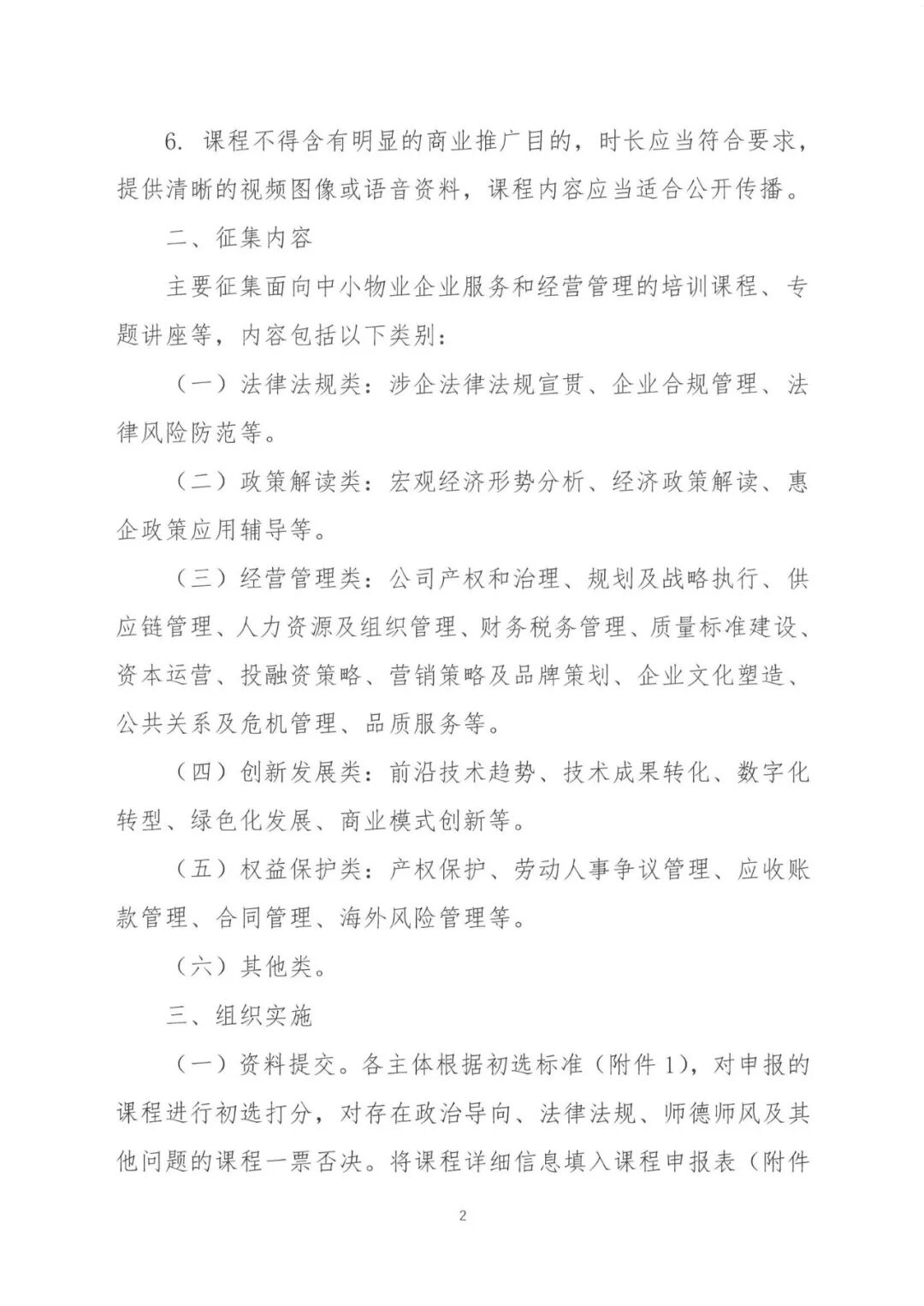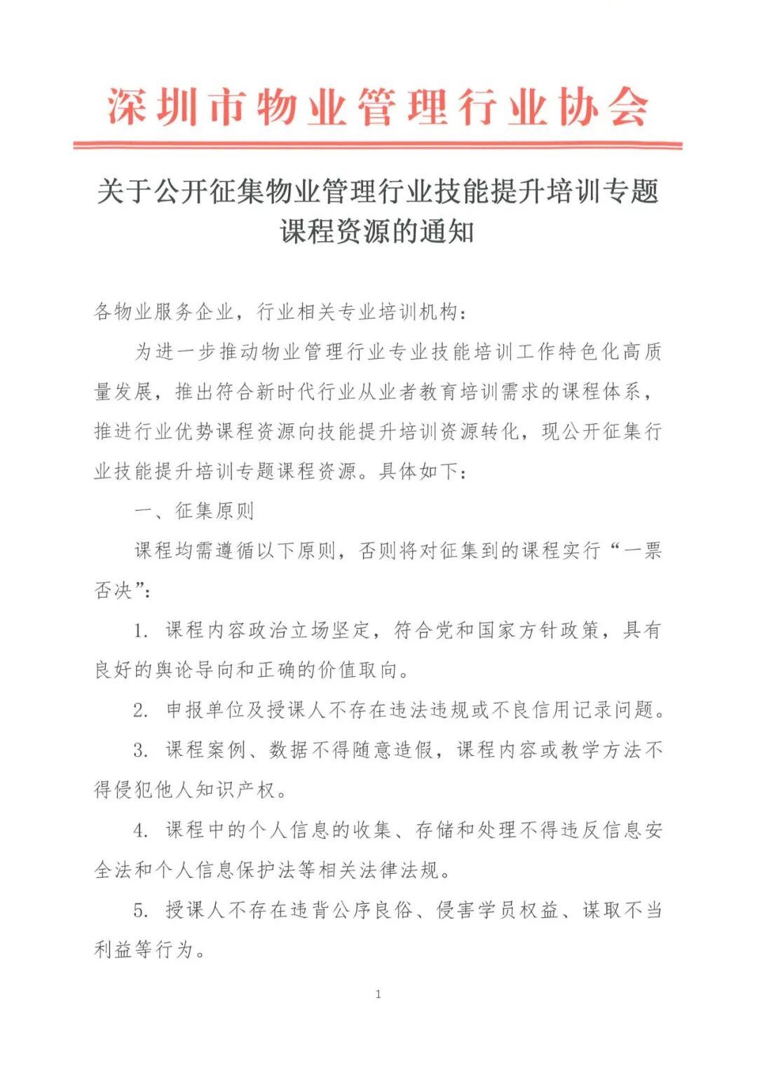 为进一步推动物业管理行业专业技能培训工作特色化高质量发展,推出符合新时代行业从业者教育培训需求的课程体系,推进行业优势课程资源向技能提升培训资源转化,现公开征集行业技能提升培训专题课程资源。具体如下: 课程均需遵循以下原则,否则将对征集到的课程实行“一票否决”: 1. 课程内容政治立场坚定,符合党和国家方针政策,具有良好的舆论导向和正确的价值取向。 2. 申报单位及授课人不存在违法违规或不良信用记录问题。 3. 课程案例、数据不得随意造假,课程内容或教学方法不得侵犯他人知识产权。 4. 课程中的个人信息的收集、存储和处理不得违反信息安全法和个人信息保护法等相关法律法规。 5. 授课人不存在违背公序良俗、侵害学员权益、谋取不当利益等行为。 6. 课程不得含有明显的商业推广目的,时长应当符合要求,提供清晰的视频图像或语音资料,课程内容应当适合公开传播。 主要征集面向中小物业企业服务和经营管理的培训课程、专题讲座等,内容包括以下类别: (一)法律法规类:涉企法律法规宣贯、企业合规管理、法律风险防范等。 (二)政策解读类:宏观经济形势分析、经济政策解读、惠企政策应用辅导等。 (三)经营管理类:公司产权和治理、规划及战略执行、供应链管理、人力资源及组织管理、财务税务管理、质量标准建设、资本运营、投融资策略、营销策略及品牌策划、企业文化塑造、公共关系及危机管理、品质服务等。 (四)创新发展类:前沿技术趋势、技术成果转化、数字化转型、绿色化发展、商业模式创新等。 (五)权益保护类:产权保护、劳动人事争议管理、应收账款管理、合同管理、海外风险管理等。 (一)资料提交。各主体根据初选标准(附件1),对申报的课程进行初选打分,对存在政治导向、法律法规、师德师风及其他问题的课程一票否决。将课程详细信息填入课程申报表(附件2)。按推荐优先顺序填写推荐课程汇总表(附件3,每个主体申报不超过10门课程),并加盖单位公章。所有提交的附件资料盖骑缝章。 (二)协会评审。各主体提交资料后,协会组织相关人员以政治正确、联系实际、方法先进、效果良好为评审标准对申报资源进行统一评审。 (三)推广应用。公开征集的课程资源经评审后将纳入深圳物协教育培训资源库,根据行业、领域的需求进行分类整合,形成培训课程资源体系和培训专题方案,向社会推广和报送,并视情况将优秀课程转化为专题培训课程。协会为转化为专题培训课程的资源提供方提供相应课程收益。 协会长期征集课程资源,2024年6月为资料集中提交阶段,后续资料可继续提交,协会根据具体情况进行安排。欢迎有关企业和机构参与,相关附件请于6月28日前填写完成并发送至指定邮箱。邮件请务必以“单位+课程资源申报材料”命名,未命名或未按要求命名可能会被视为垃圾邮件,不能及时查收。电子版材料请盖章扫描后发送,纸质材料请自行存档。 联系电话:83325849、18038162786、18002599297通知原文如下: