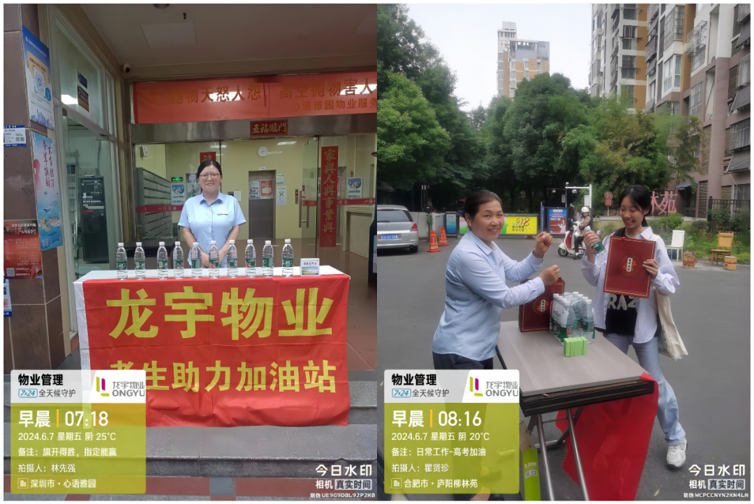金地智慧服务集团深圳区域公司所有在管住宅项目均张贴了静音备考提示。金海湾花园项目还精心拍摄短视频,项目经理和物业工作人员通过视频的形式,为全体考生加油鼓劲。在龙城服务在管的深云村小区,物业服务中心在管理处前台设立了高考加油站,免费为小区的高考学子提供考试文具、降暑饮品,考生有需要可凭准考证领取。