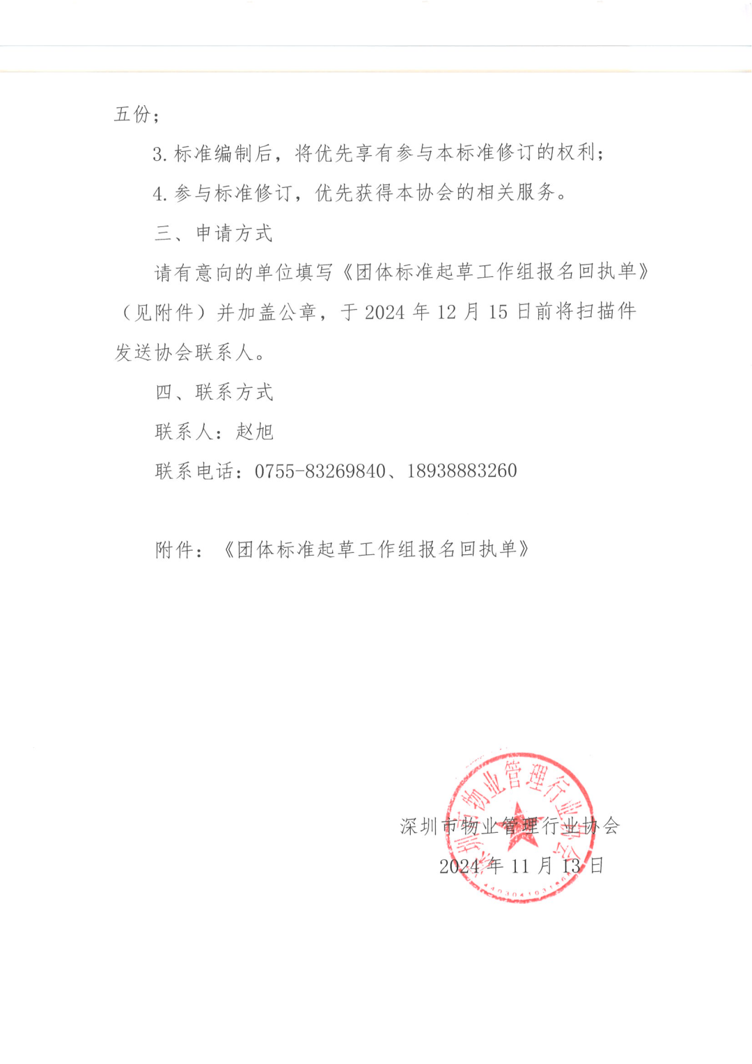请有意向的单位填写《团体标准起草工作组报名回执单》(见附件)并加盖公章,于2024年12月15日前将扫描件发送协会联系人。 联系电话:0755-83269840、18938883260 附件:《团体标准起草工作组报名回执单》(请点击“查看原文”下载)通知原文如下: