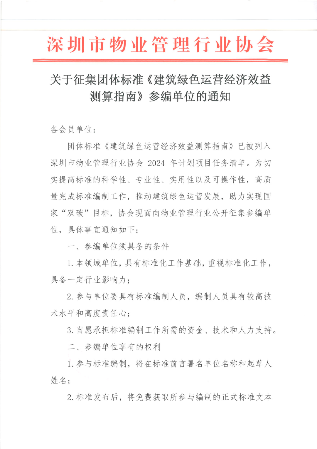 团体标准《建筑绿色运营经济效益测算指南》已被列入深圳市物业管理行业协会 2024