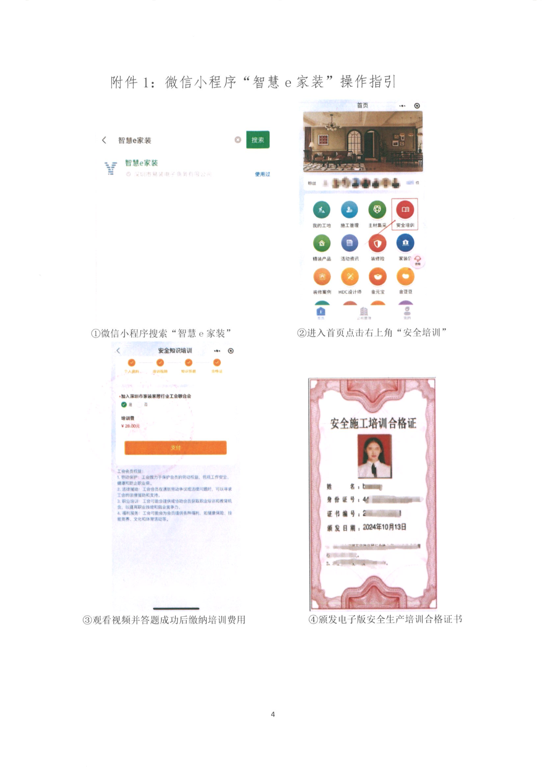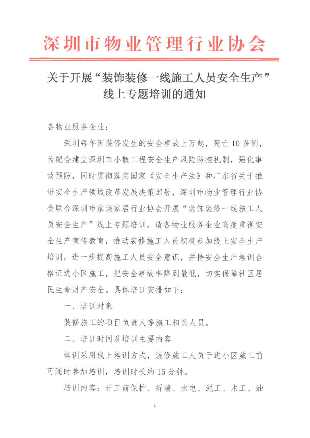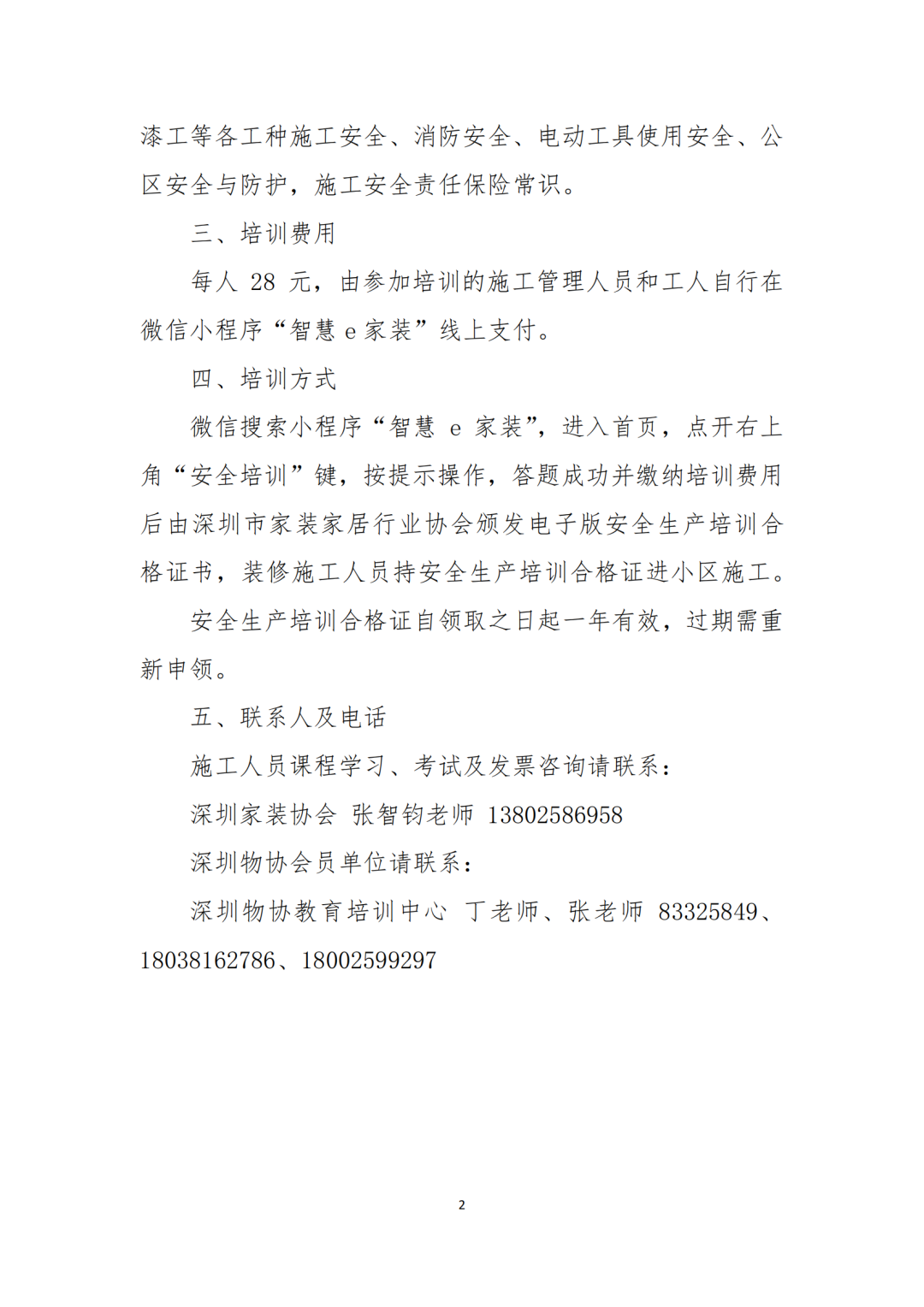 深圳每年因装修发生的安全事故上万起,死亡10多例,为配合建立深圳市小散工程安全生产风险防控机制,强化事故预防,同时贯彻落实国家《安全生产法》和广东省关于推进安全生产领域改革发展决策部署,深圳市物业管理行业协会联合深圳市家装家居行业协会开展“装饰装修一线施工人员安全生产”线上专题培训,请各物业服务企业高度重视安全生产宣传教育,推动装修施工人员积极参加线上安全生产培训,进一步提高施工人员安全意识,并持安全生产培训合格证进小区施工,把安全事故率降到最低,切实保障社区居民生命财产安全。具体培训安排如下: 培训采用线上培训方式,装修施工人员于进小区施工前可随时参加培训,培训时长约15分钟。 培训内容:开工前保护、拆墙、水电、泥工、木工、油漆工等各工种施工安全、消防安全、电动工具使用安全、公区安全与防护,施工安全责任保险常识。 每人28元,由参加培训的施工管理人员和工人自行在微信小程序“智慧e家装”线上支付。 微信搜索小程序“智慧e家装”,进入首页,点开右上角“安全培训”键,按提示操作,答题成功并缴纳培训费用后由深圳市家装家居行业协会颁发电子版安全生产培训合格证书,装修施工人员持安全生产培训合格证进小区施工。 安全生产培训合格证自领取之日起一年有效,过期需重新申领。 深圳物协教育培训中心 丁老师、张老师 83325849、18038162786、18002599297通知原文如下: