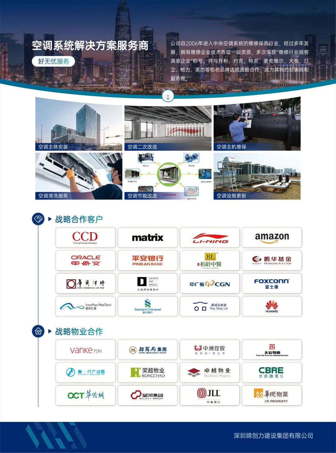 2006年,我从物业行业出来,成立了深圳市锦创力机电设备公司,开始了创业之路。2010年,锦创力率先提出“空调品牌化服务及设计、管理、安装、售后等专业化、全流程服务”,成为集建筑装饰设计施工、建筑消防设计施工、建筑空调机电设计施工、建筑楼宇智能化设计施工、空气净化工程、中央空调维修保养工程等为一体的综合性服务商。2017年,更名为深圳市锦创力建设集团有限公司。2021年获国家高新技术企业认证。