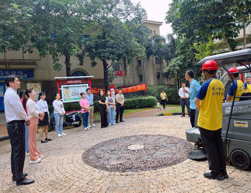 “睦邻空间”是龙岗街道以小区公共服务空间为载体,挖掘、打造的用于小区居民沟通交流、参与社区事务、文娱活动的友好空间,是社区工作站、社会组织党支部、业委会、志愿者队伍等多元主体积极参与,共同激活基层社会治理微细胞的高效举措。当“睦邻空间”遇上“长者服务站”,智慧生活平台的作用将得到了充分发挥。以“长者服务站”为据点,小区物业服务中心与社区“睦邻空间”相关服务深度结合,为小区居民带来更高效和创新的服务体验。特别是邻里矛盾的调解工作,在社区与物业、小区党员、业委会等多方资源的介入和协同下,小区基本可实现自治调解。千林山居万科物业管家专业经理卢元港介绍:“在以前,一些我们多次调解仍无法解决的邻里矛盾,会直接上报社区或警务室,但现在则不一样,我们可以在“睦邻空间”寻求小区内部资源支持,业委会、义工队与我们一起参与协调,大大提高了工作效率和调解成功率。”同时为了增强睦邻友好的氛围,提升小区“邻聚力”,后续物业服务中心将利用长者服务站,陆续开展茶话会、象棋交流赛、银发课堂等系列活动,并将联合社区及其他外部公益组织开展相关助老、普法等活动,让我们小区长者和居民的文娱活动更加丰富多彩。生活质量向好,居民更加注重小区的居住环境品质,然而天气瞬息万变,雨后泥沙侵袭、风吹落叶堆积、极端天气更是令园区遍地狼藉,人工清洁效率往往跟不上环境的变化……这类环境卫生难题如何改善?居住舒适度如何提高?带着疑惑,业主代表在千林山居万科物业绿化专业经理张慈燕的带领下,来到本次活动的保洁工作演示现场,亲身体会万科物业高效的保洁工作模式。
