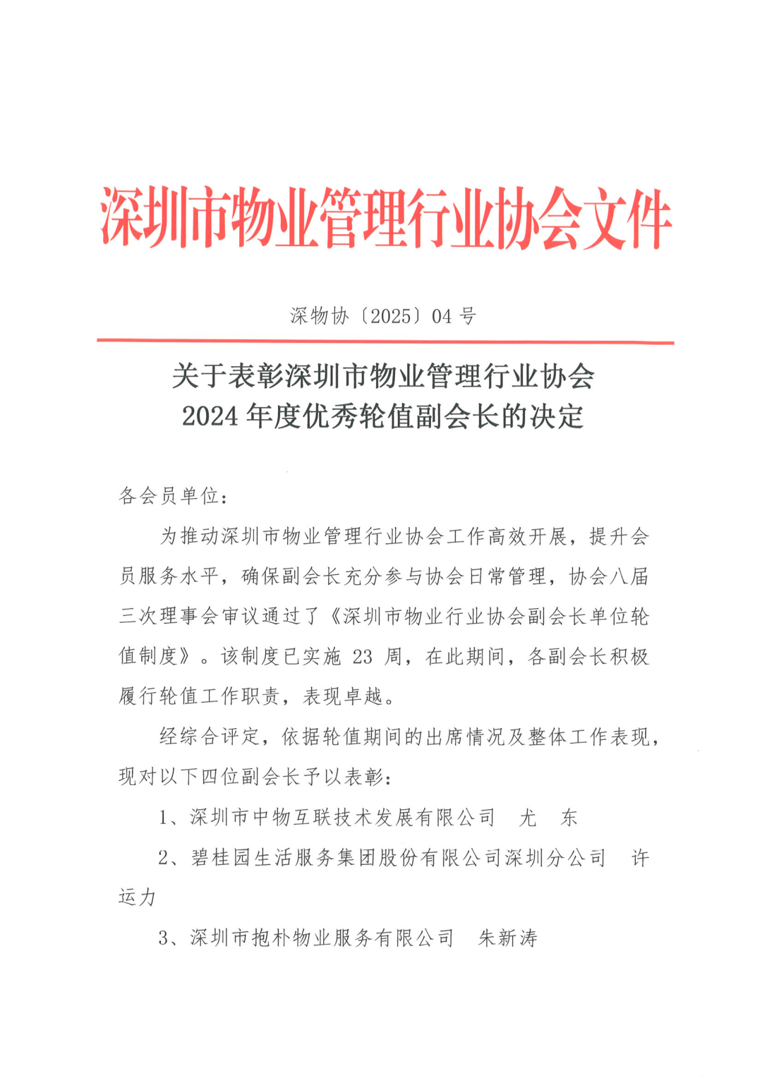 关于表彰深圳市物业管理行业协会2024年度优秀轮值副会长的决定