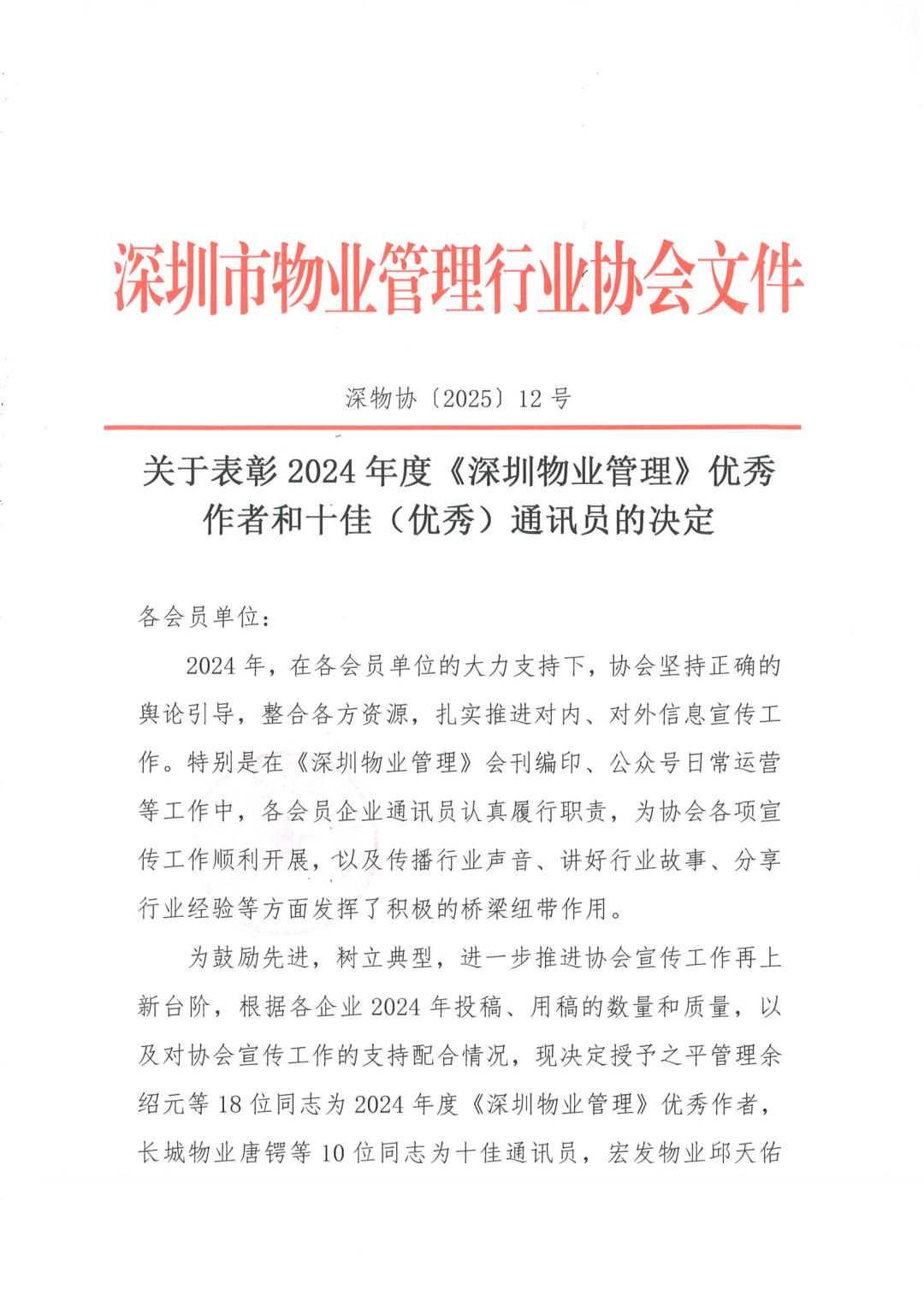 2024年,在各会员单位的大力支持下,协会坚持正确的舆论引导,整合各方资源,扎实推进对内、对外信息宣传工作。特别是在《深圳物业管理》会刊编印、公众号日常运营等工作中,各会员企业通讯员认真履行职责,为协会各项宣传工作顺利开展,以及传播行业声音、讲好行业故事、分享行业经验等方面发挥了积极的桥梁纽带作用。 为鼓励先进,树立典型,进一步推进协会宣传工作再上新台阶,根据各企业2024年投稿、用稿的数量和质量,以及对协会宣传工作的支持配合情况,现决定授予之平管理余绍元等18位同志为2024年度《深圳物业管理》优秀作者,长城物业唐锷等10位同志为十佳通讯员,宏发物业邱天佑等66位同志为优秀通讯员。 希望受表彰的个人珍惜荣誉,发扬成绩,再接再厉,继续发挥模范带头作用,为宣传好深圳物业管理行业做出更大贡献! 附件:2024年度《深圳物业管理》优秀作者和十佳(优秀)通讯员名单