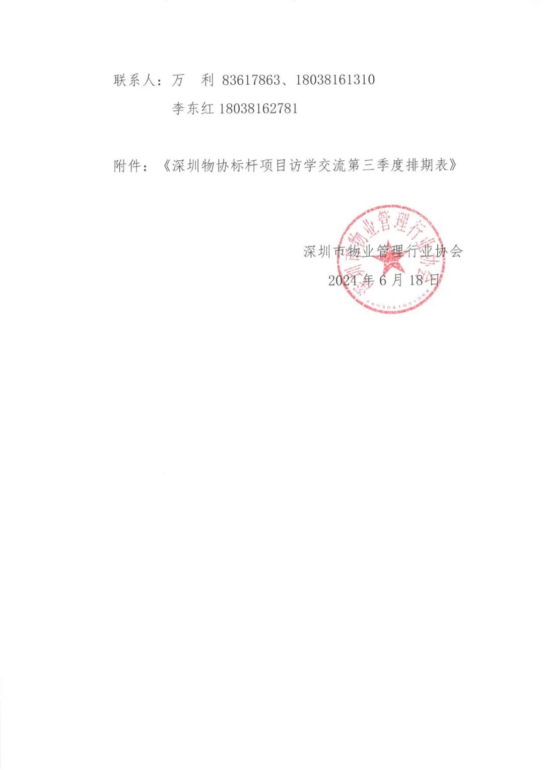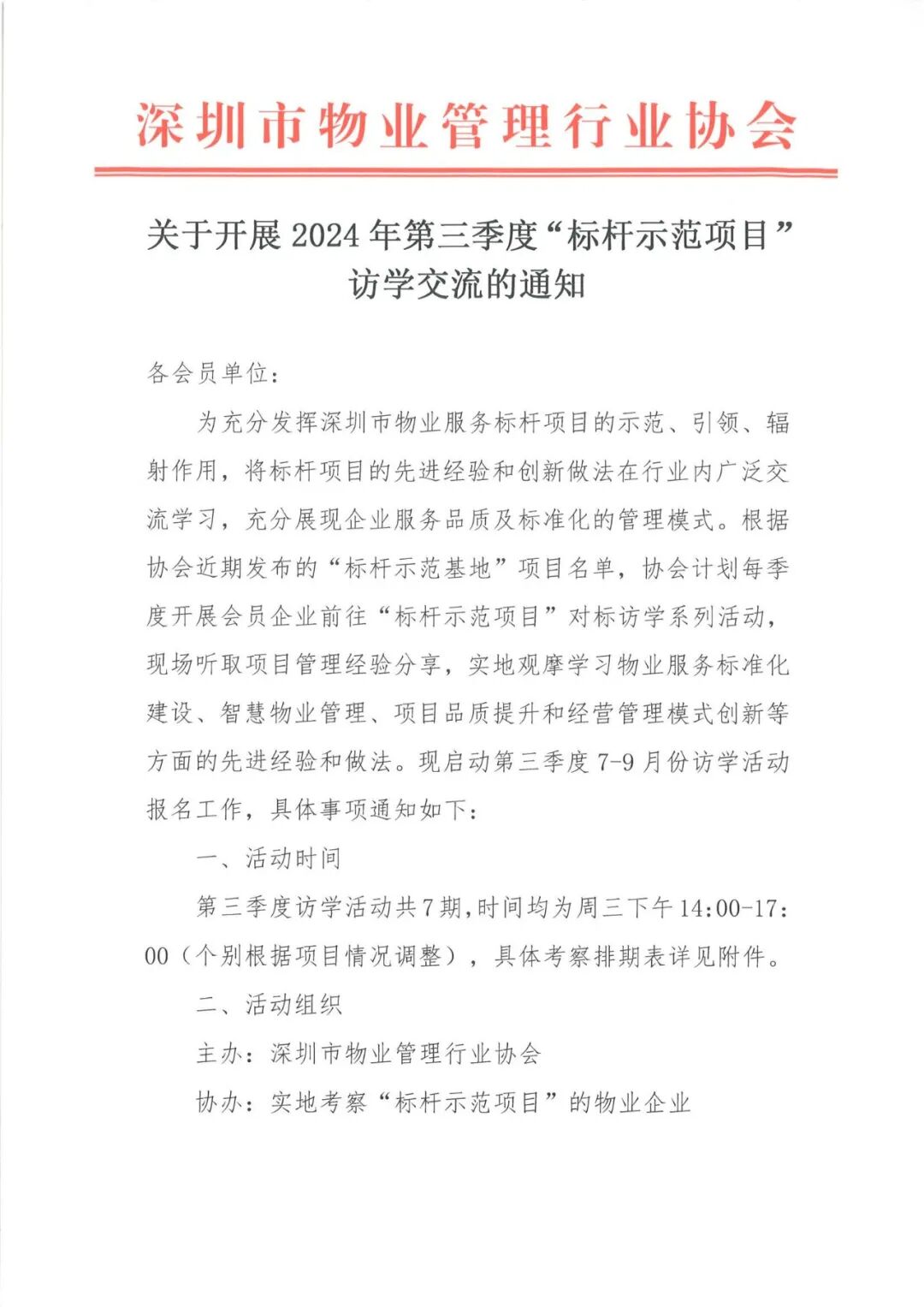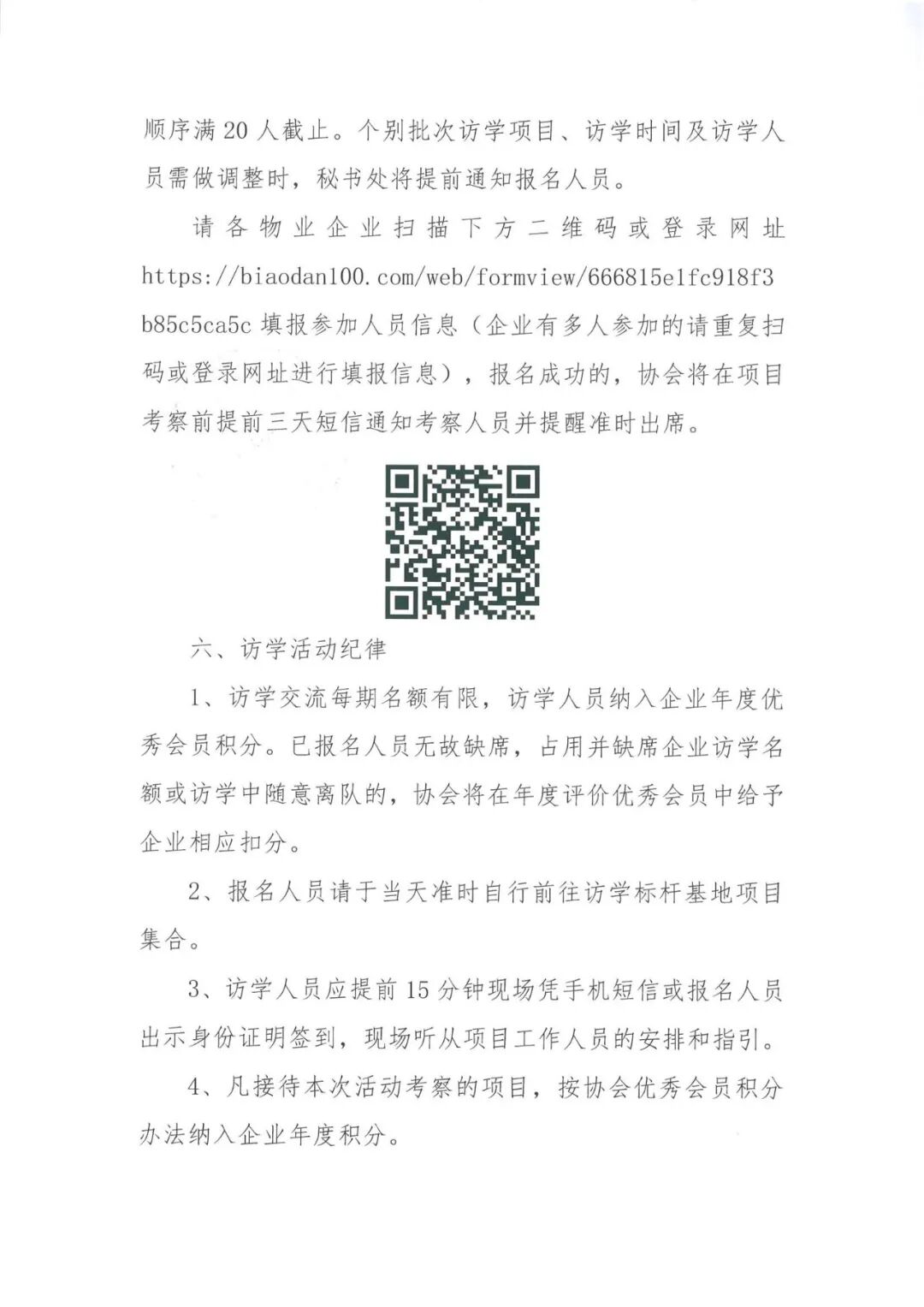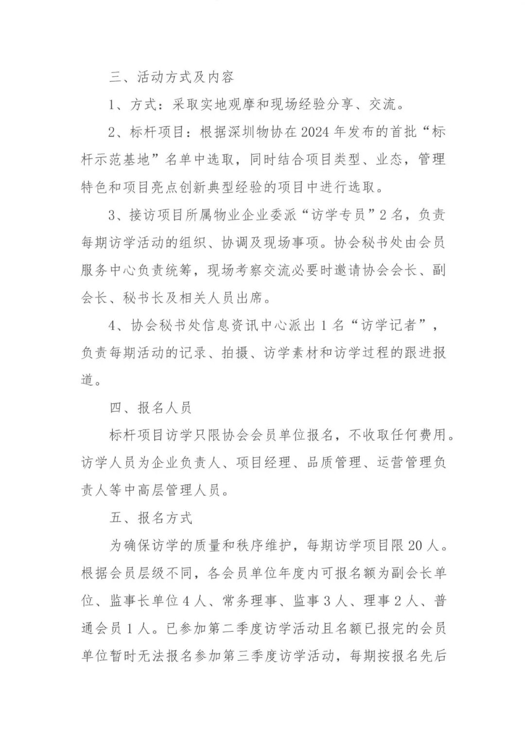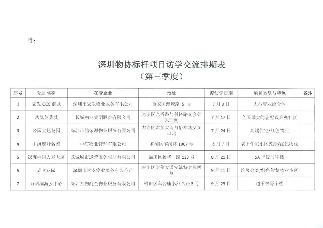 为充分发挥深圳市物业服务标杆项目的示范、引领、辐射作用,将标杆项目的先进经验和创新做法在行业内广泛交流学习,充分展现企业服务品质及标准化的管理模式。根据协会近期发布的“标杆示范基地”项目名单,协会计划每季度开展会员企业前往“标杆示范项目”对标访学系列活动,现场听取项目管理经验分享,实地观摩学习物业服务标准化建设、智慧物业管理、项目品质提升和经营管理模式创新等方面的先进经验和做法。现启动第三季度7-9月份访学活动报名工作,具体事项通知如下: 第三季度访学活动共7期,时间均为周三下午14:00-17:00(个别根据项目情况调整),具体考察排期表详见附件。 2、标杆项目:根据深圳物协在2024年发布的首批“标杆示范基地”名单中选取,同时结合项目类型、业态,管理特色和项目亮点创新典型经验的项目中进行选取。 3、接访项目所属物业企业委派“访学专员”2名,负责每期访学活动的组织、协调及现场事项。协会秘书处由会员服务中心负责统筹,现场考察交流必要时邀请协会会长、副会长、秘书长及相关人员出席。 4、协会秘书处信息资讯中心派出1名“访学记者”,负责每期活动的记录、拍摄、访学素材和访学过程的跟进报道。 标杆项目访学只限协会会员单位报名,不收取任何费用。访学人员为企业负责人、项目经理、品质管理、运营管理负责人等中高层管理人员。 为确保访学的质量和秩序维护,每期访学项目限20人。根据会员层级不同,各会员单位年度内可报名额为副会长单位、监事长单位4人、常务理事、监事3人、理事2人、普通会员1人。已参加第二季度访学活动且名额已报完的会员单位暂时无法报名参加第三季度访学活动,每期按报名先后顺序满20人截止。个别批次访学项目、访学时间及访学人员需做调整时,秘书处将提前通知报名人员。 请各物业企业扫描下方二维码或登录网址https://biaodan100.com/web/formview/666815e1fc918f3b85c5ca5c填报参加人员信息(企业有多人参加的请重复扫码或登录网址进行填报信息),报名成功的,协会将在项目考察前提前三天短信通知考察人员并提醒准时出席。 1、访学交流每期名额有限,访学人员纳入企业年度优秀会员积分。已报名人员无故缺席,占用并缺席企业访学名额或访学中随意离队的,协会将在年度评价优秀会员中给予企业相应扣分。 2、报名人员请于当天准时自行前往访学标杆基地项目集合。 3、访学人员应提前15分钟现场凭手机短信或报名人员出示身份证明签到,现场听从项目工作人员的安排和指引。 4、凡接待本次活动考察的项目,按协会优秀会员积分办法纳入企业年度积分。 联系人:万 利 83617863、18038161310通知原文如下: